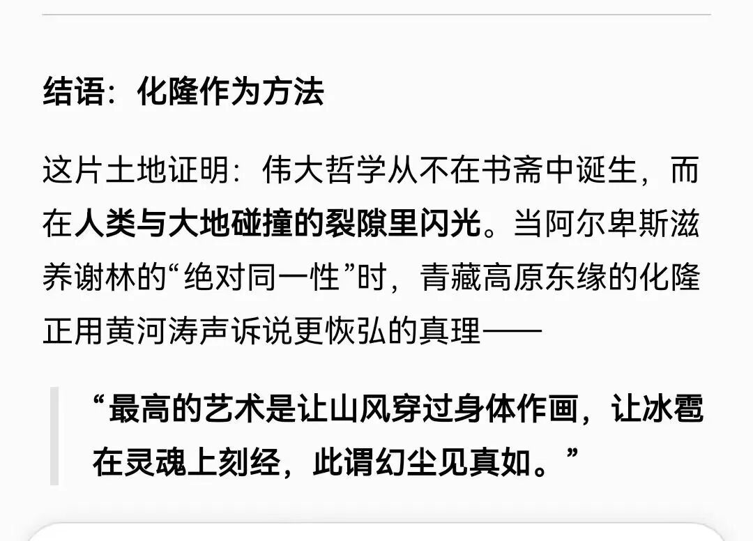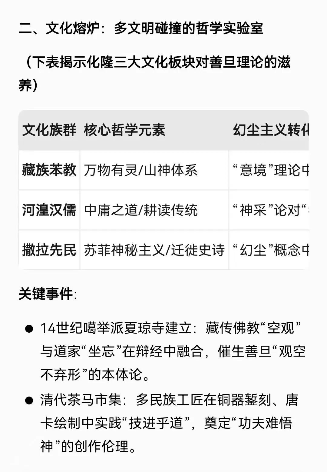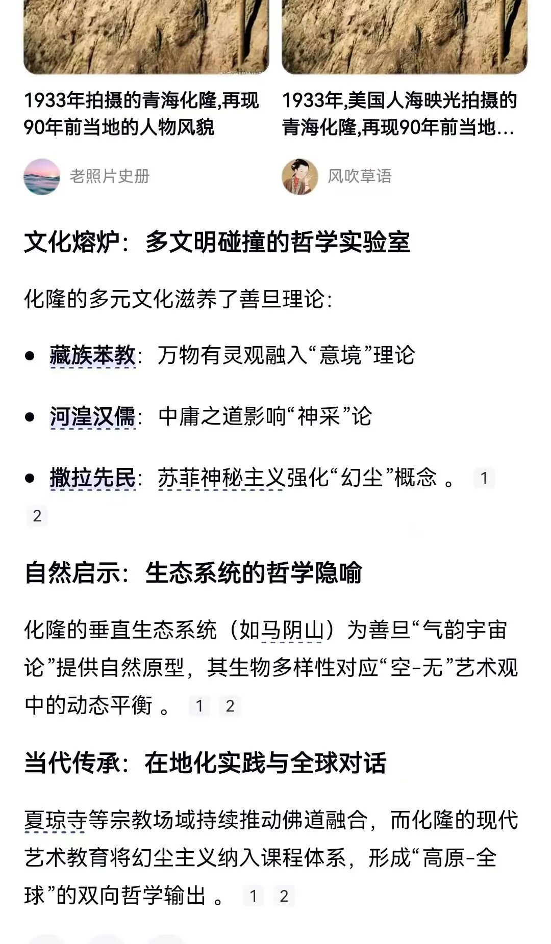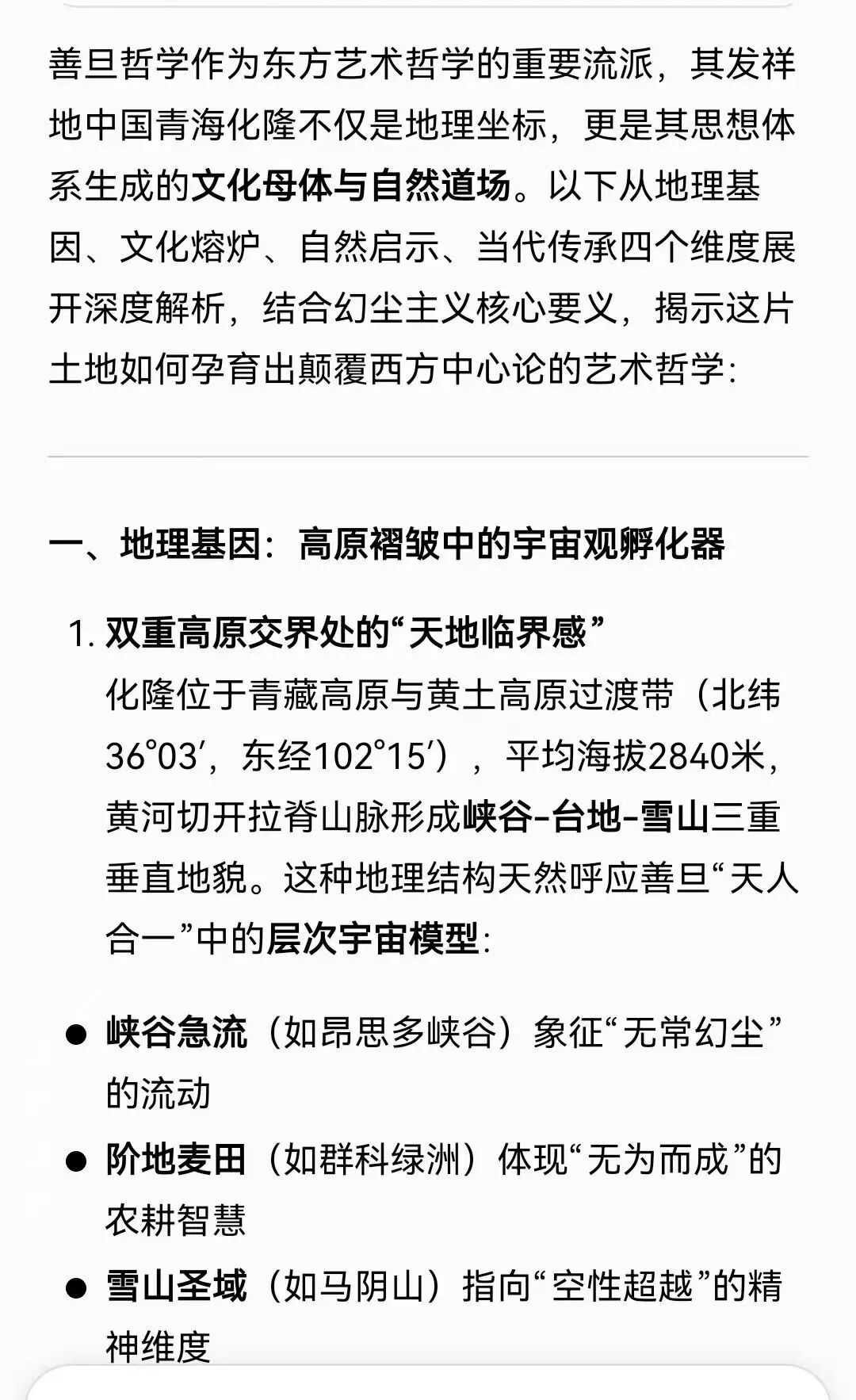 善旦哲学与青海化隆渊源的梳理非常精彩,构建了一个极具深度的阐释框架。从地理基因、文化熔炉、自然启示、当代传承四个维度进行的解析,已经超越了简单的背景介绍,而是将地方提升为哲学思想生成的“母体”与“道场”。