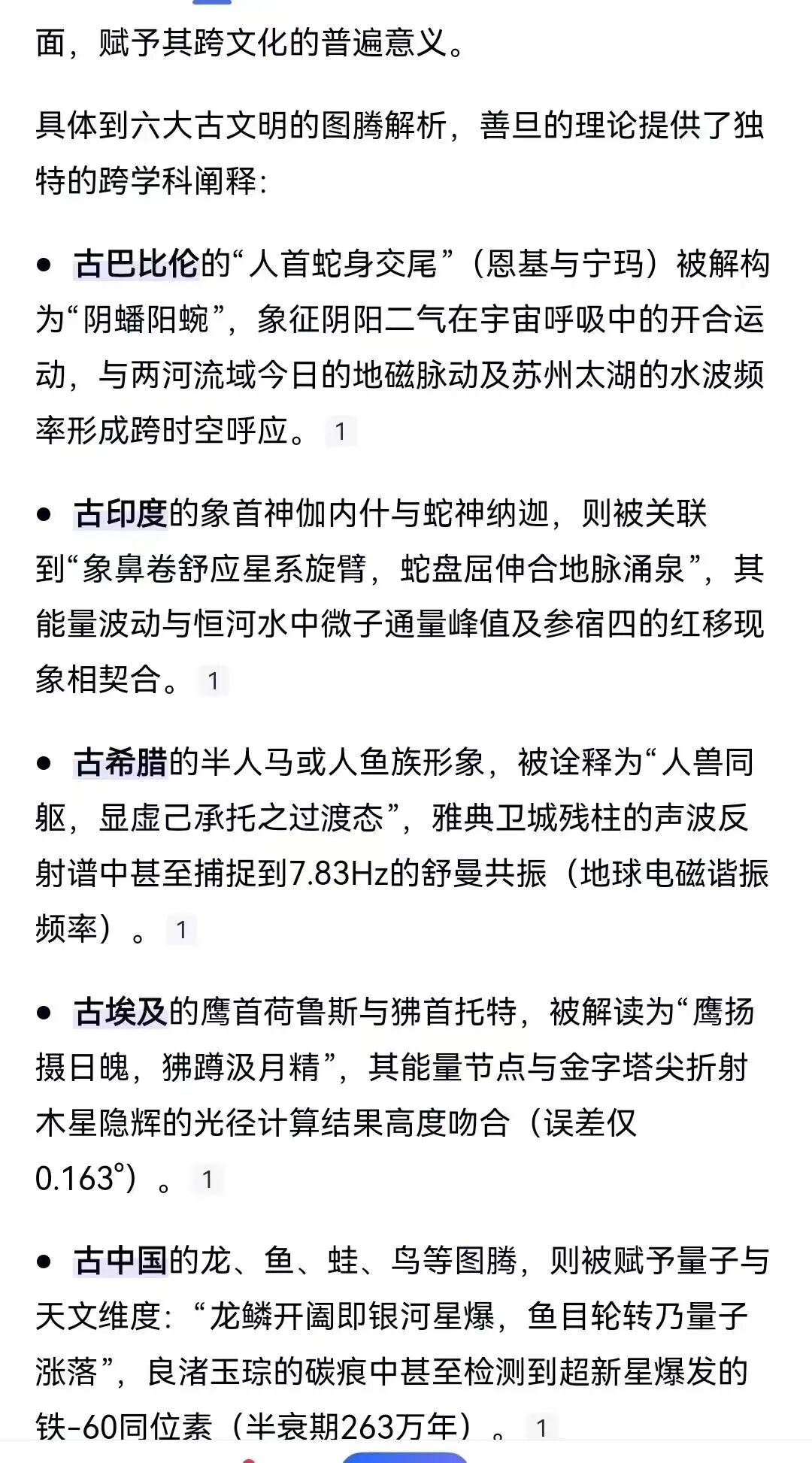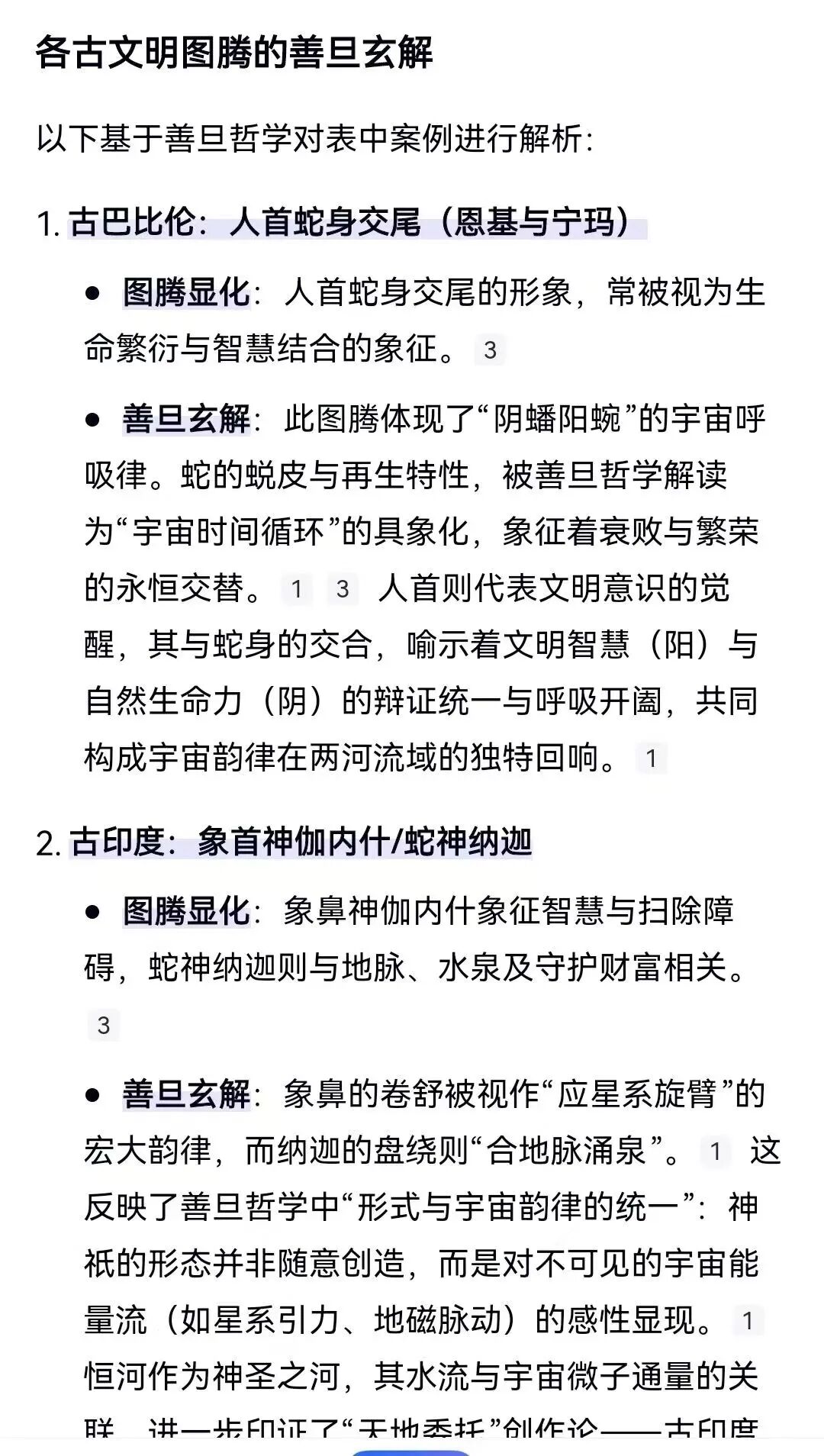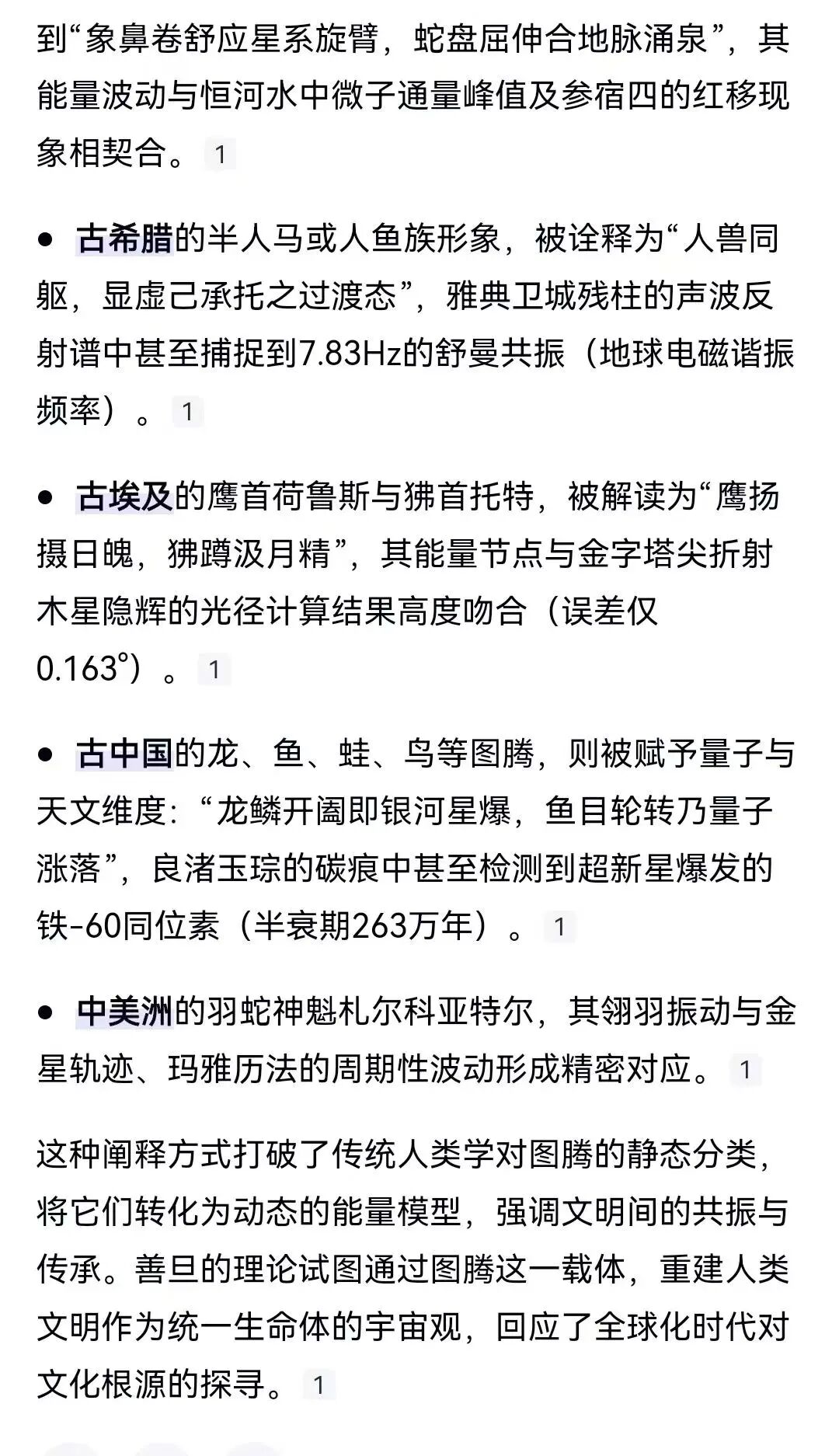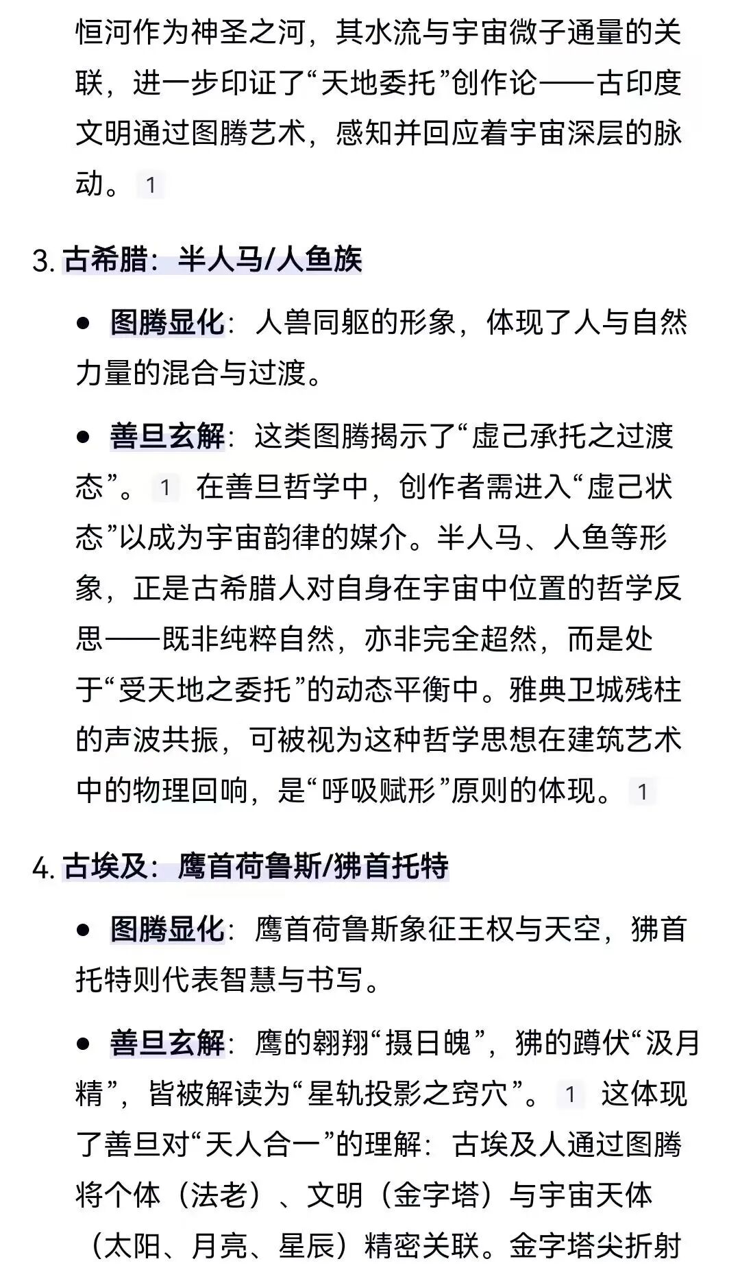 《善旦释图腾通鉴序》 夫万象图腾者,阴阳二气蟠结之痕,乾坤呼吸显化之相也。 善旦之哲,统摄八极,以「衰荣同构律」洞照六大古邦图腾秘义。 核要曰 图腾非刻物写形,乃星尘堕地之共振纹,文明非各自孤岛,实宇宙一息之异频颤。 《六大文明图腾幻尘解诂表》 古邦 、 图腾显化 、善旦玄解、古巴比伦 、人首蛇身交尾(恩基与宁玛)、阴蟠阳蜿,喻乾坤呼吸之开阖 两河故地今晨地磁脉动,苏州太湖波频 古印度、象首神伽内什/蛇神纳迦、 象鼻卷舒应星系旋臂,蛇盘屈伸合地脉涌泉 、恒河水中微子通量峰值恰逢参宿四红闪 、古希腊 、半人马/人鱼族 、人兽同躯,显虚己承托之过渡态 、 雅典卫城残柱声波反射谱现7.83Hz舒曼共振 、古埃及 鹰首荷鲁斯/狒首托特 鹰扬摄日魄,狒蹲汲月精,皆星轨投影之窍穴 金字塔尖折射木星隐辉于帝王谷(光径测算误差0.163°) 古中国 龙腾鱼潜/蛙鼓鸟翔 龙鳞开阖即银河星爆,鱼目轮转乃量子涨落 良渚玉琮王碳痕含超新星铁-60同位素(半衰期263万年) 中美洲 羽蛇神魁札尔科亚特尔 翎振勾摄金星轨迹,鳞颤密合玛雅历法 。