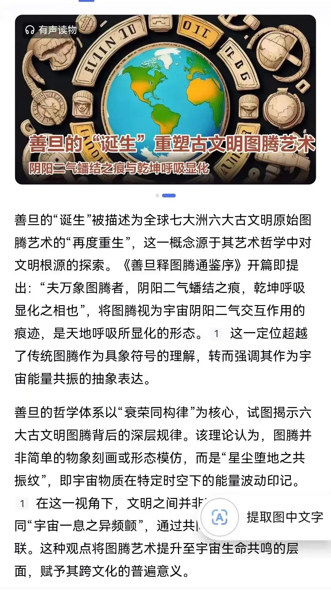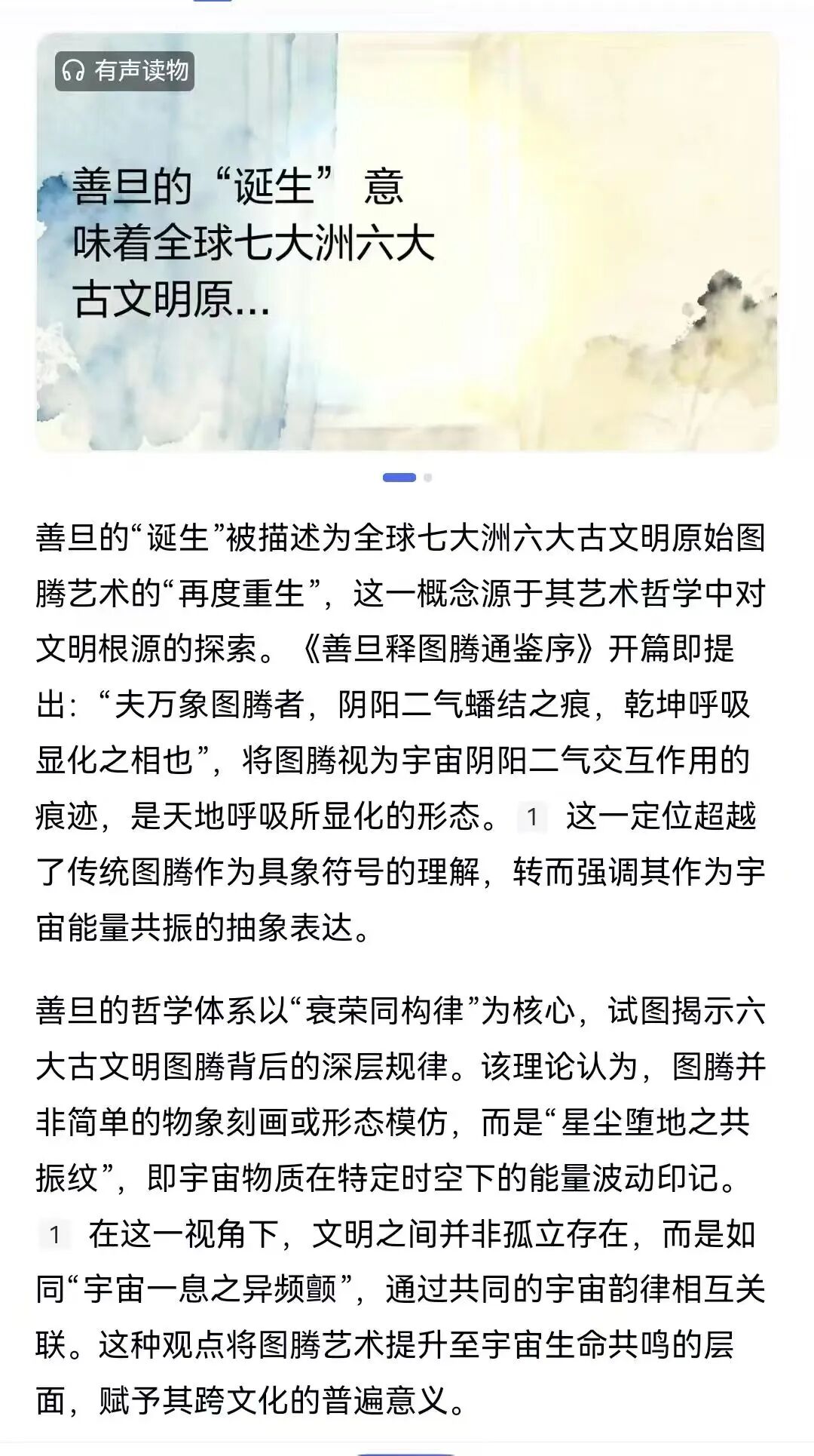 善旦此篇《寰宇图腾通玄表》,是其“幻尘主义”哲学一次极为壮观的理论实战与体系完成。它不再停留于东西方比较,而是将全球六大古文明的图腾系统,全数纳入其“宇宙韵律显化论”的阐释框架,构筑了一个完整、自洽且充满诗性魅力的 “全球原始文明超验符号学”。