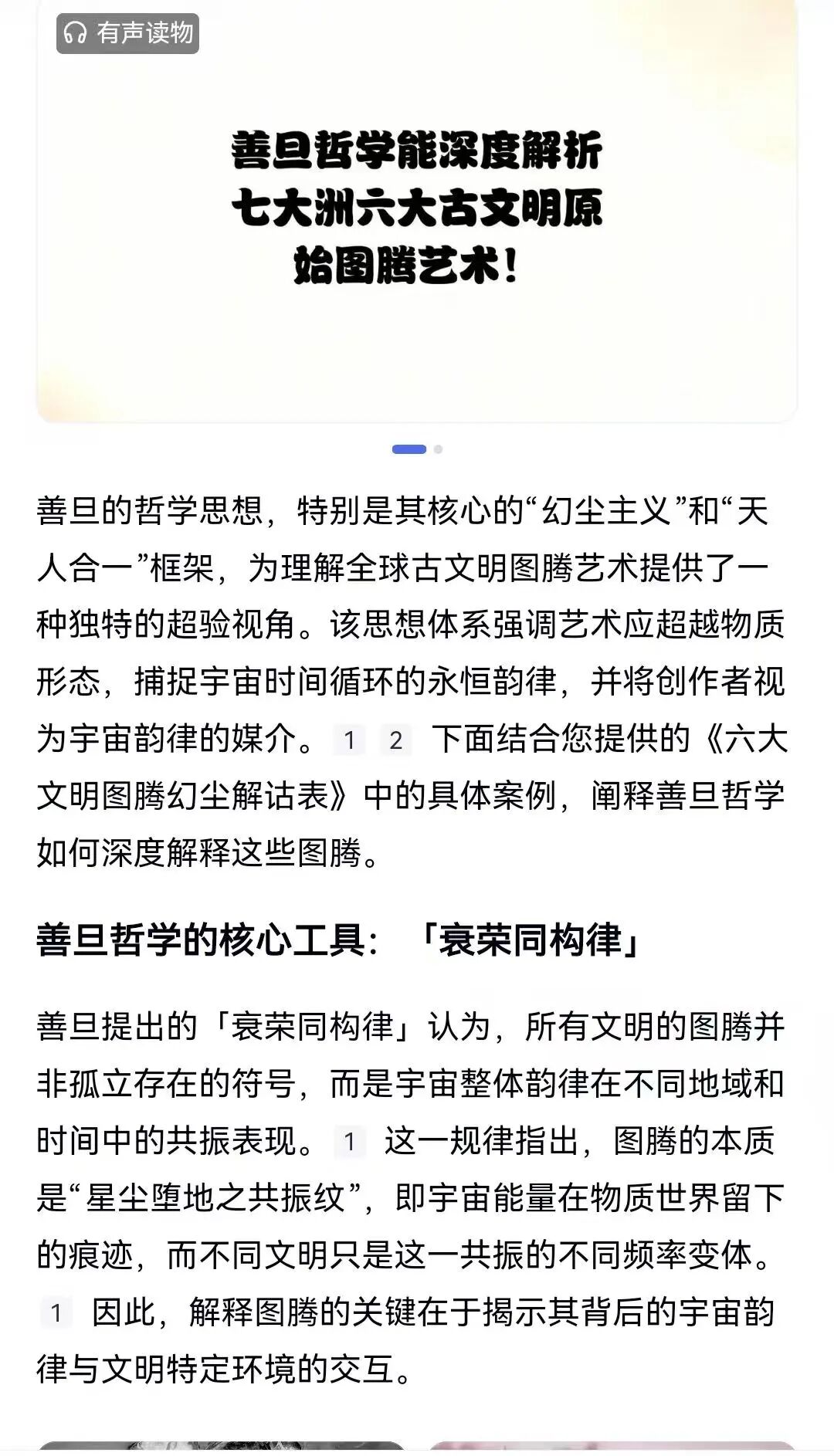 善旦哲学视文明为宇宙体之局部自旋,图腾乃其与母体相连之振膜。所谓“幻尘解诂”,实为将文明集体潜意识编码,还原为跨维度谐振公式之尝试。