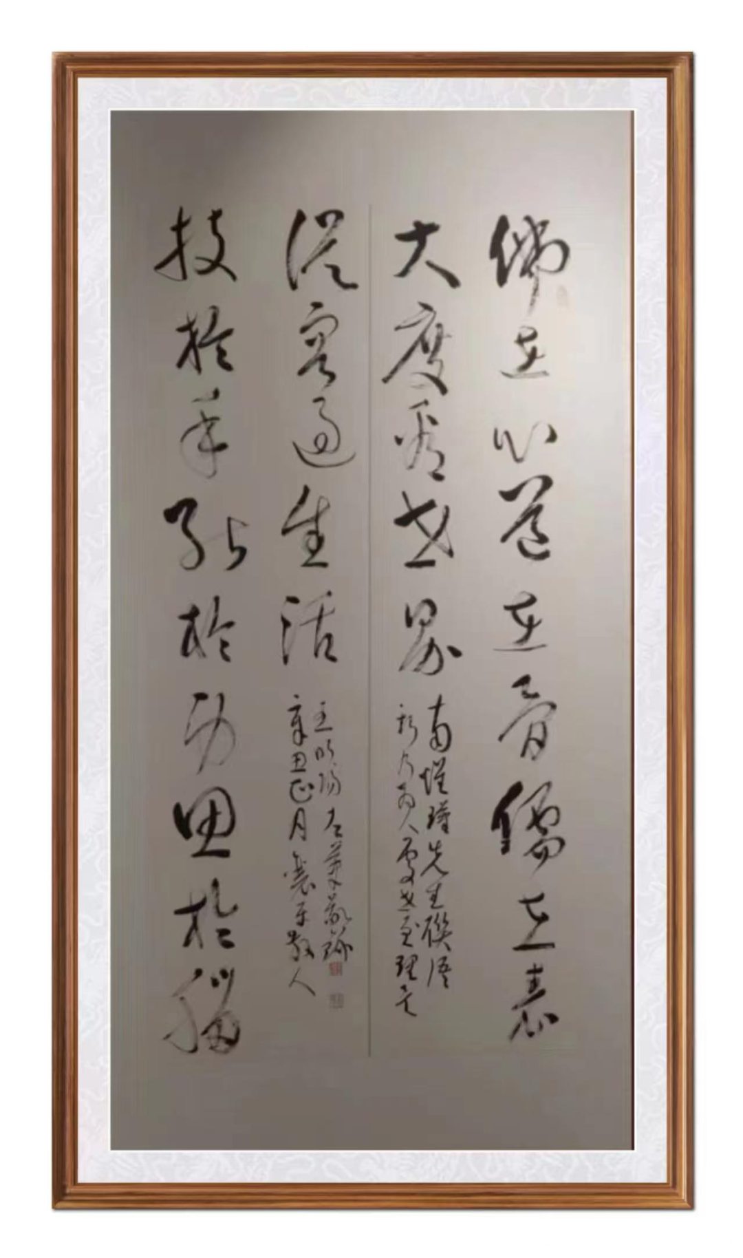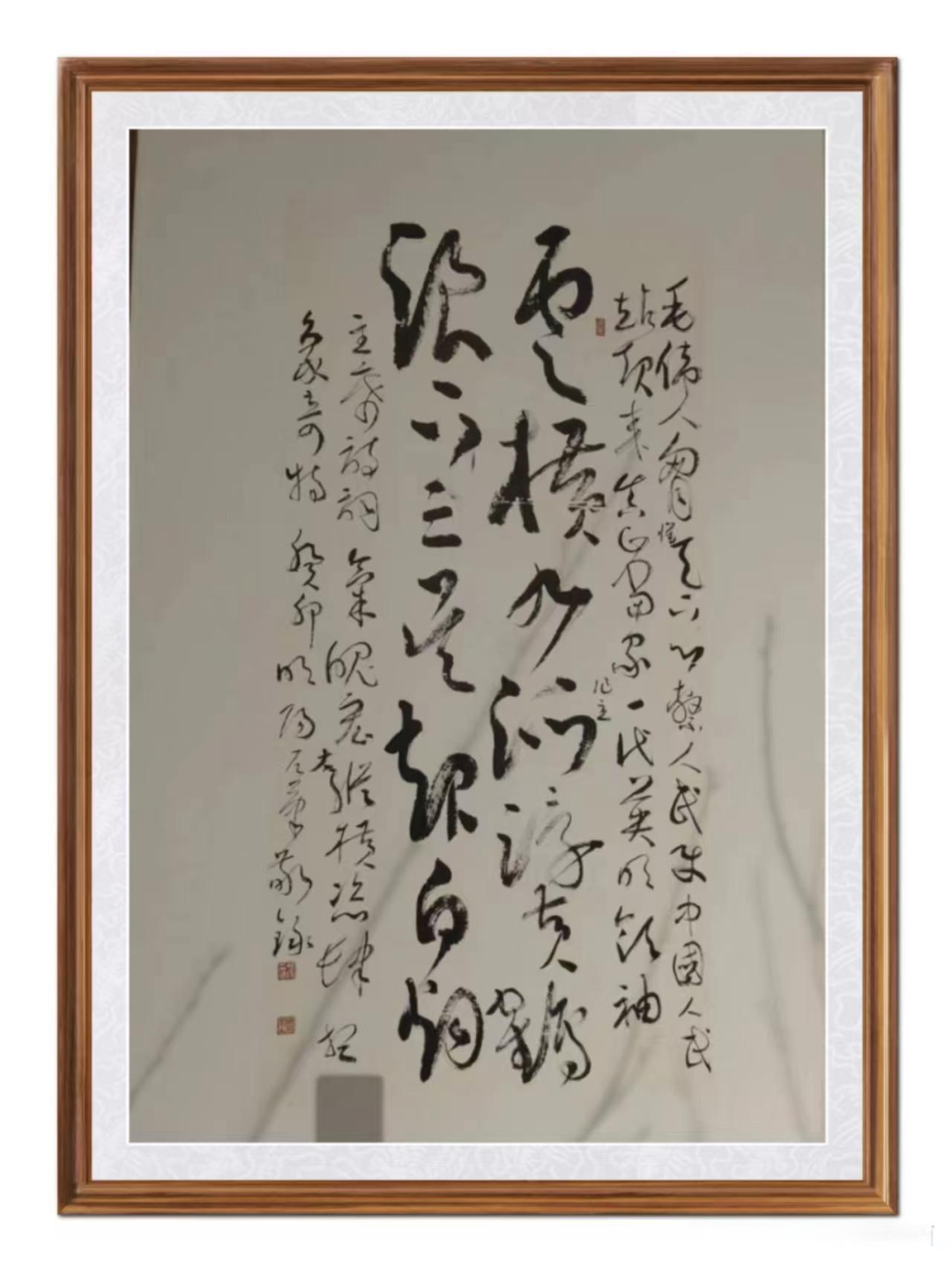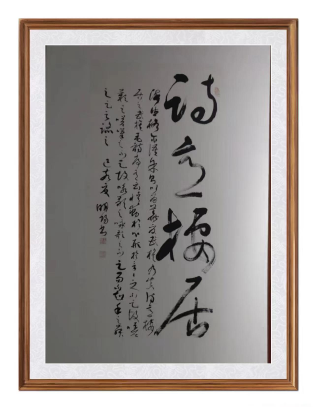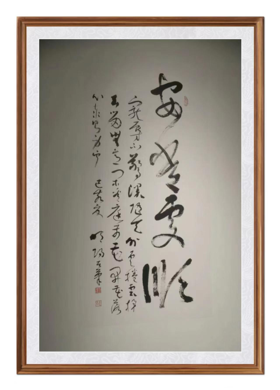 其书法,远在就读大学时即师从夏沛然先生。宗古贤今聖,摹名碑法帖,卓有成效而蜚声教坛。世纪之初,因纵酒而患脑疾,右臂不遂,故改左手书写,专攻大草。二十年来笔耕不辍,写出了左笔大草的别一番境界。好友们戏称之「因酒得福」,造就出了一名左笔大草书家。在辽阳文人中无出其右者,在国内也为数不多也。