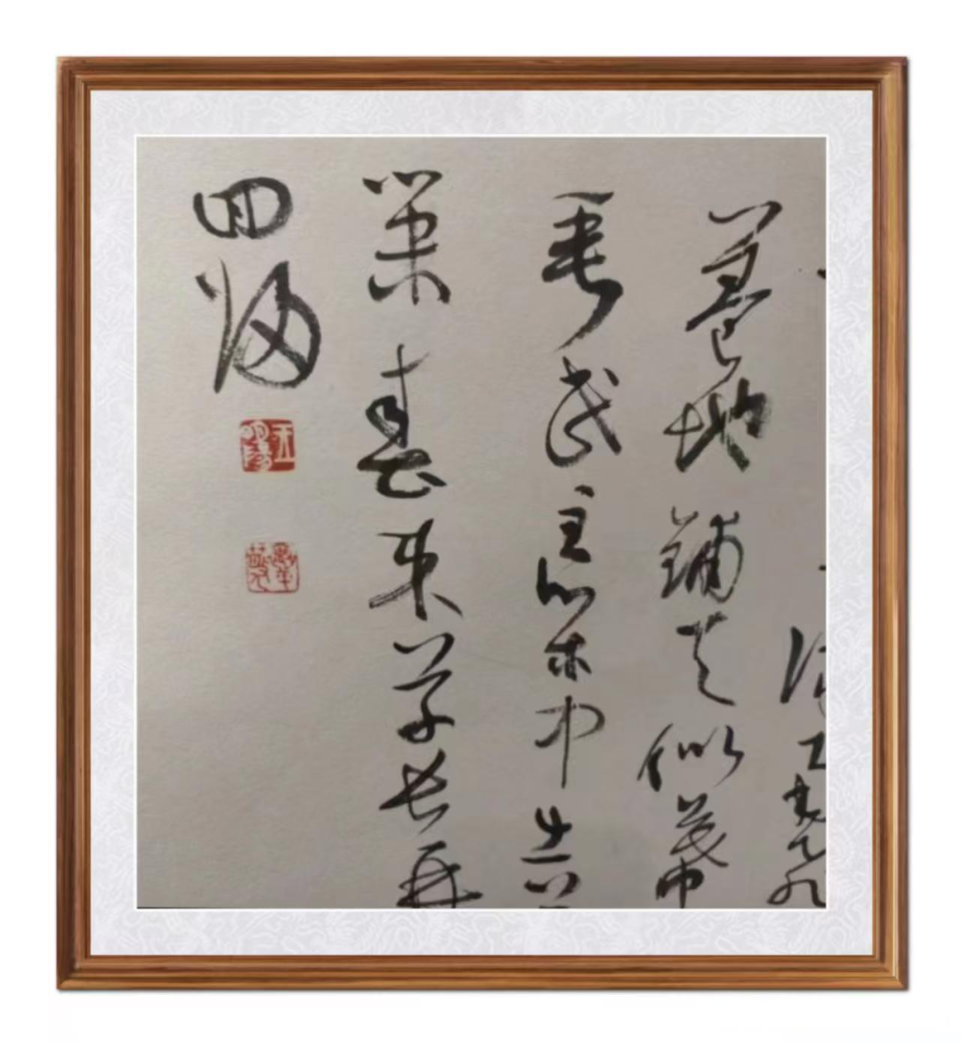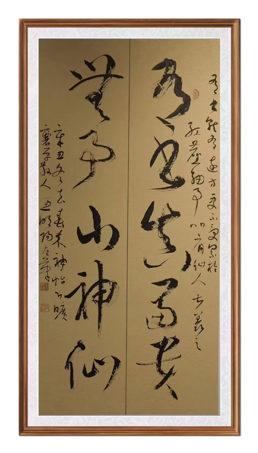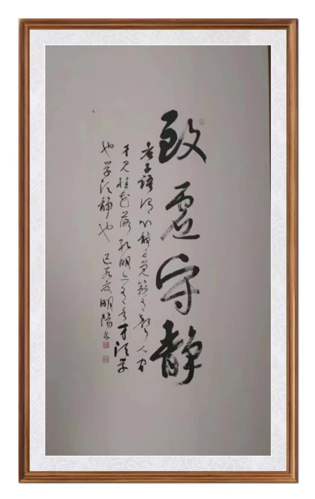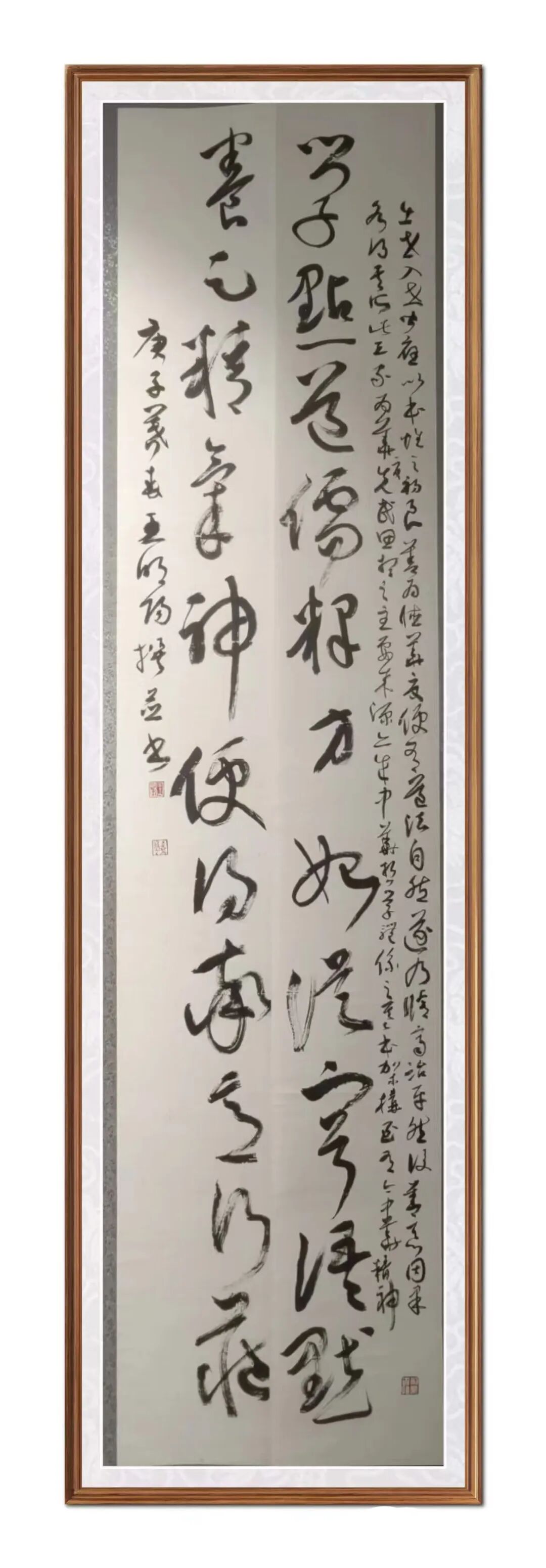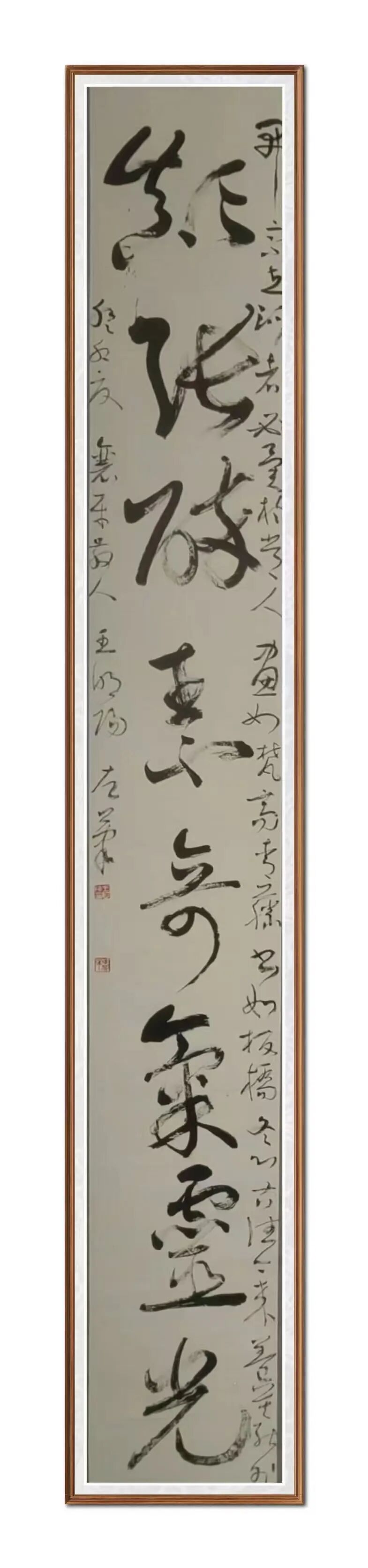 其书法,远在就读大学时即师从夏沛然先生。宗古贤今聖,摹名碑法帖,卓有成效而蜚声教坛。世纪之初,因纵酒而患脑疾,右臂不遂,故改左手书写,专攻大草。二十年来笔耕不辍,写出了左笔大草的别一番境界。好友们戏称之「因酒得福」,造就出了一名左笔大草书家。在辽阳文人中无出其右者,在国内也为数不多也。