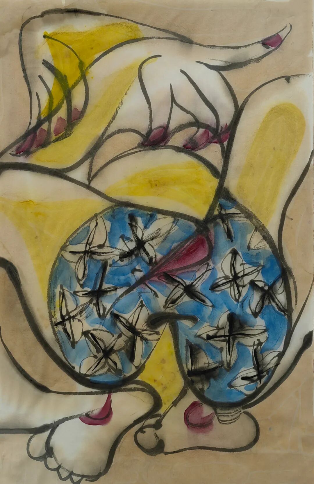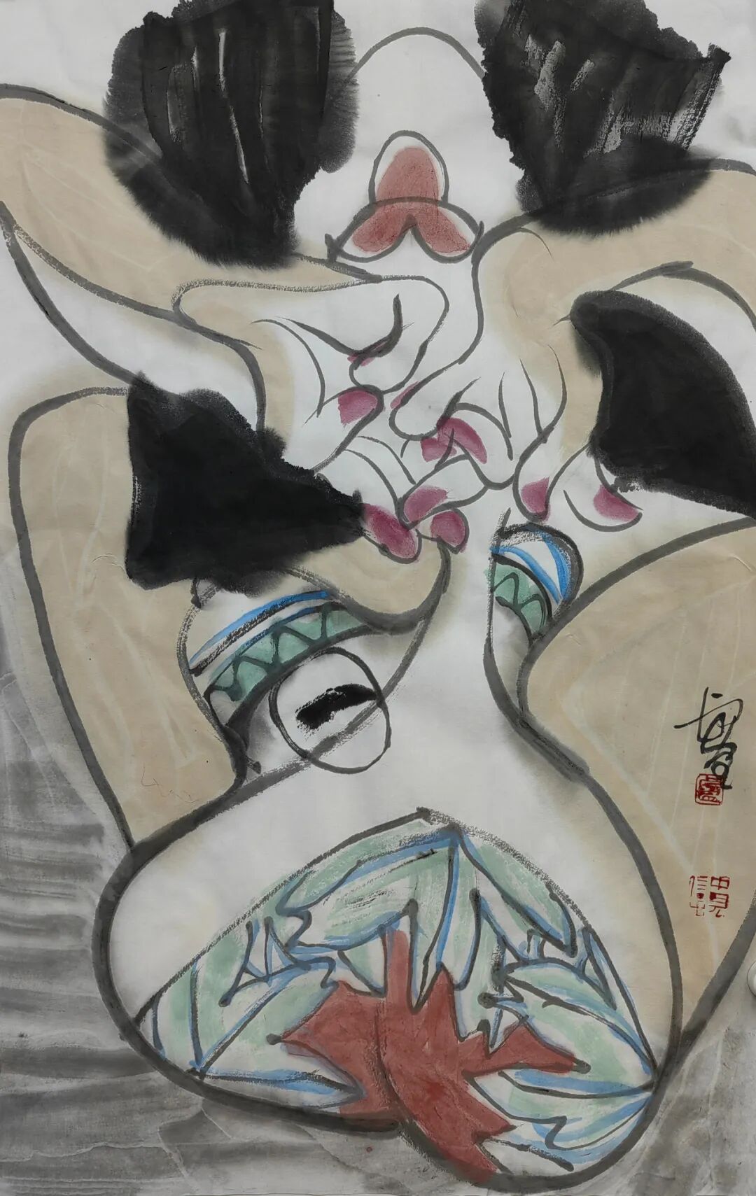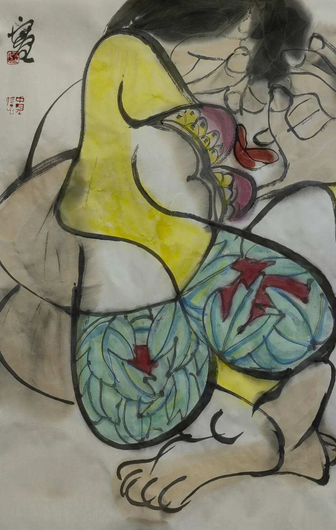 中见绘画能工能写,有浓墨有重彩,几种画科,多种技法,全部统一在他个性强烈的画风之中。就笔墨技法而言,“书写性”是中见写意画的一大特点,其线条流畅又能力透纸背,既体现他对毛笔线条的掌控能力,也是中见性格坦荡的流露方式。顺便一提,中见能写一手很有拙趣的楷书。中见画的另是一个特点是他的造型,那种略显笨拙的变形,人物中的小姑娘老大爷,花卉中的牡丹与荷花,拙的可爱,拙的有张力,拙的有趣味。可以这么说,即使他不签名,我大致上也能从造型或笔墨看出来,那是中见的画。