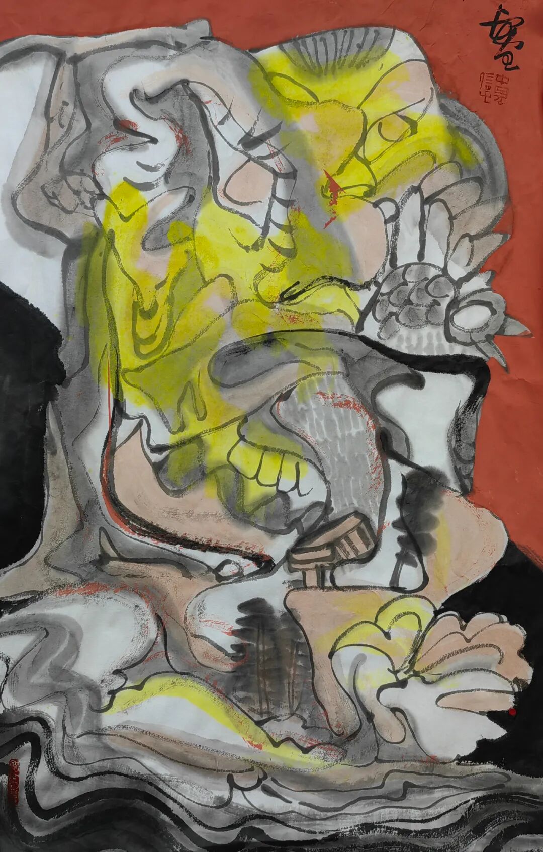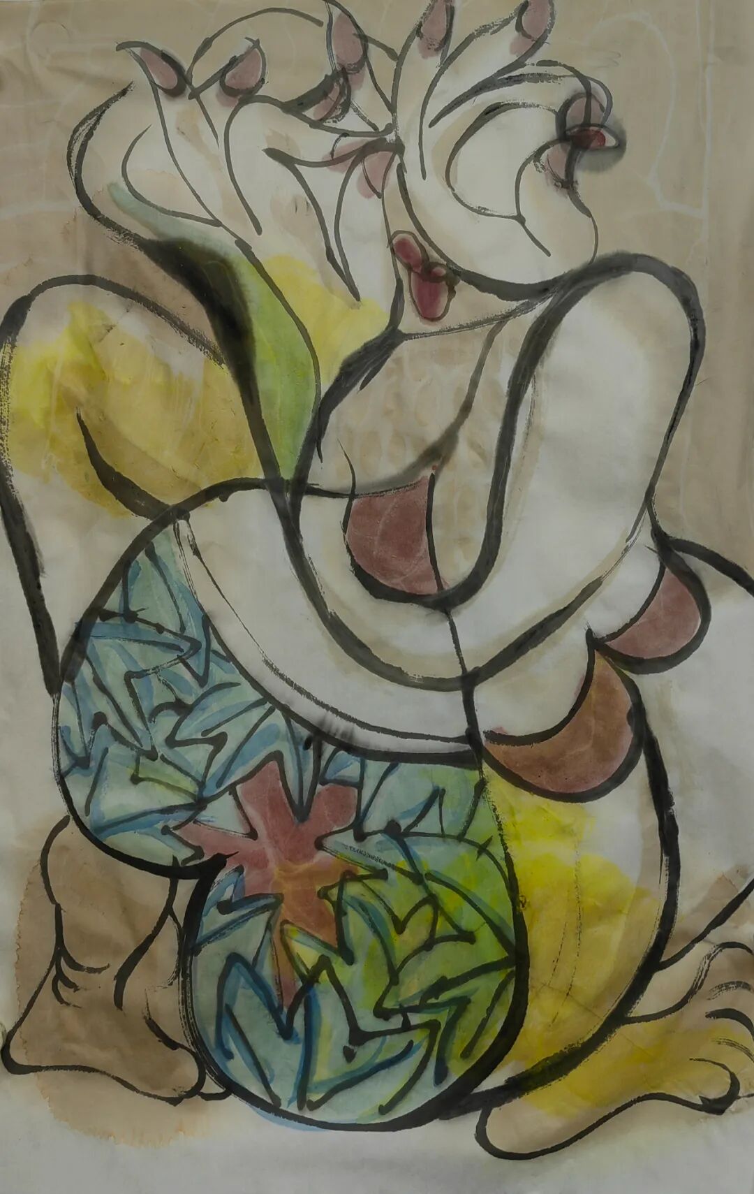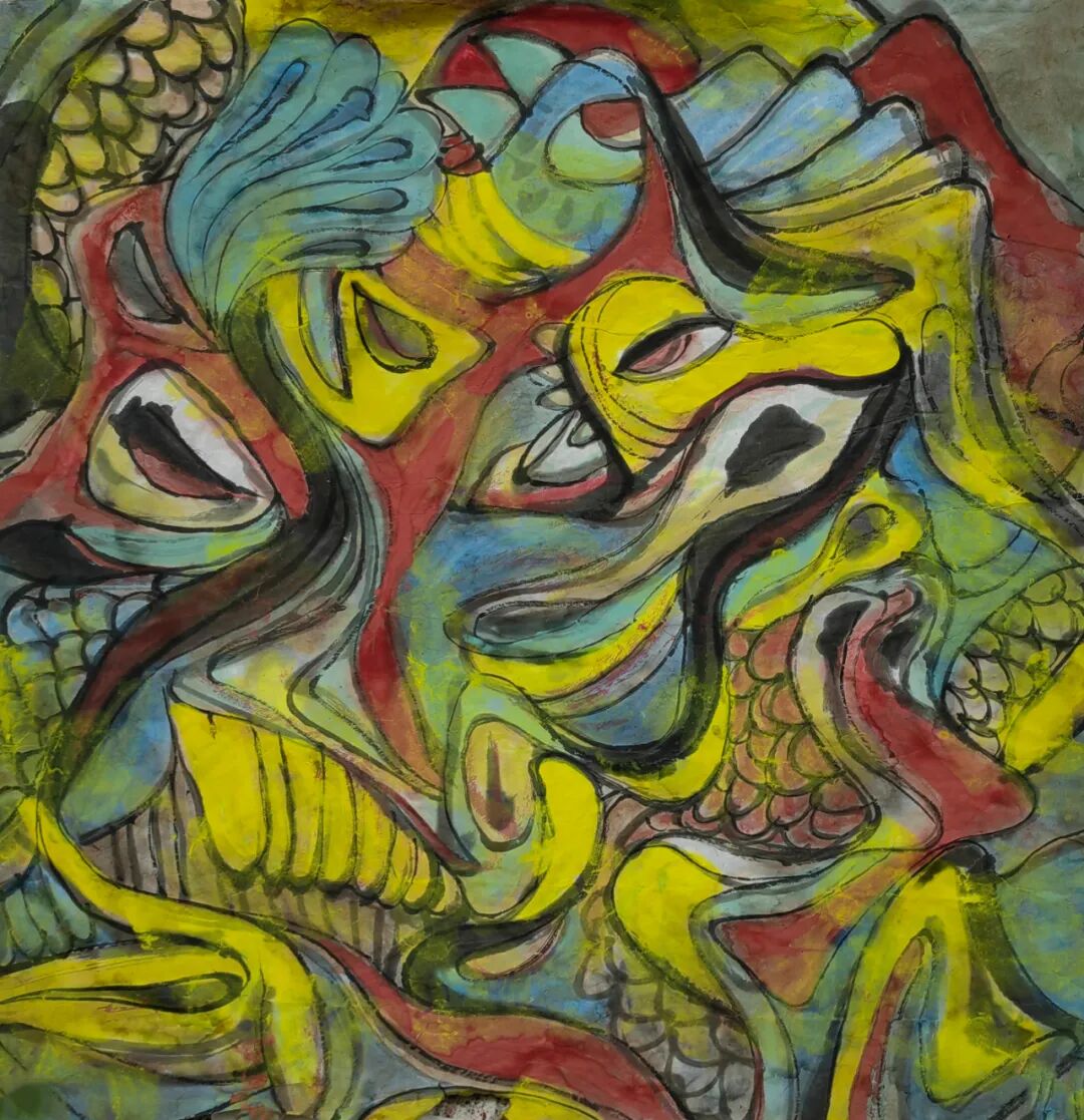 在艺术创作青年时代,中见选择粤东一种典型的民间文艺“英歌舞”作为他的人物画创作题材。为了这个创作方向,中见可没少下功夫,从形象到道具,从个体到群体,从内容到形式,都进行了深入研究,这个系列的大画创作,至少有十幅以上吧!中见特别注重画面的形式语言:大开大合的画面结构,排列紧凑有序的人物组合,配以浑厚朴拙的笔墨,平面化与构成感的构图处理,等等,这样的创作理念,在上世纪九十年代可是一种很新的面貌。在第九届全国美展上,中见不负众望,获得铜奖,在当时的粤东以至广东画坛产生很大的影响。