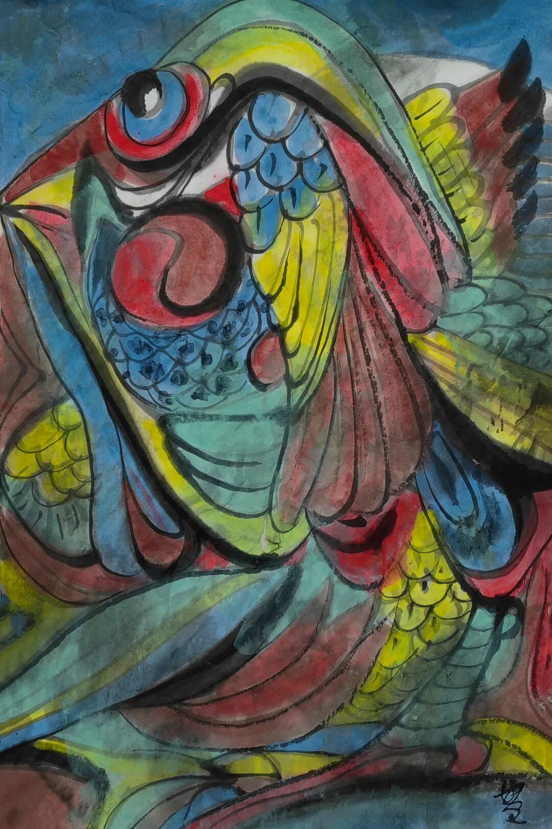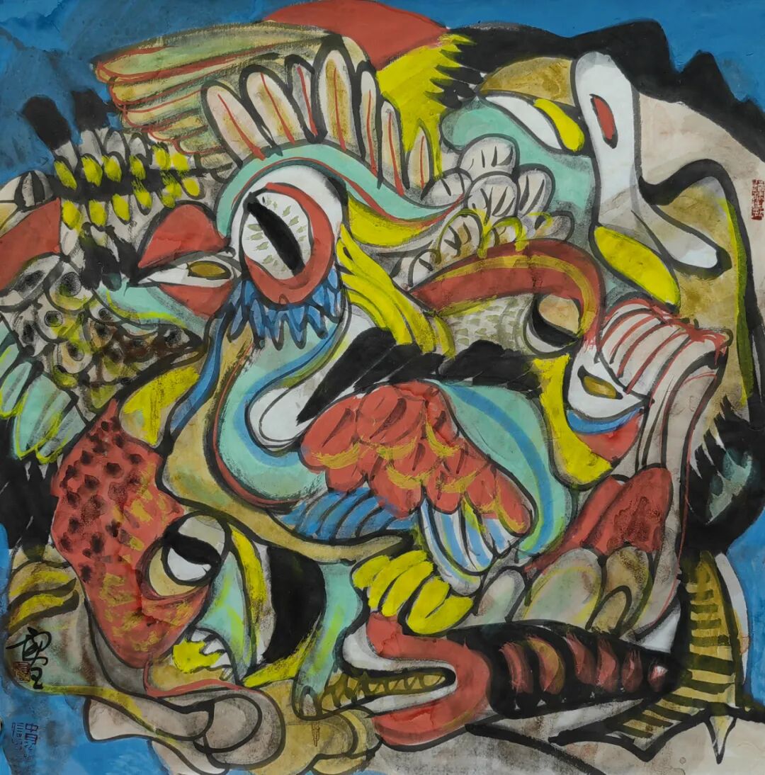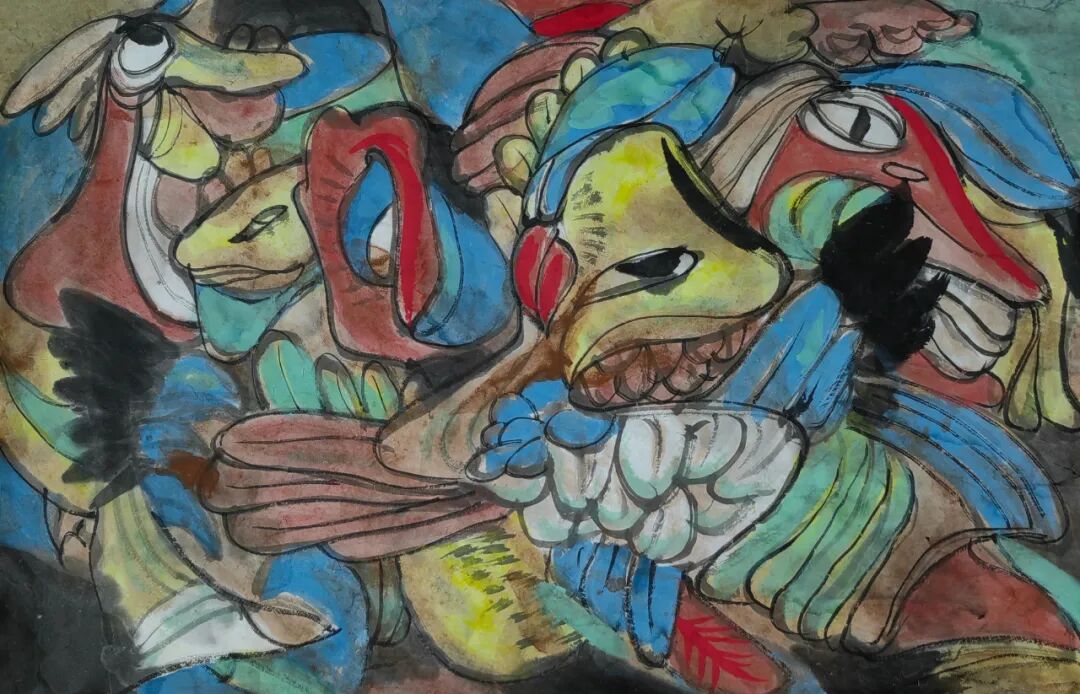 中见的学画过程虽然有广州美院进修的经历,但他从小耳渲目染中原人的笔墨基因,讲究传统,亦有军旅画家的创作风影响。体现在中见笔下,无论是人物、花鸟、山水,都是那么朴拙大气,笔酣墨畅。