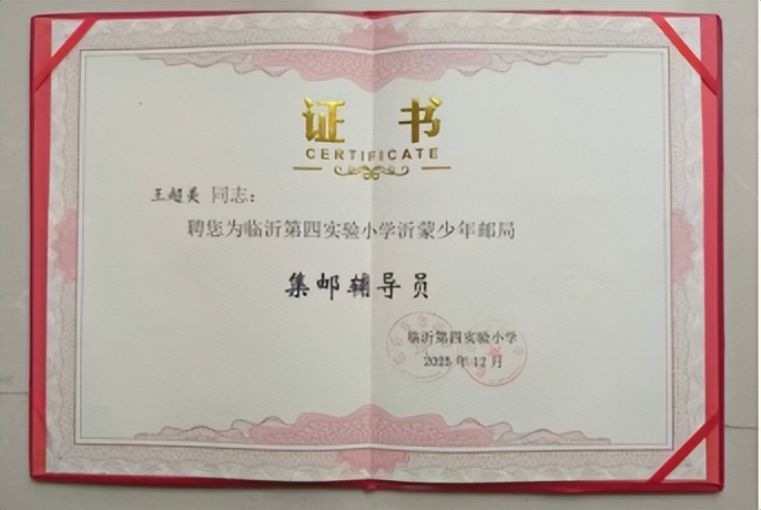 2025年12月10日是山东革命老区临沂“沂蒙少年邮局”成立15周年纪念日。在本次纪念大会上,该少年邮局聘任了八位“集邮文化辅导员”。在这八位辅导员中有一位年逾六旬来自山东济南市的王超美老师,这是他获得的第十本集邮辅导员聘书,实现了他“十全十美”的愿望。