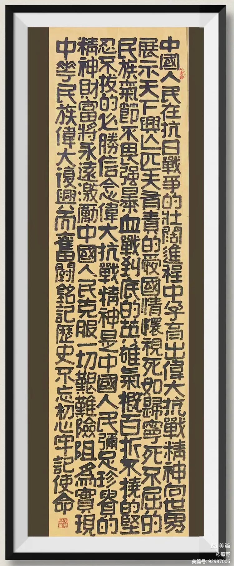 中国人民在抗日战争的壮阔进程中孕育出伟大抗战精神向世界展示:天下兴亡, 匹夫有责的爱国情怀;视死如归、宁死不屈的民族气节;不畏强暴、血战到底的英雄气概;百战不挠、坚忍不拔的必胜信念。伟大抗战精神,是中国人民弥足珍贵的精神财富。将永远激励中国人民克服一切艰难险阻为实现中华民族伟大复兴而奋斗!铭记历史,不忘初心、牢记使命!
