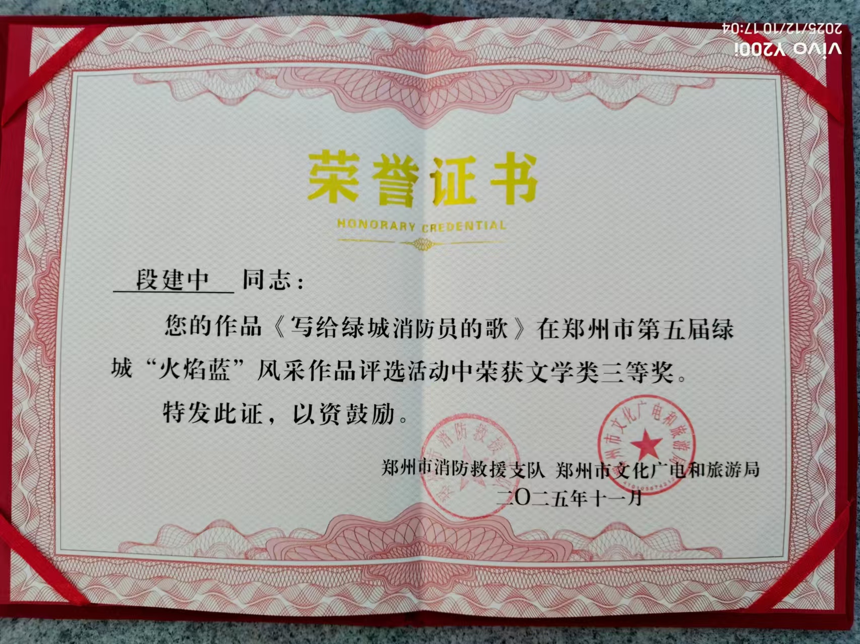 序:喜闻本人的诗<写给绿城消防员的歌>,在郑州市第五届绿城"火焰蓝"风采作品评选活动中荣获文学类三等奖,心情激动,感慨万千;特写诗文,抒发感言: