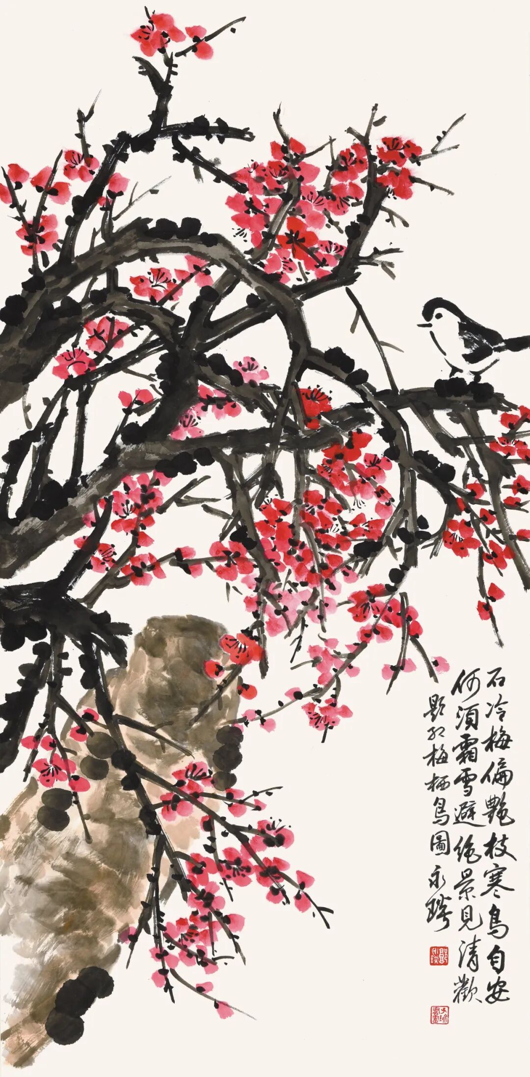 石冷梅偏艳,枝寒鸟自安。