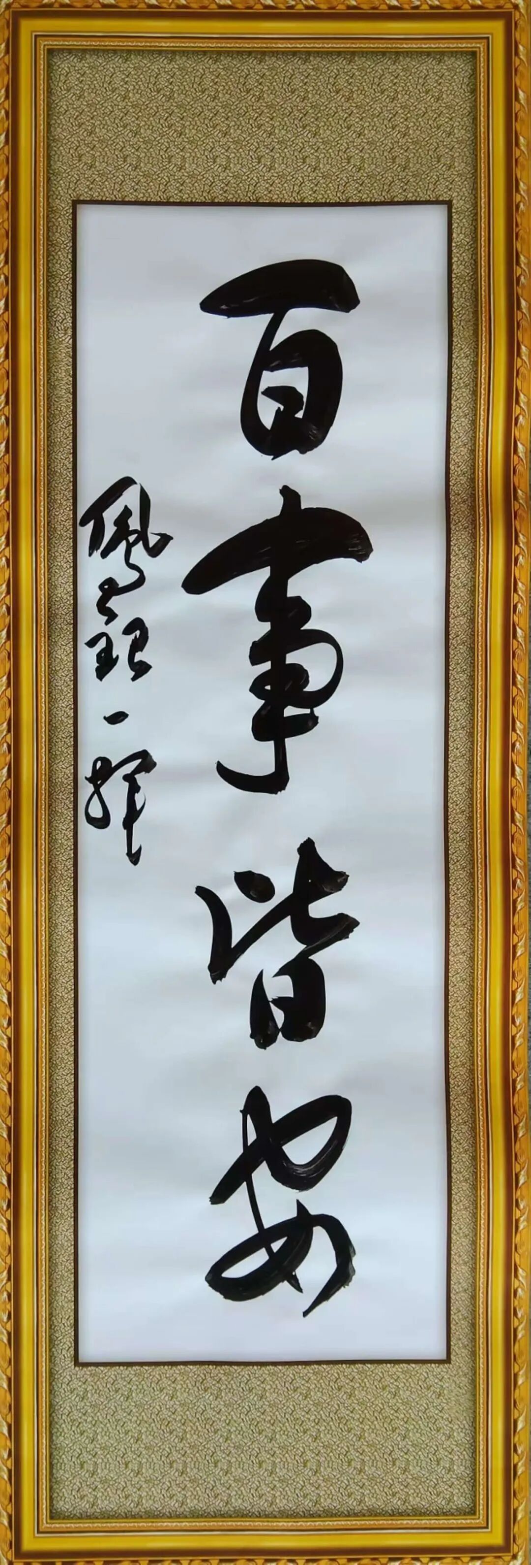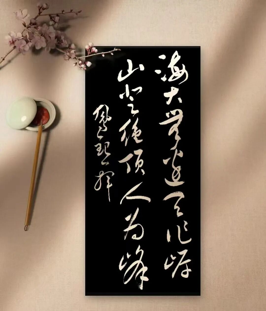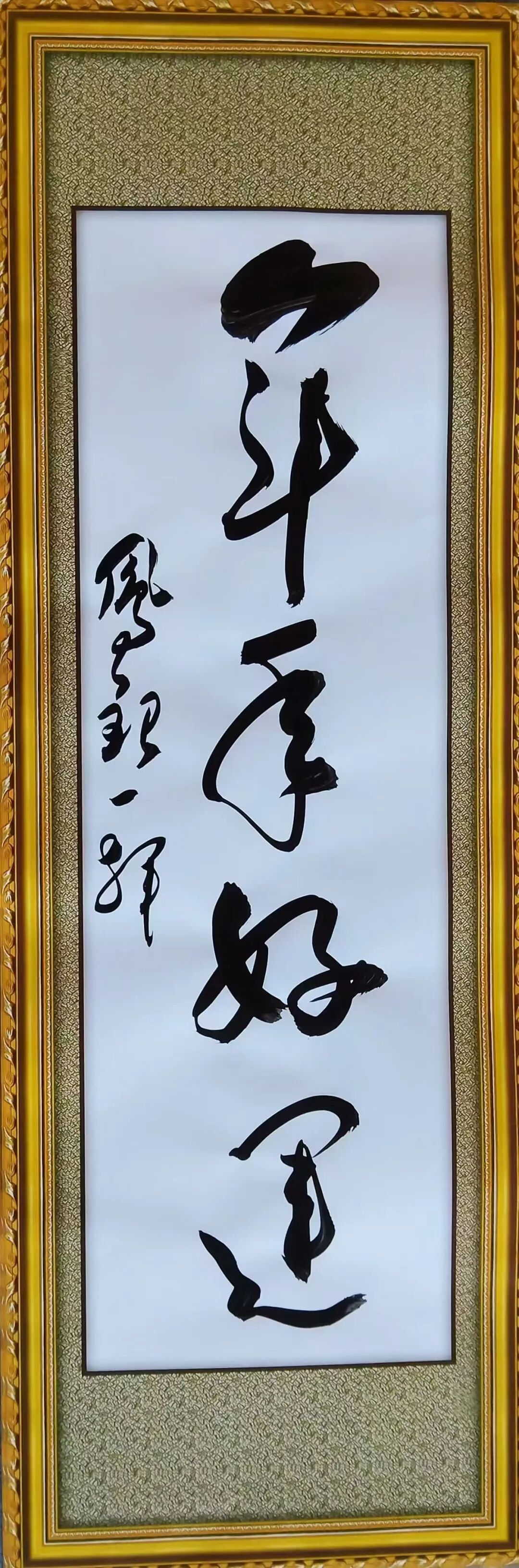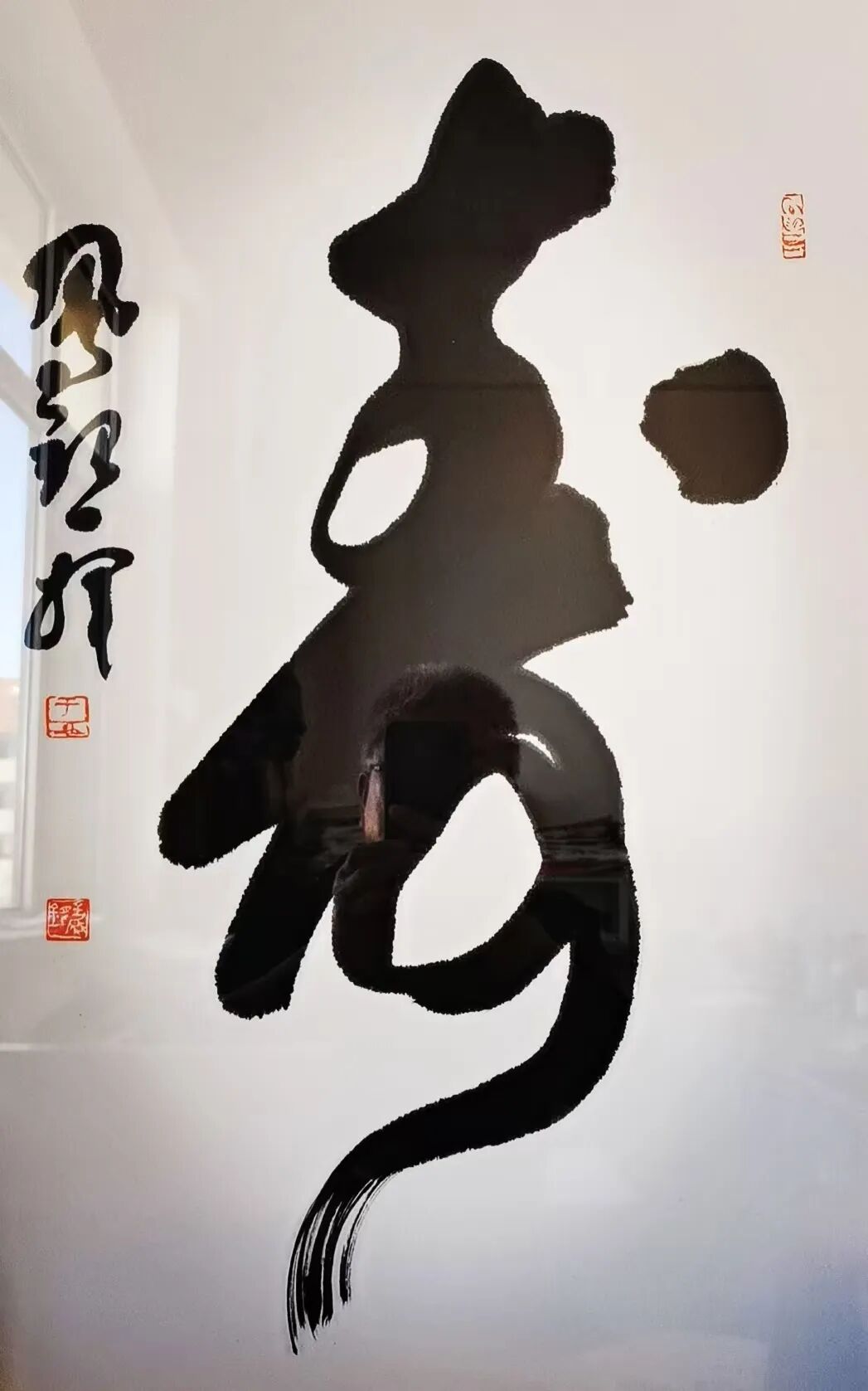 其书法风格独具魅力,北疆生长于草原,受草原罡风磨砺,笔下自有一股雄浑之气。笔力雄健,运笔时如蛟龙走、灵蛇舞,气势磅礴。作品呈现出苍劲拙朴之态,刚中藏柔,线条流畅自然,似行云流水,恰如他率真豁达的天性。于书体之上,他兼善行书、草书、楷书、隶书,无论是软笔之韵,还是硬笔之刚,皆能信手拈来,驾驭自如。为求书法精进,他遍访古人踪迹,深入研习二王的潇洒飘逸、颜苏的雄浑大气,临摹米赵的灵动精巧,苦心孤诣,力求探寻书法真髓。同时,他还师法自然,摹刻那达里诺尔、那西拉沐伦河的灵动之姿,将天地之灵气融入笔端。