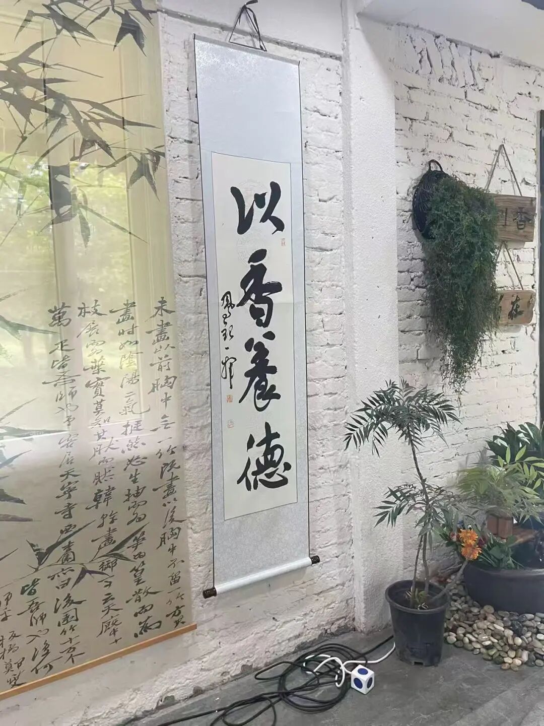 你展示的作品包括 横幅(如“合香聚天地”1.8m*48cm)、竖幅(如“以香养德”1.3m*34cm)、招牌式题字(如“非遗传承古法手工”1.8m*48cn),这类作品尺寸通常在 4-8平方尺 左右。