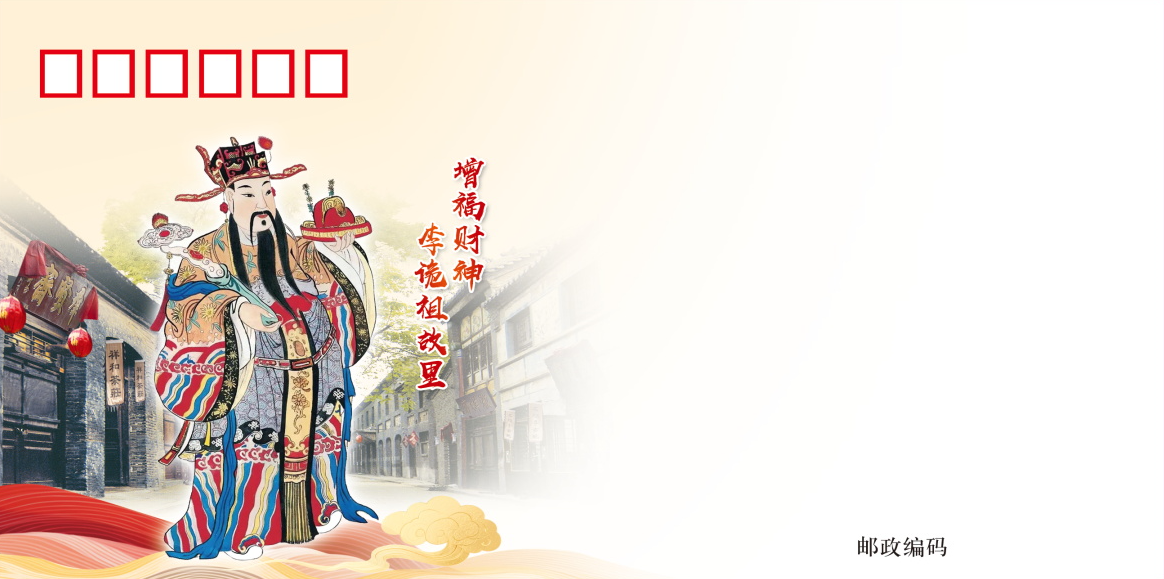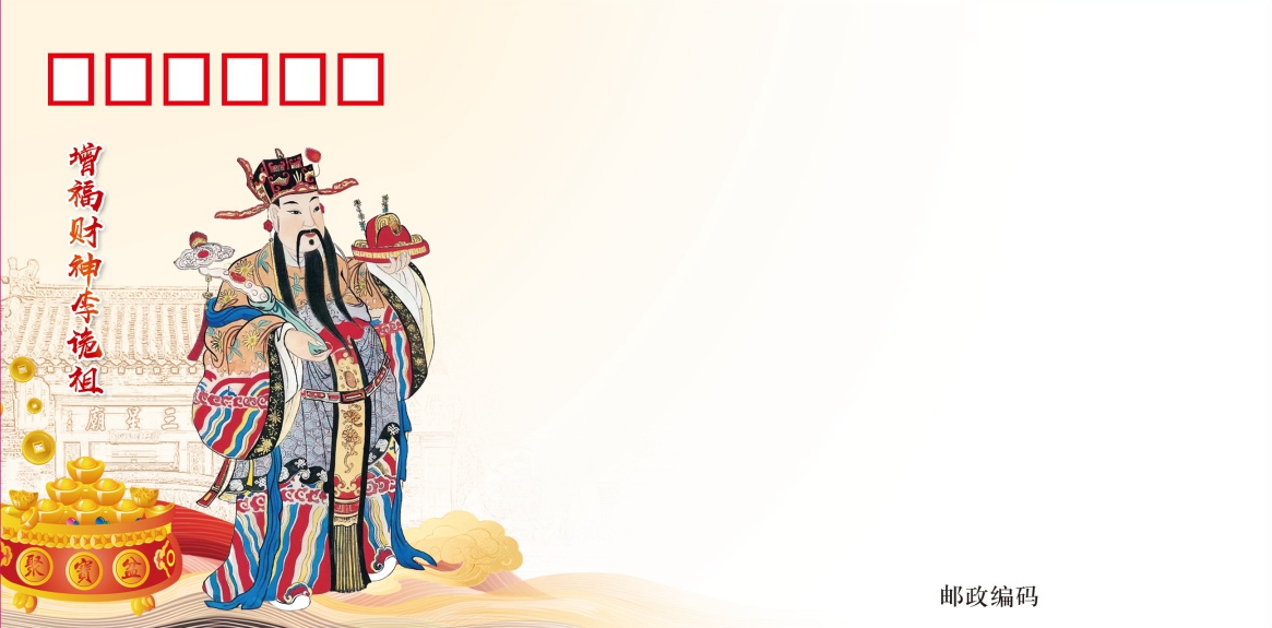 信封主图上的增幅财神,是一副锦衣玉带,头戴朝冠,身穿红袍,白脸长须,面带笑容的模样,在国内民间木版年画、剪纸等艺术形式上大量出现。从古到今,增幅财神一直是人们最心仪的神仙。增福财神站在鲁商故里——周村古商城的大街上,默默护佑着这座千年古城、百年商埠。