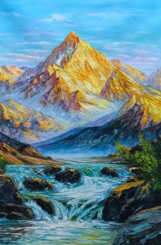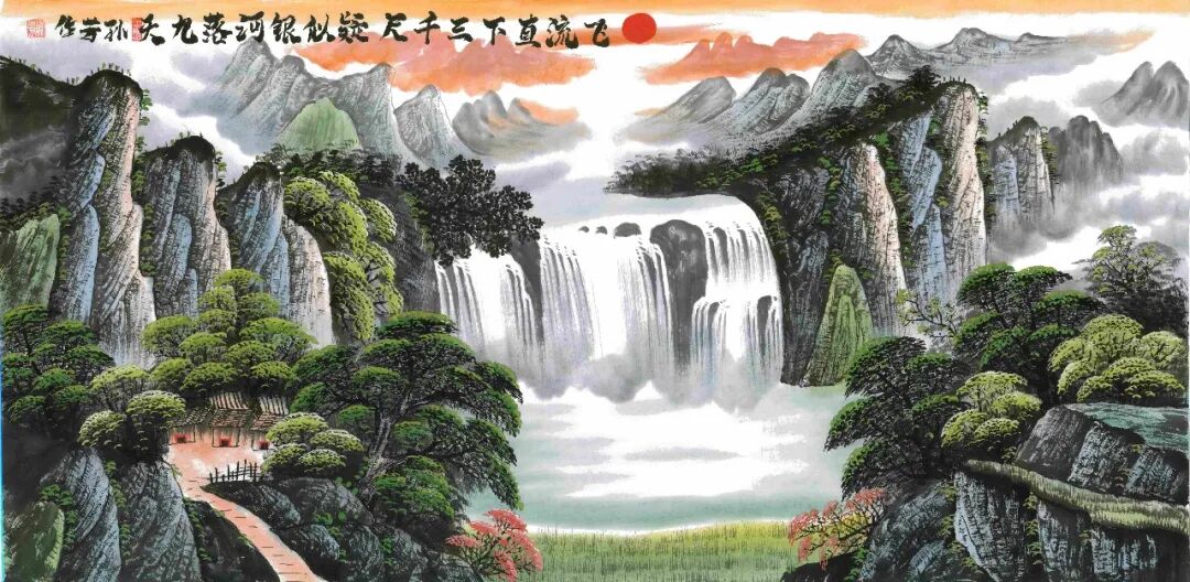 画中最醒目的,是东方天际那轮灼灼红日,霞光如锦,将层叠的山峦晕染出暖橙与绯红的渐变,恰应了“旭日东升”的题旨。红日之下,奇峰峻岭以水墨勾勒筋骨,赭石、花青敷色添韵,山石的刚劲与云雾的柔曼相映成趣——缭绕的云气似流泉般在山谷间游走,将山峰衬得宛若仙阙,而飞泻的瀑布自崖间奔涌而下,白练似的水势撞碎在青石上,又化作潺潺溪流绕桥而过,动静之间,让整幅画有了“活”的气韵。亭台民居隐于繁花绿树间,更添了人间烟火的温情,使得雄奇的山水多了份可居可游的亲切感。