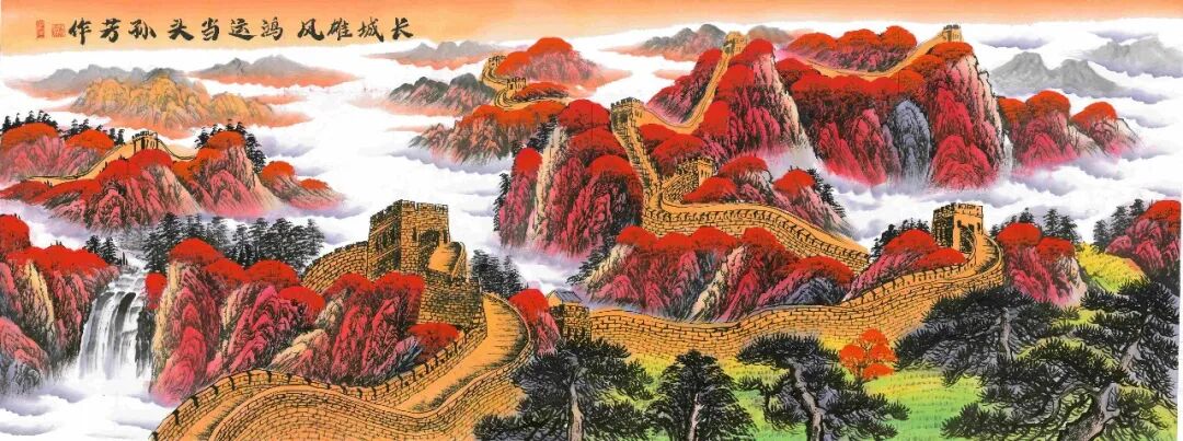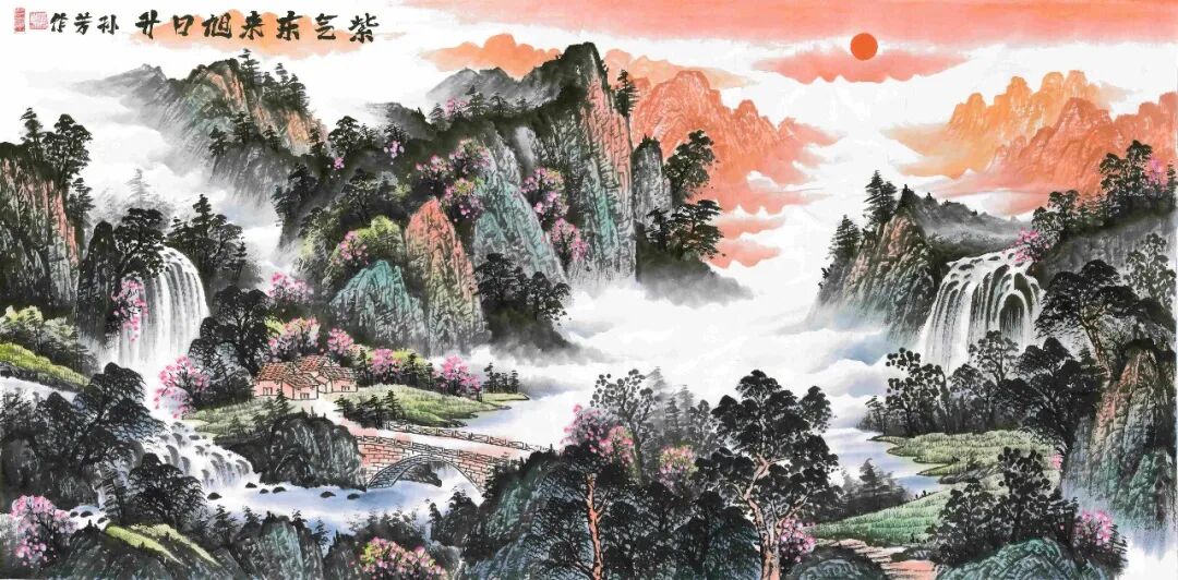 初见孙芳这幅《紫气东来旭日东升》,便被画面中磅礴的气韵与温润的祥瑞感牢牢吸引。这幅现代写意山水画,既扎根于传统山水的笔墨精髓,又融入了当代审美的表达,观之如临灵山胜境,心潮随山水起伏,满是惬意与震撼。