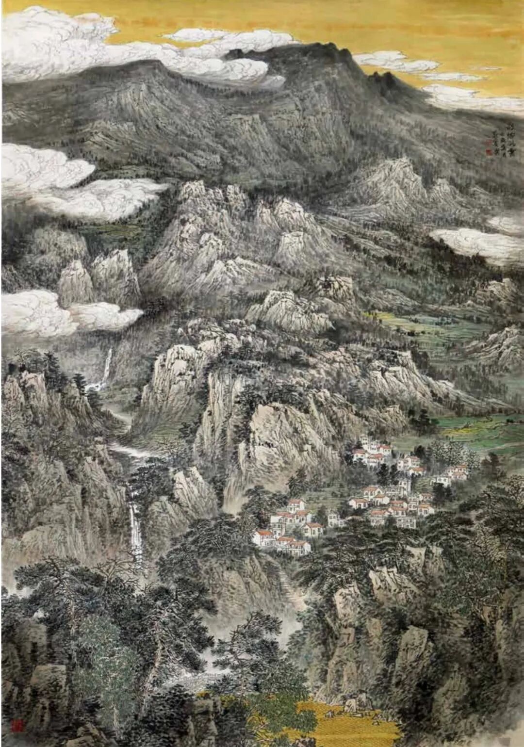 尤为珍贵的是,张义宾的山水意境中,始终流淌着一种深沉而温热的人文情怀。他的笔墨深处,烙印着对赣南故土家园的无尽眷恋与深刻理解。那山间隐约可见的村舍、小径、田畴,并非随意点缀,而是承载着“家山”记忆的精神符号,是客家人世代耕耘、繁衍生息的生命图景在艺术中的浓缩。画中草木的勃勃生机,岩石的坚韧不拔,无不透露出画家对这片土地上顽强生命力的由衷礼赞。这使得他的山水画在展现自然壮美与宇宙哲思的同时,始终洋溢着浓郁的人间气息与家园温情。这份源自生命体验的真挚情感,是画作撼动人心的根本力量,使其意境超越了纯粹的视觉审美,成为连接天地自然与人间烟火的精神纽带。