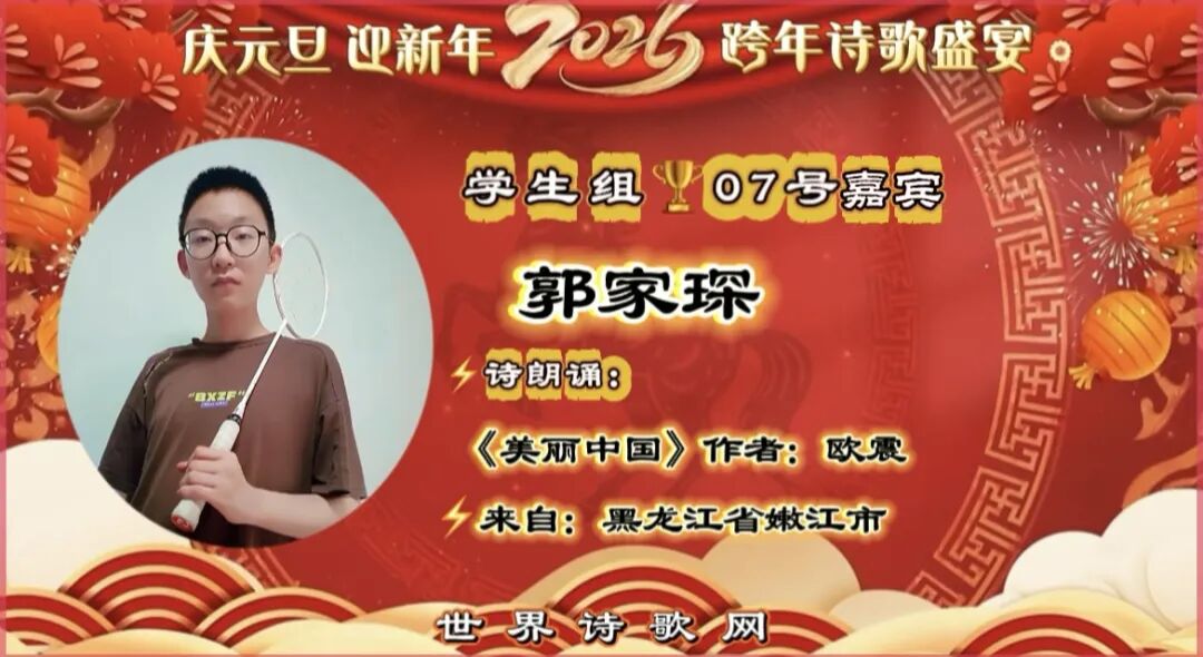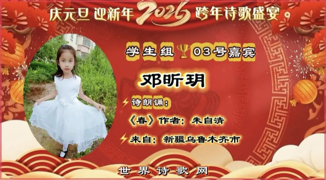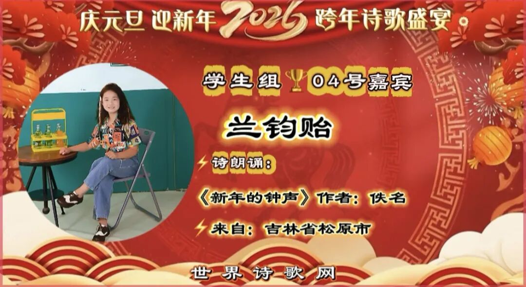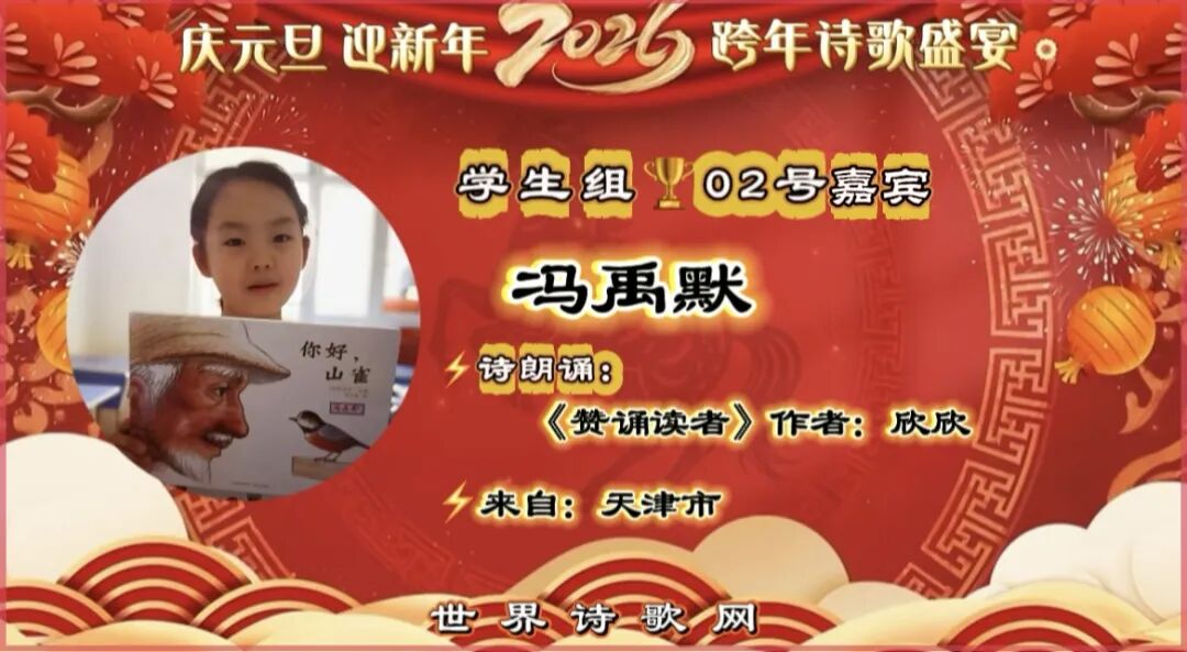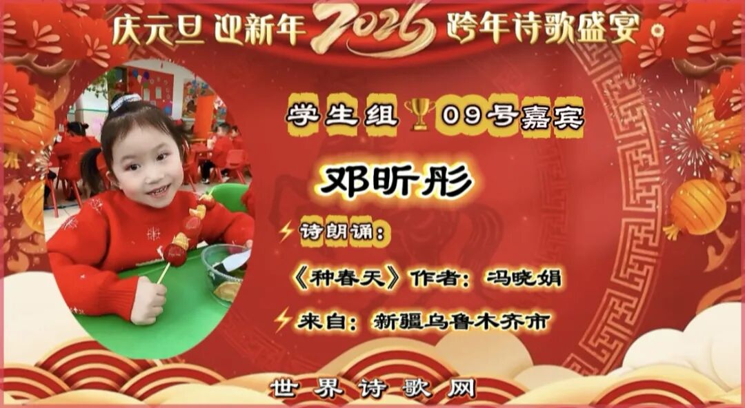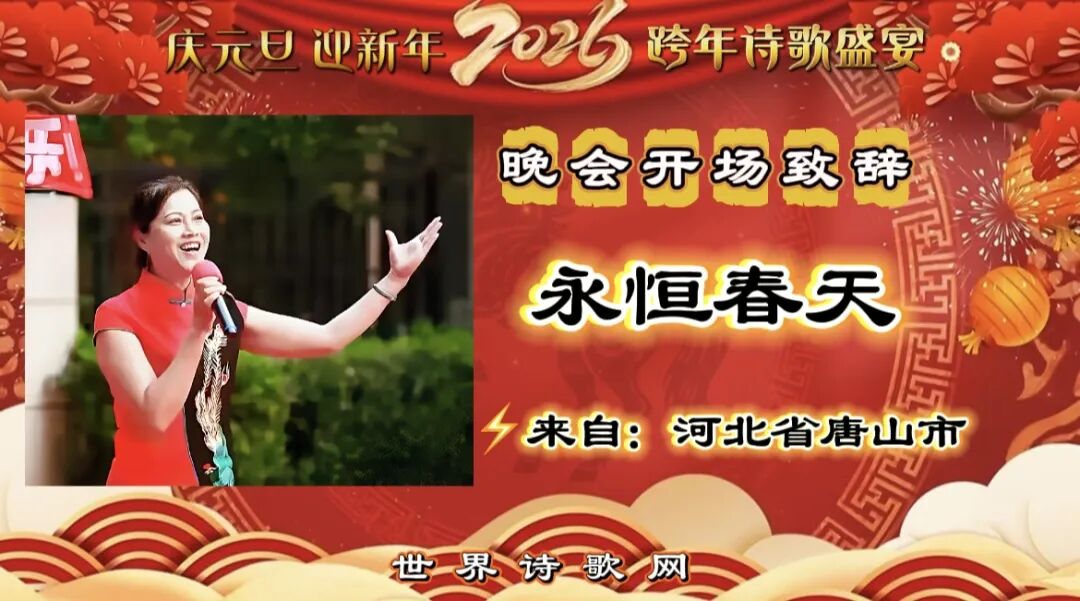 这里是世界诗歌有声传媒朗诵平台。今天,我们世界诗歌朗诵团的成员欢聚一堂,共同迎接2026年元旦的到来。值此佳节,我和所有平台的人员向支持鼓励我们的家人们致以最诚挚的问候和最美好的祝福!