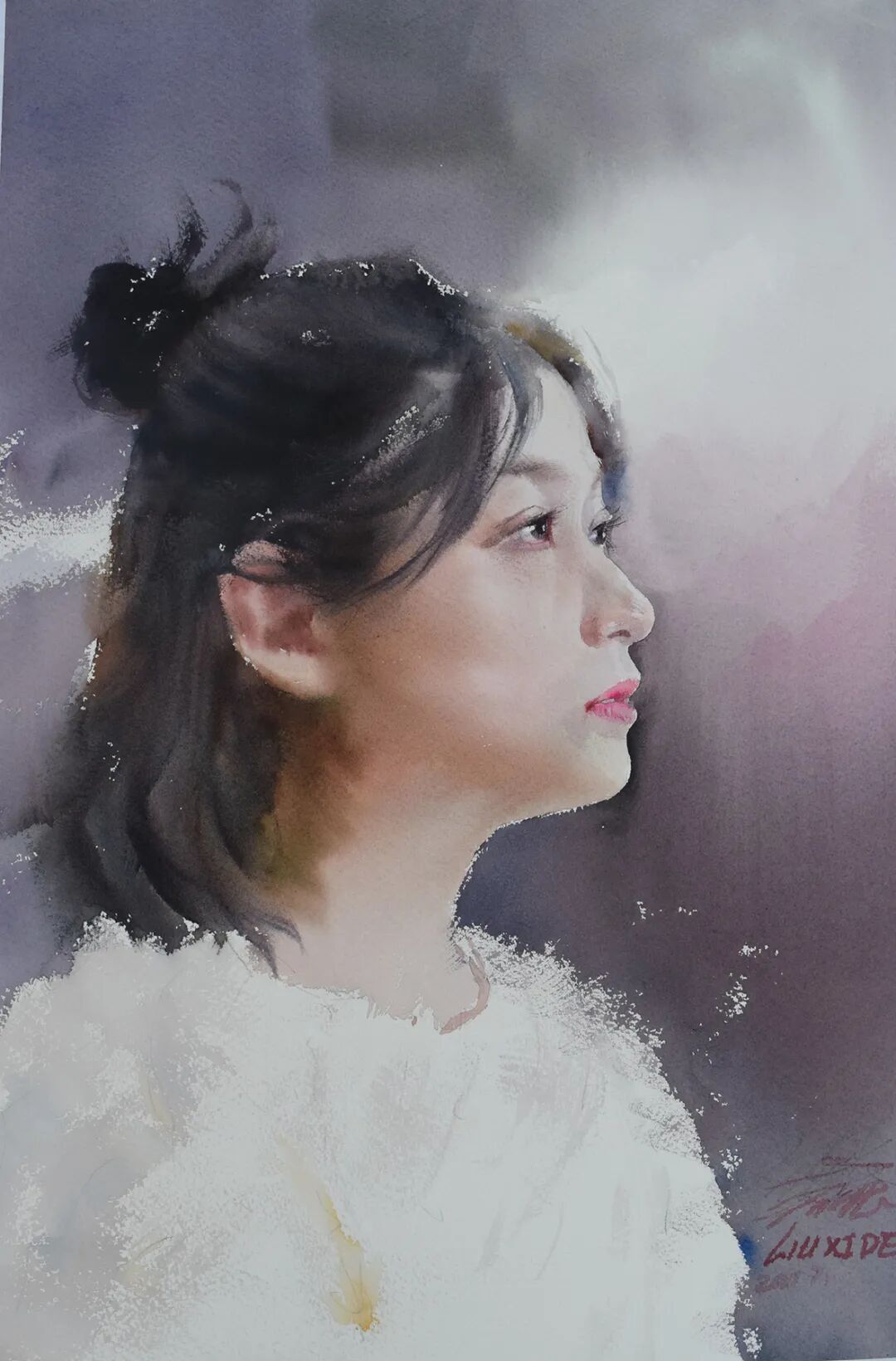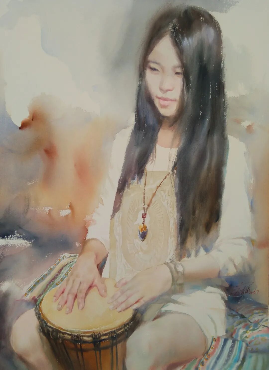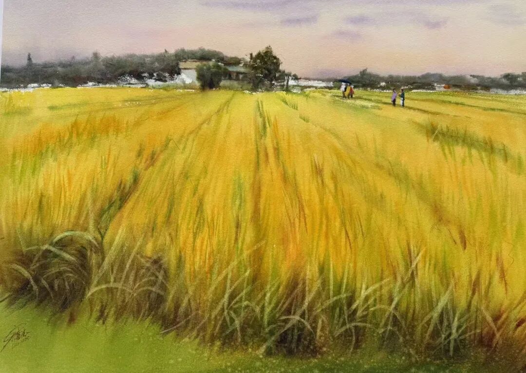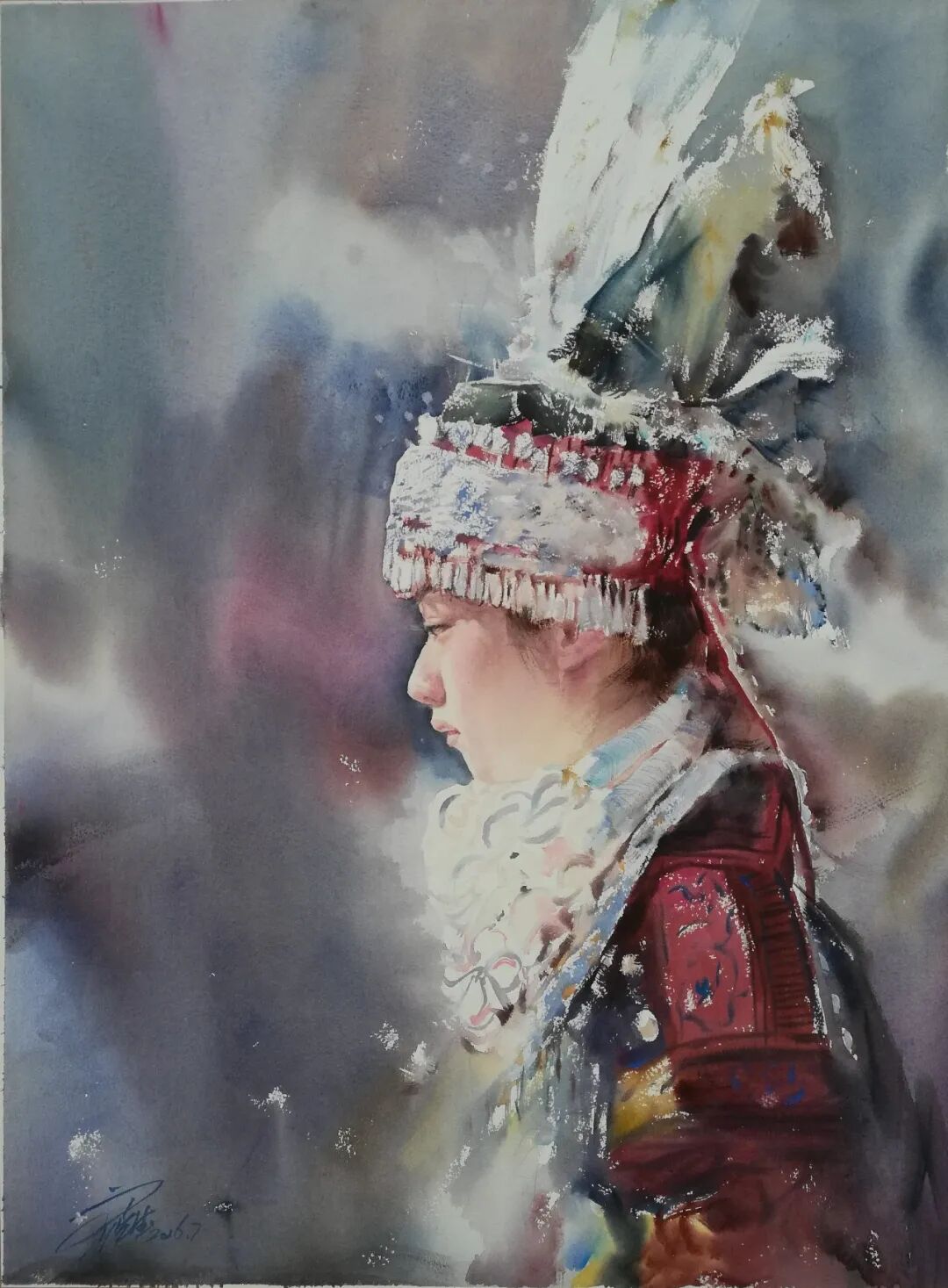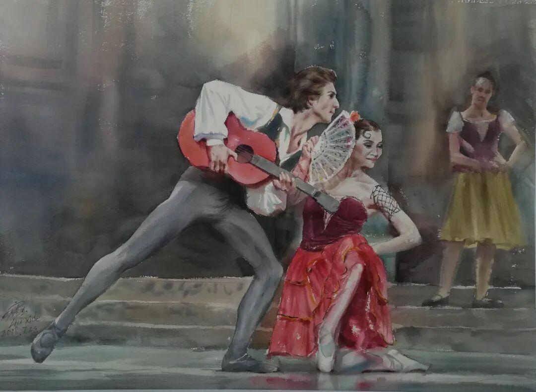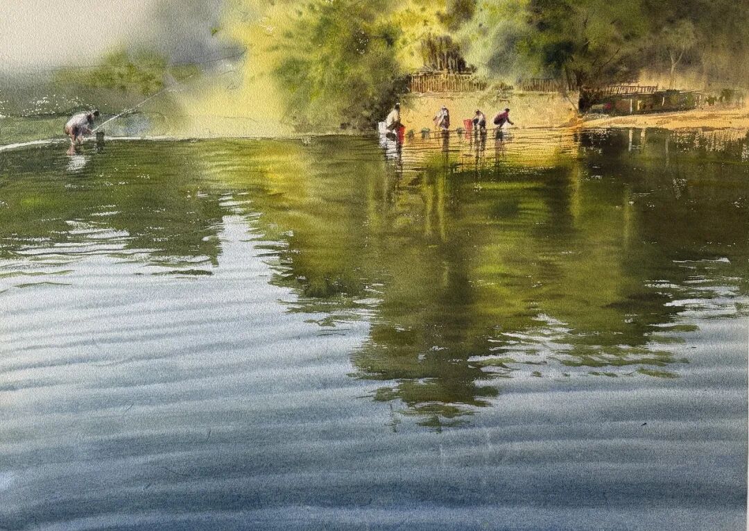 刘喜德的水彩作品兼具东方意韵与国际视野,灵动洒脱是其鲜明标识。他尤擅人物创作,《华章》系列斩获多项大奖,《此时无声胜有声》摘得土耳其国际水彩大赛金奖,《未成曲调先有情》获IWS国际水彩中国展铜奖,笔下人物眉眼含情、气韵生动,善用光影勾勒神态,水彩的通透质感与笔墨写意韵味相融,尽显东方美学意境。同时他扎根乡土,《苗族姑娘》等作品聚焦西南少数民族风情,用细腻笔触定格地域人文,让八桂风情随水彩走向世界。