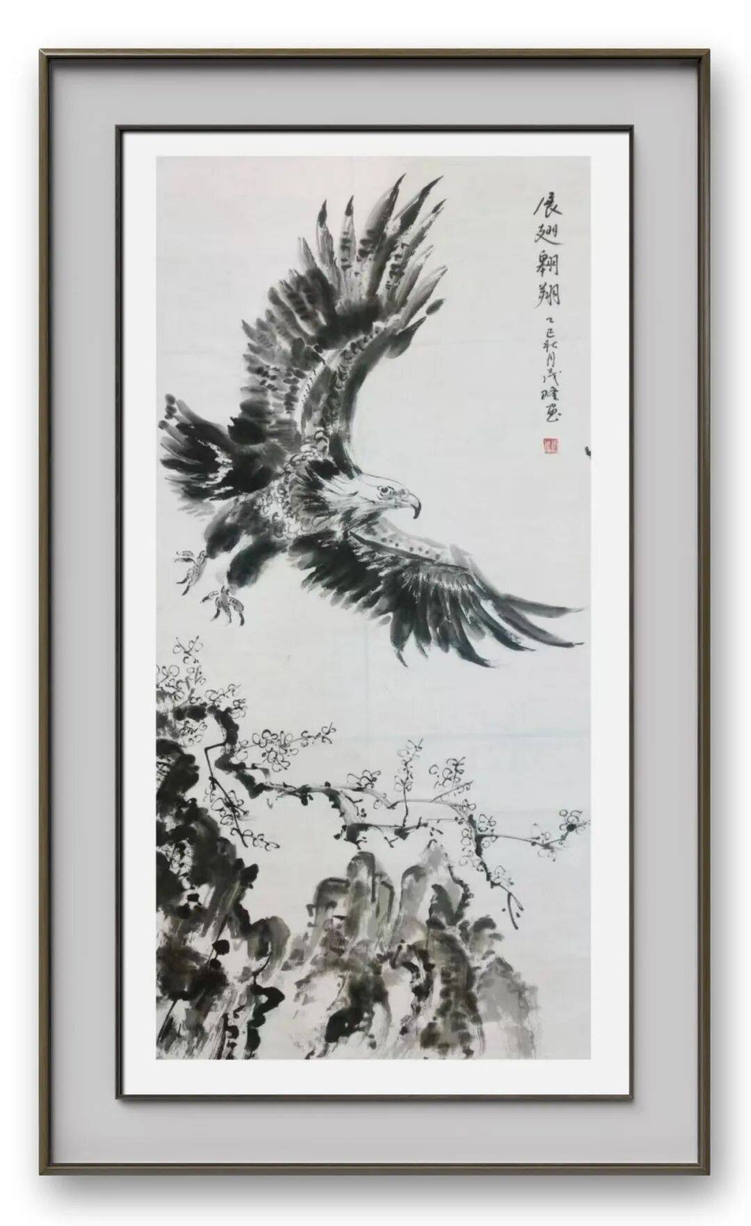 而鸡与老鹰的塑造,更见先生对生命精神的精准捕捉。笔下老鹰目光锐利,羽翼遒劲,或振翅欲飞,或踞立远眺,尽显王者霸气与搏击长空的豪情,笔墨间的刚劲线条恰是先生自身顽强探索精神的写照。