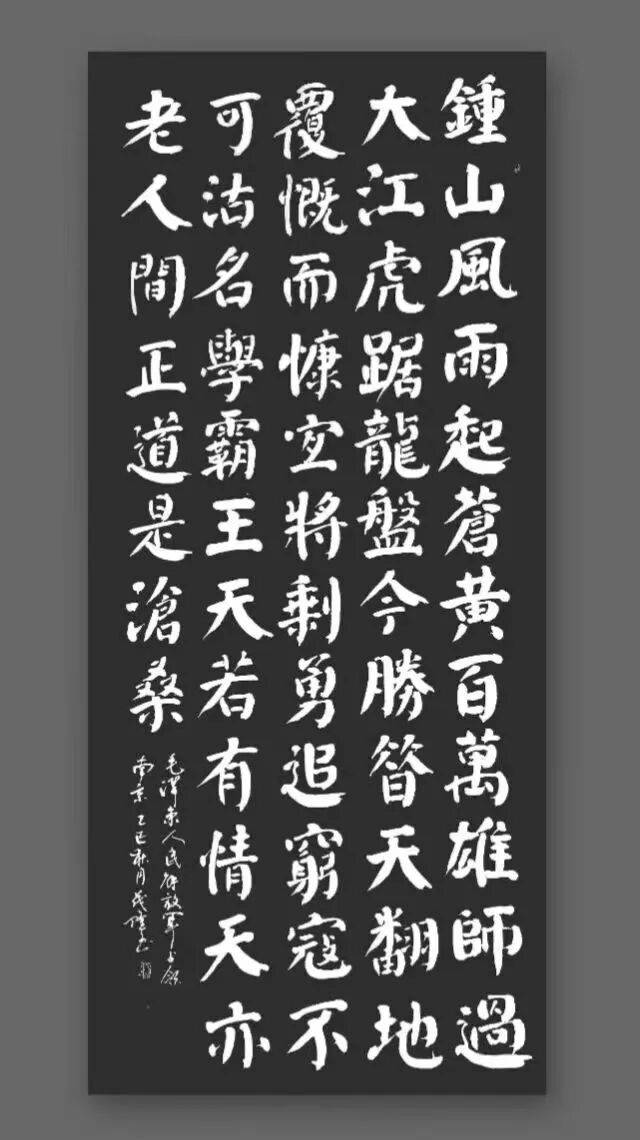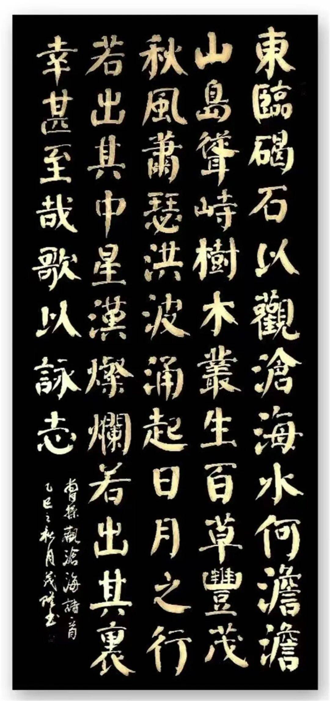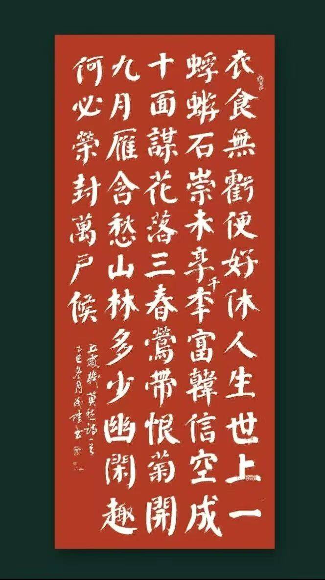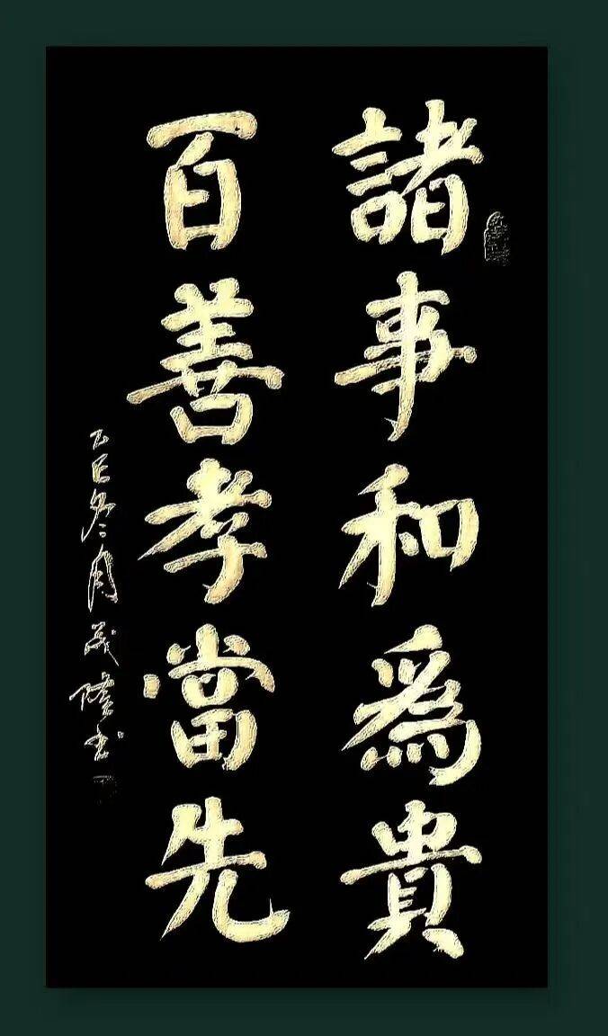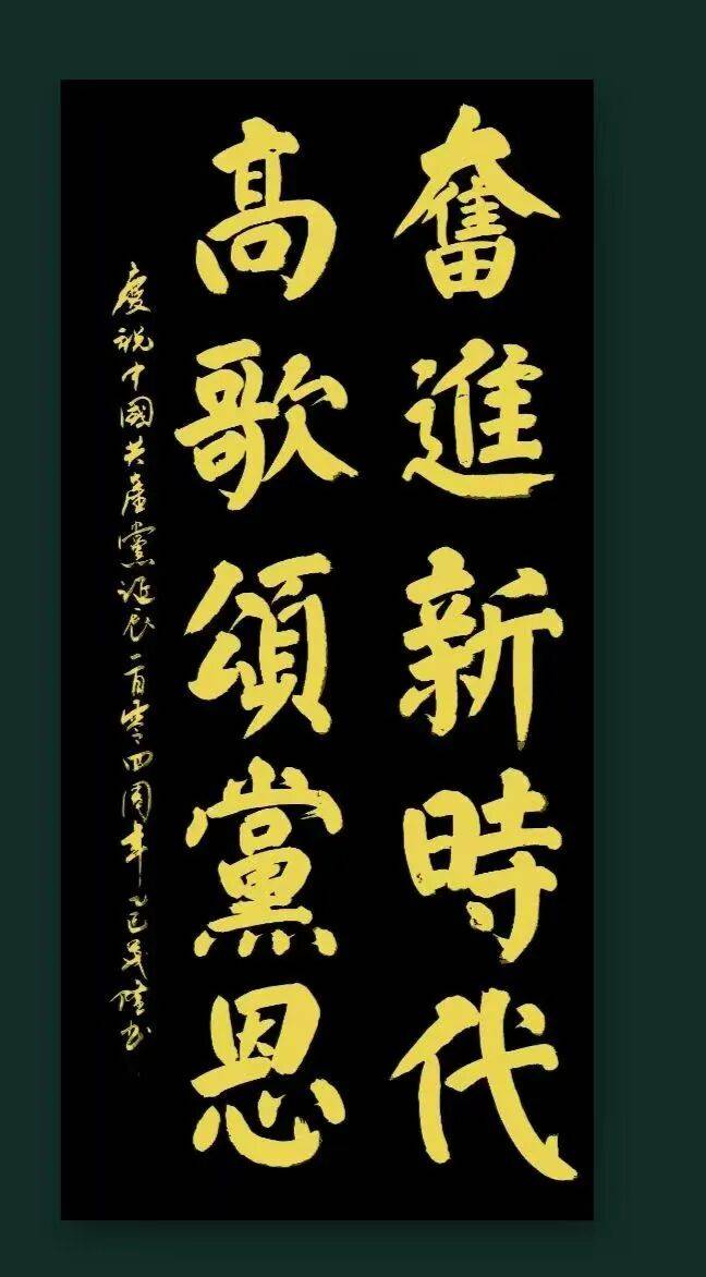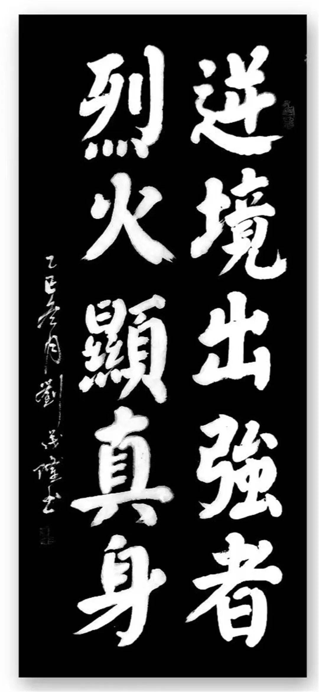 先生的书法以颜体为根基,尽显雄强豪迈之风。他广临碑帖,将古人韵味与自身特质深度融合,笔下字迹刚劲有力、饱满大气,每一笔都力透纸背,自带“龙腾虎跃”的磅礴气势。线条遒劲清健,流转间收放自如,既恪守颜体的雄浑厚重,又融入自身的性情气度,形成了独树一帜的书风。观其大字作品,气势宏阔,震撼人心,字里行间不仅有笔墨的精妙,更有弘扬民族文化的初心与担当,恰如“墨洒春辉”之感,为“天下裘都”增添了浓郁的文化豪迈。这种将个人艺术追求与地域文化相融的创作,让书法作品超越了单纯的笔墨技巧,更具人文温度与时代价值。