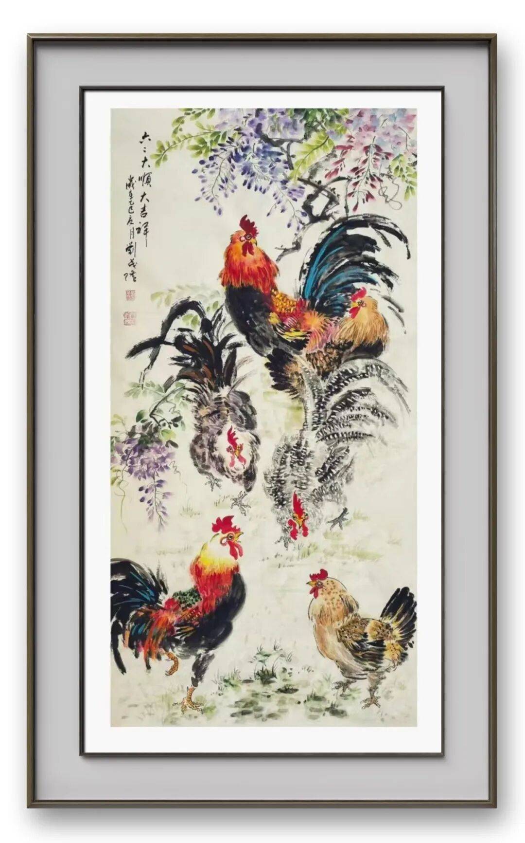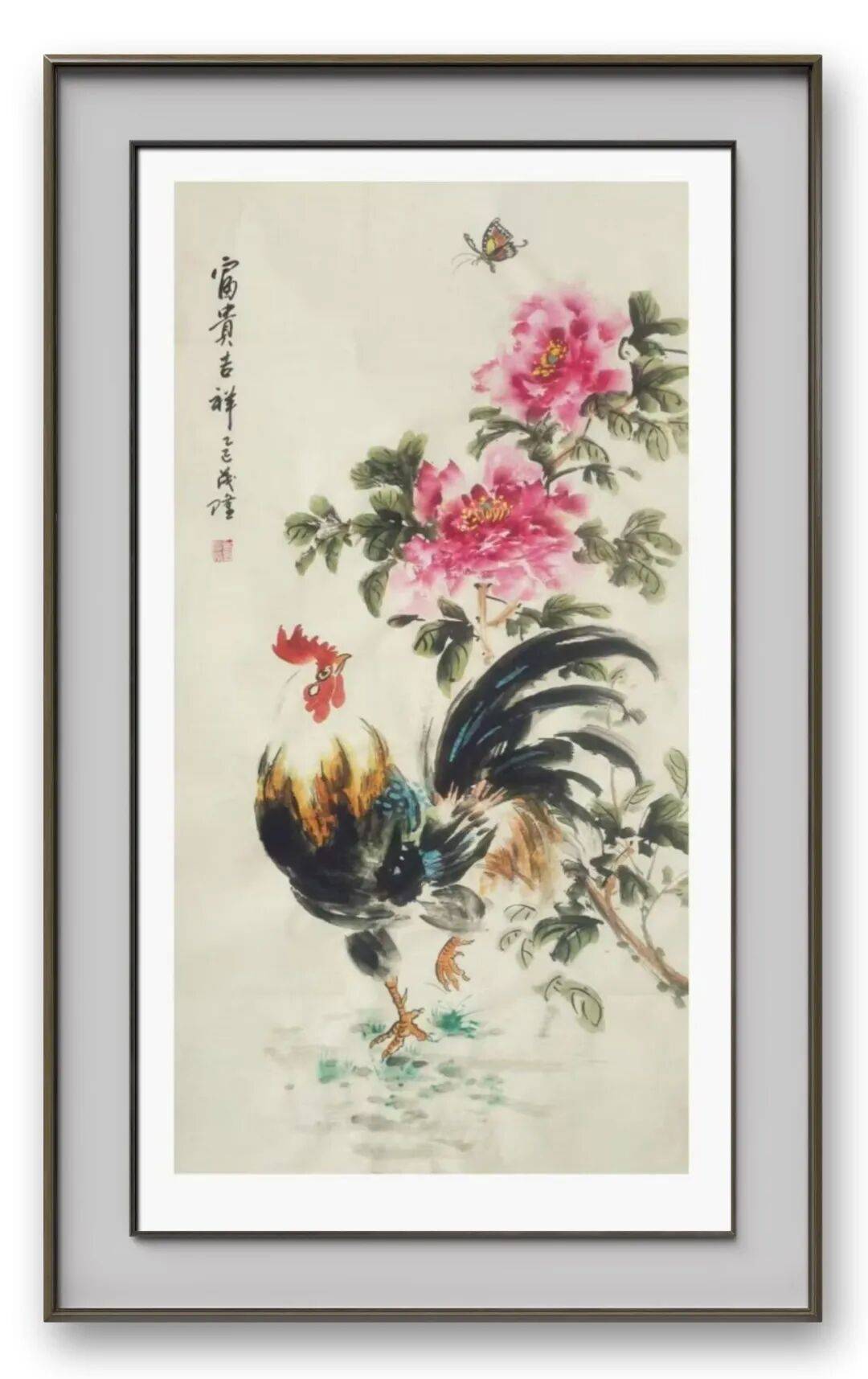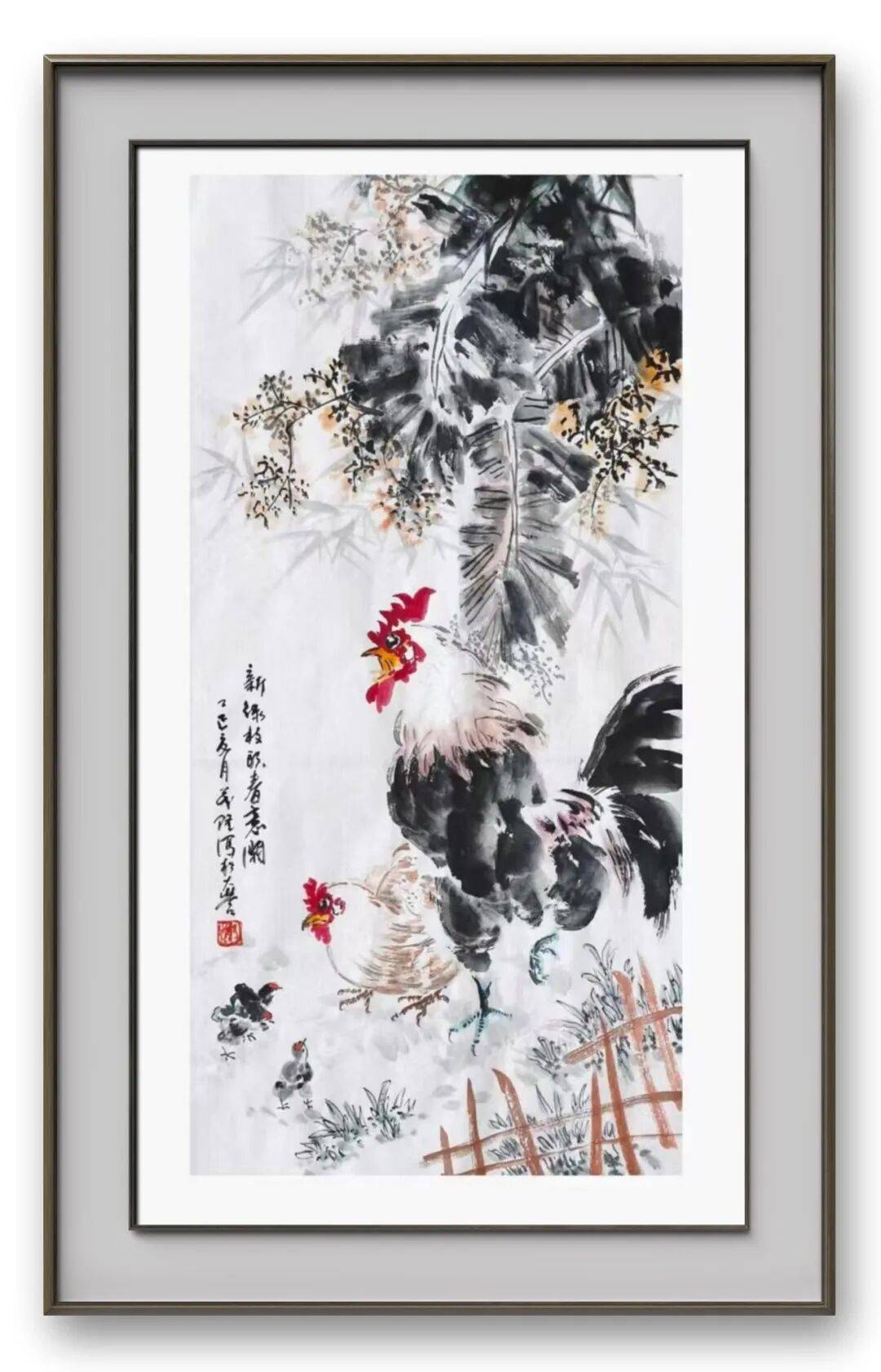 鸡的形象则多了几分生活温情,或昂首阔步,或啄食嬉戏,姿态生动鲜活,线条简练传神,将鸡的灵动与生机刻画得入木三分,于平凡物象中传递出对生活的热爱。花鸟作品亦独具韵味,以情动人,笔墨简练而意境悠远,色彩搭配清雅和谐,尽显自然生灵的鲜活意趣。