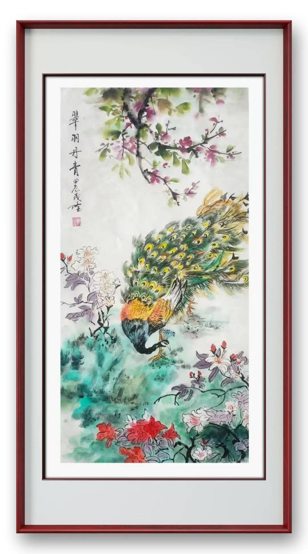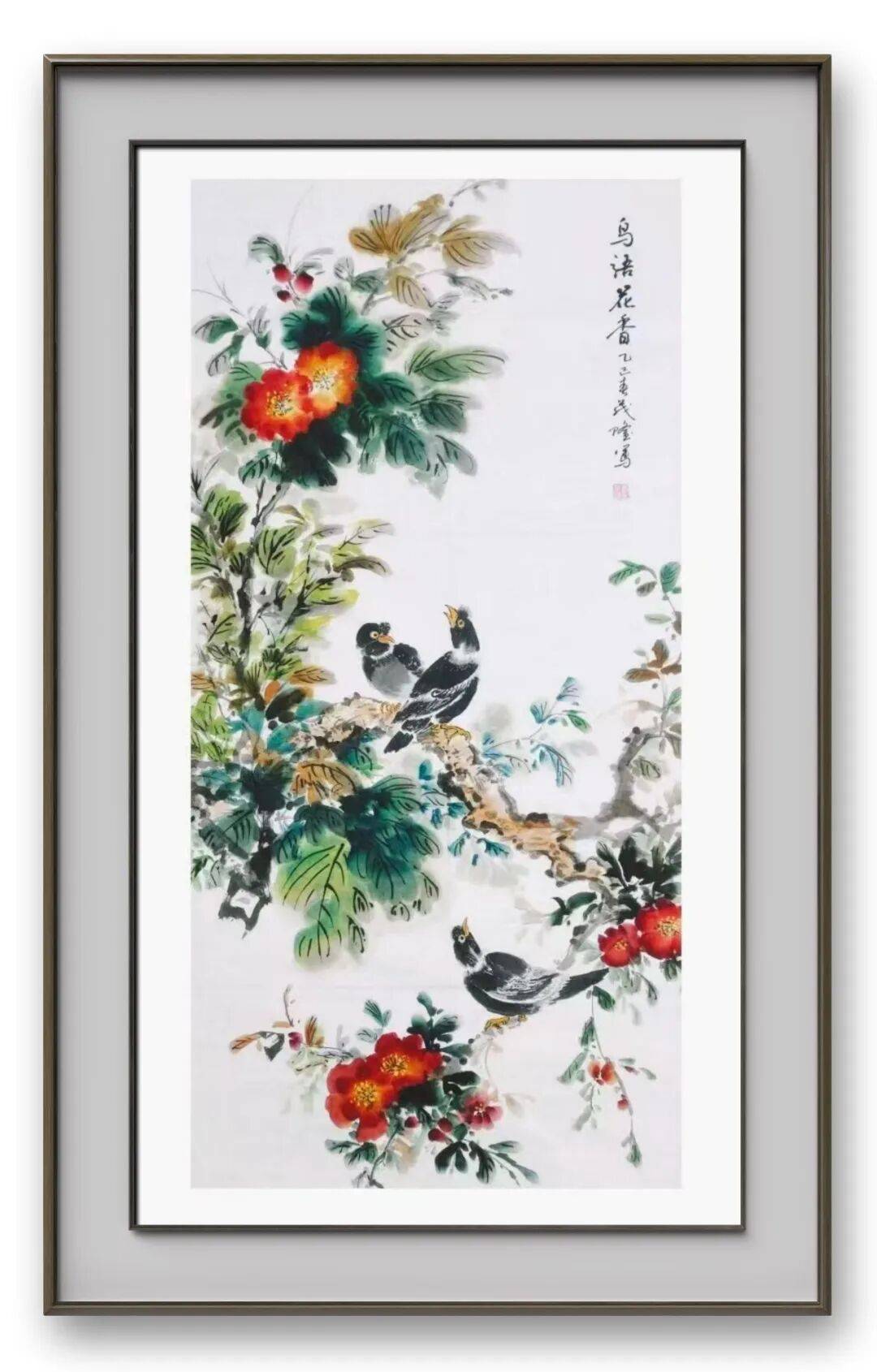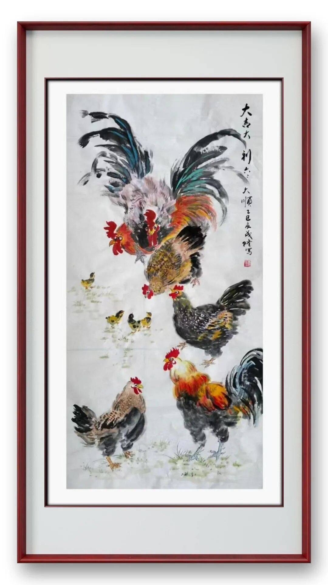 鸡的形象则多了几分生活温情,或昂首阔步,或啄食嬉戏,姿态生动鲜活,线条简练传神,将鸡的灵动与生机刻画得入木三分,于平凡物象中传递出对生活的热爱。花鸟作品亦独具韵味,以情动人,笔墨简练而意境悠远,色彩搭配清雅和谐,尽显自然生灵的鲜活意趣。