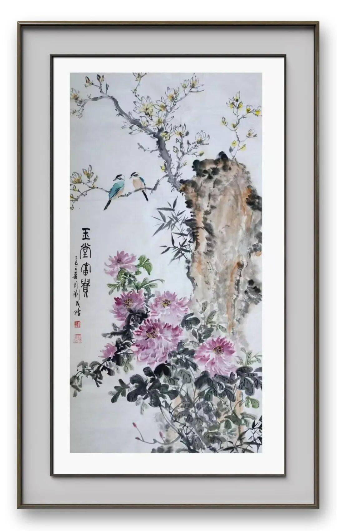 细细品赏,方能领略先生画作的精妙之处。画中花鸟仿佛被赋予了生命,枝头的喜鹊翘首远望,似在期盼远方归人;花间的蝴蝶翩跹流连,似在追寻芬芳踪迹,一动一静皆充满生活情趣。每一根羽毛的纹理、每一片花瓣的脉络,都刻画得入木三分,观者仿佛能触摸到羽毛的柔软,嗅到花香的清甜。即便画幅宏大,先生亦能驾驭自如,近景的细腻与远景的苍茫相映成趣,工笔的精致与写意的洒脱完美结合,山水、花鸟、生灵在纸上和谐共生,构成一幅浑然天成的自然画卷。