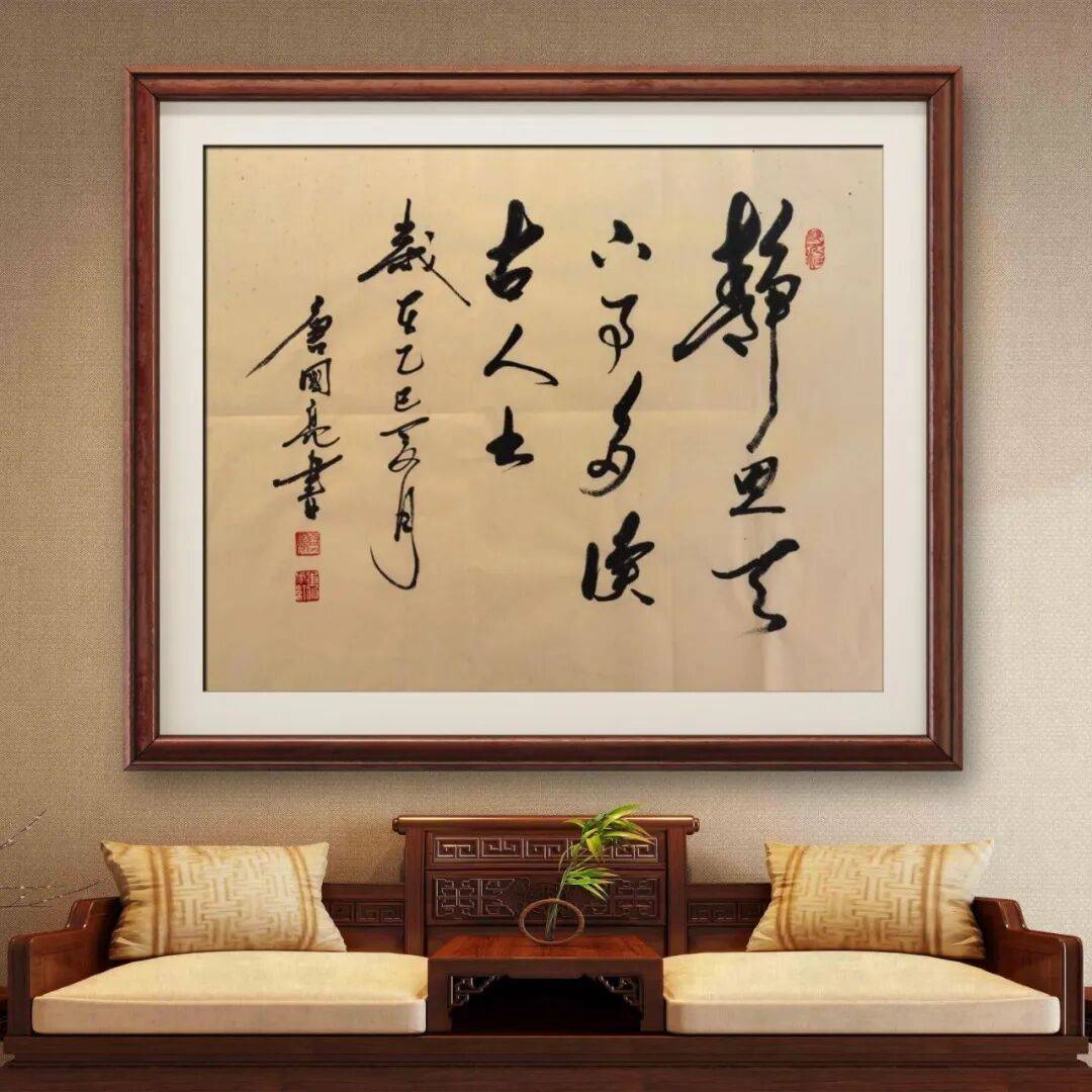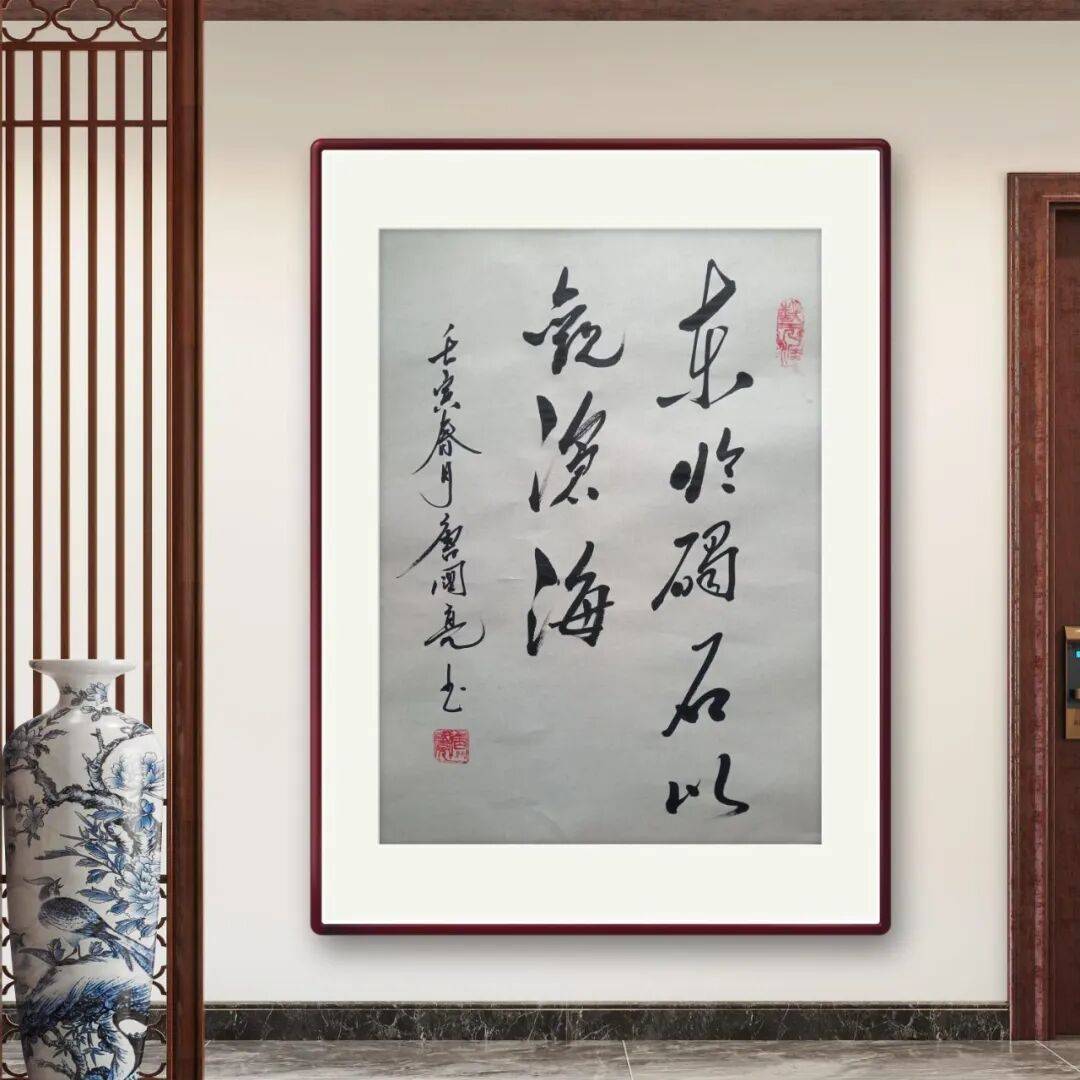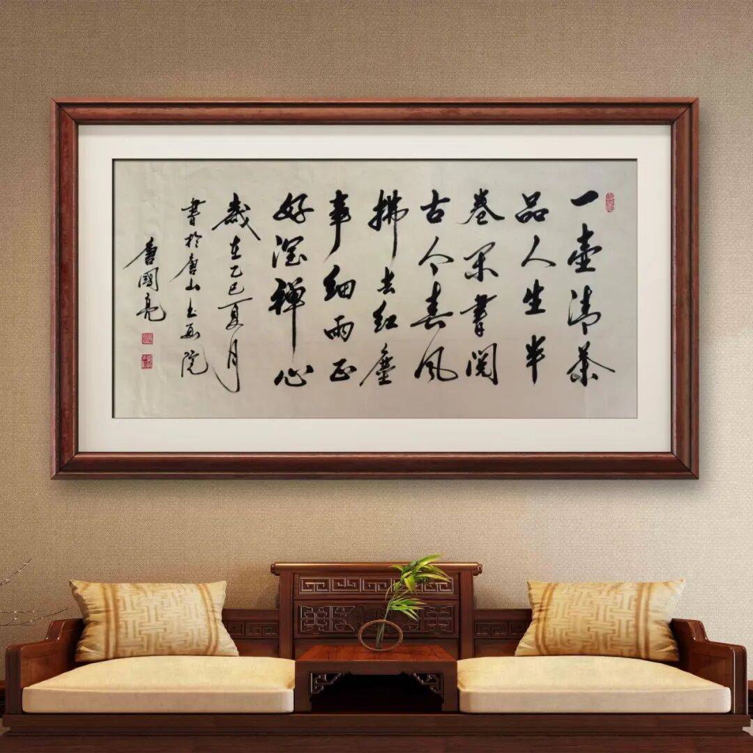 唐国亮先生的书法艺术,不仅在于笔墨技巧的精湛,更在于其作品中蕴含的深厚文化内涵与鲜明的精神品格。先生自幼深受中国传统文化的熏陶,对诗词、绘画、哲学等领域都有广泛的涉猎与深入的研究,这些文化素养潜移默化地融入到其书法创作之中,使作品具有了超越笔墨本身的文化底蕴。其作品多以经典诗词、名言警句为书写内容,在笔墨的挥洒之间,既传递了文字本身的思想内涵,又融入了先生对传统文化的理解与感悟,使作品兼具艺术之美与思想之深。其书法笔墨雄浑有力,结体端庄大气,既展现了书法艺术的雄浑之美,又传递出包容万物、刚正不阿的精神追求,使观者在欣赏书法艺术的同时,也能感受到传统文化的精神力量。