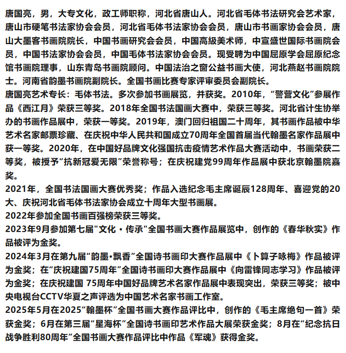 书法艺术的追求是永无止境的,唐国亮先生的书法艺术也在不断探索与发展之中。相信在未来的创作中,先生将继续深耕传统,勇于创新,在笔墨之间不断探索新的艺术境界,创作出更多兼具传统意蕴与时代精神的优秀作品,为当代书坛注入新的活力。