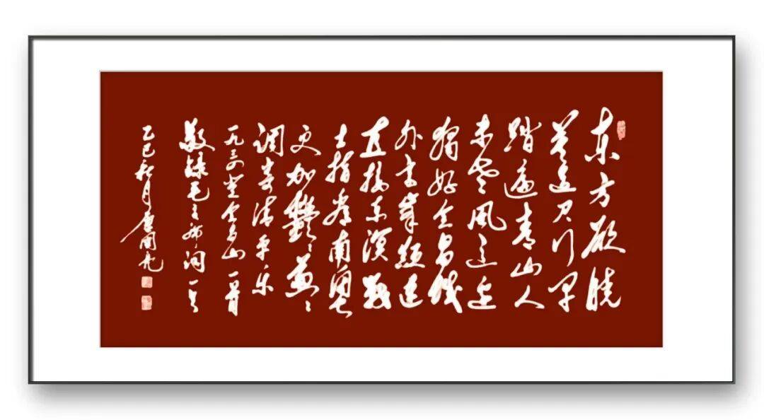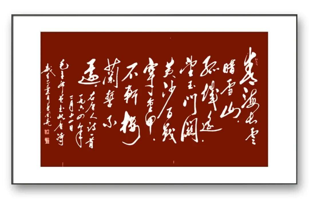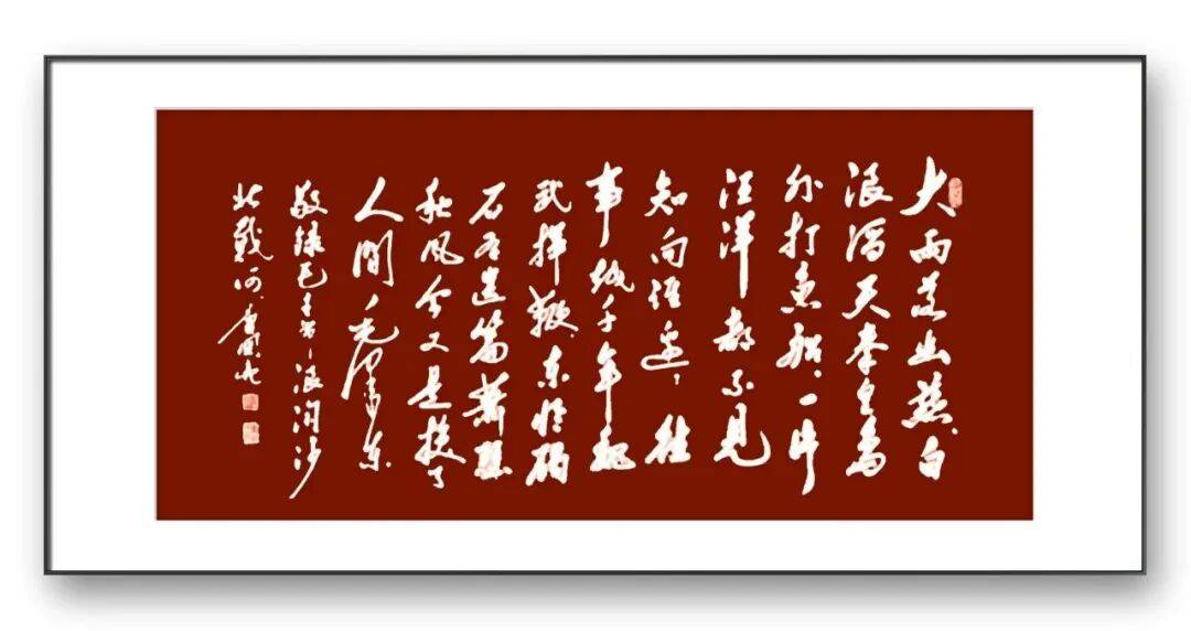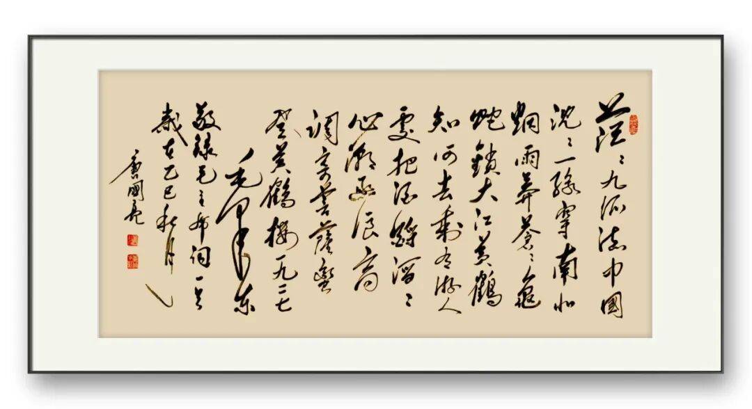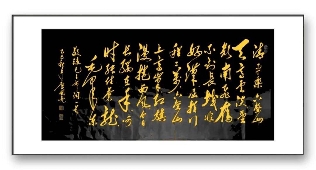 墨法的运用是唐国亮先生书法艺术的又一亮点。先生深谙墨分五色之理,在作品中巧妙运用焦、浓、重、淡、清五种墨色,使作品层次丰富,意境深远。在其草书作品中,墨色的变化尤为丰富,时而浓墨重彩,力透纸背;时而淡墨轻描,空灵飘逸;时而焦墨渴笔,苍劲老辣;时而涨墨晕染,韵味无穷。墨色的对比与过渡自然和谐,与笔法、结体相互映衬,共同营造出富有变化的视觉效果与艺术意境。其草书,开篇以浓墨重笔起势,奠定雄浑奔放的基调,随着情感的推进,墨色逐渐由浓转淡,笔画由粗变细,到结尾处又以浓墨收笔,首尾呼应,使作品在视觉上富有节奏感,同时也生动展现了诗歌跌宕起伏的情感变化,达到了笔墨与情感、内容的完美融合。