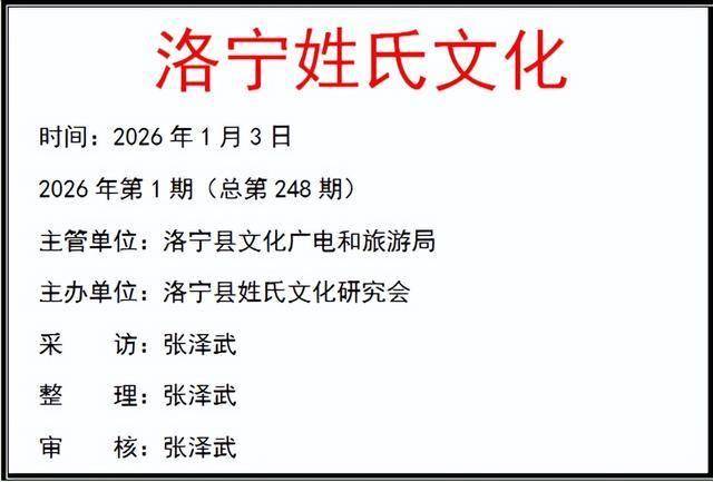 作者简介:张泽武,洛宁县陈吴乡新寨村人,2003年,发起并成功组织成立了洛宁县姓氏文化研究会,担任常务副会长兼秘书长一职,2006年参与组织筹备成立洛阳市姓氏文化研究会,任副秘书长。2017年被推举为洛宁县姓氏文化研究会会长。2024年8月再次当选为洛宁县姓氏文化研究会会长。