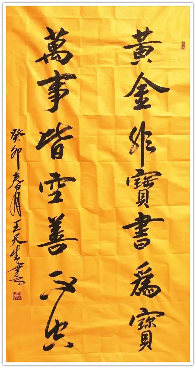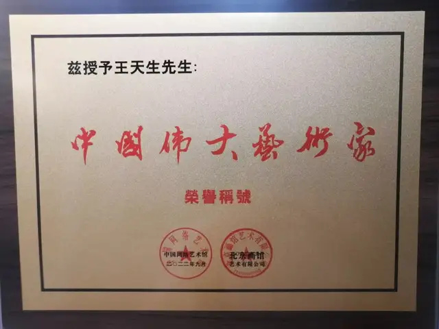 經中華人民共和國文化髙級職稱國家高級美術師職稱評審委員會舉辦的書法類資質的考核,一致認定王天生書法作品潤格爲: 300000元/平方尺