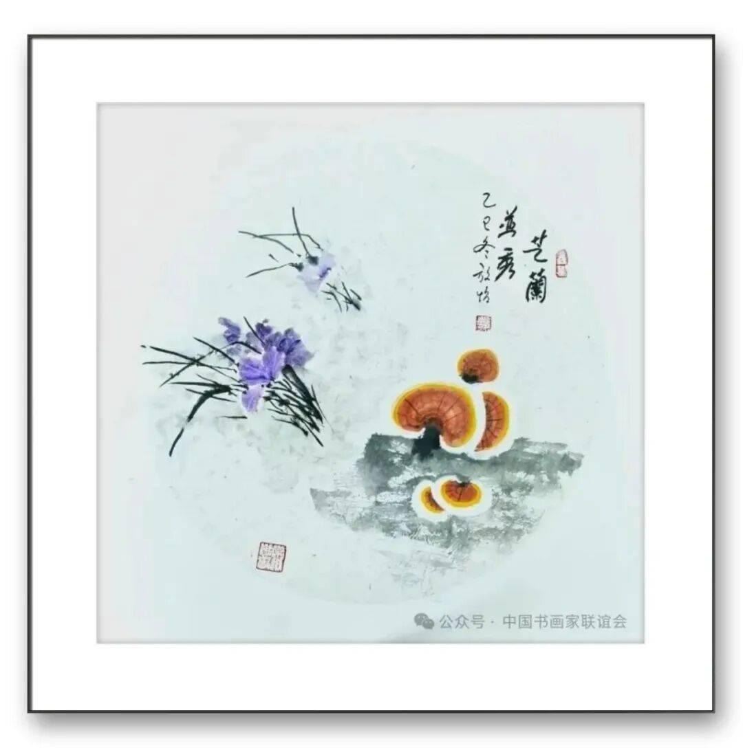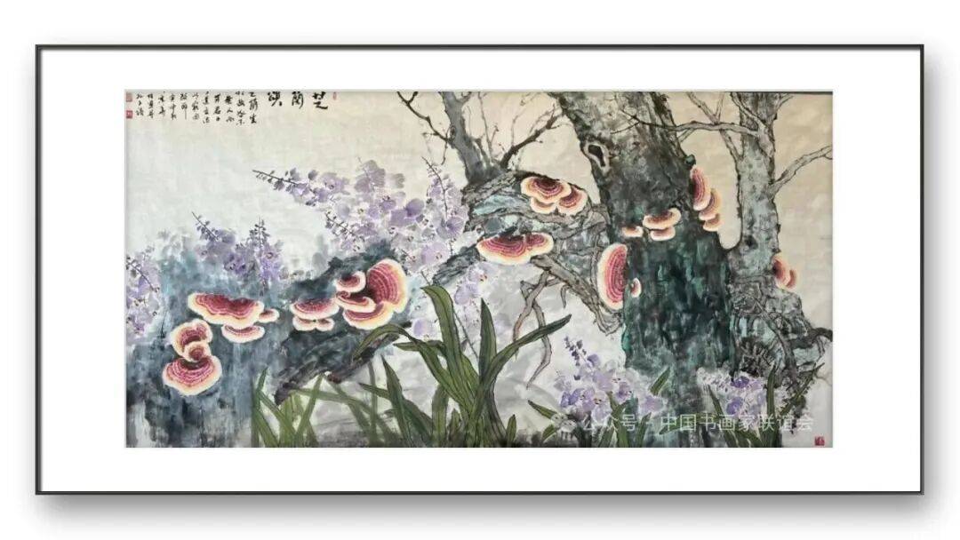 他将灵芝与兰花巧妙搭配,灵芝挺拔向上,兰花婉转多姿,一刚一柔,相互映衬,画面疏密得当,意境清雅;他以开阔的构图,将多株灵芝置于山水之间,云雾缭绕,溪流潺潺,灵芝在自然的滋养中蓬勃生长,展现出一派祥和喜庆的景象。同时,张放怡还注重题材的时代性,将灵芝题材与当代社会的精神需求相结合,创作出一系列兼具思想性与艺术性的作品。在他的笔下,灵芝不再仅仅是吉祥的象征,更成为坚韧不拔、蓬勃向上的时代精神的载体,传递出积极向上的正能量。