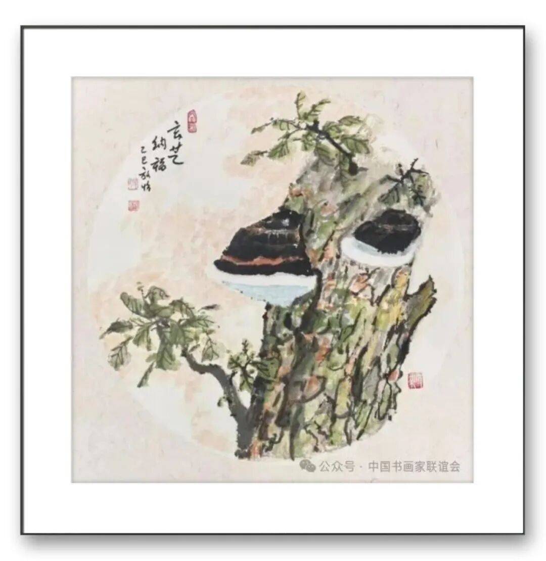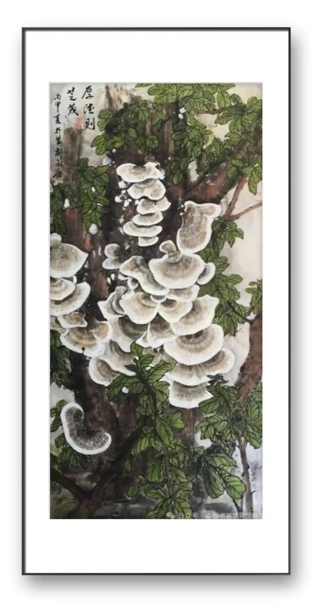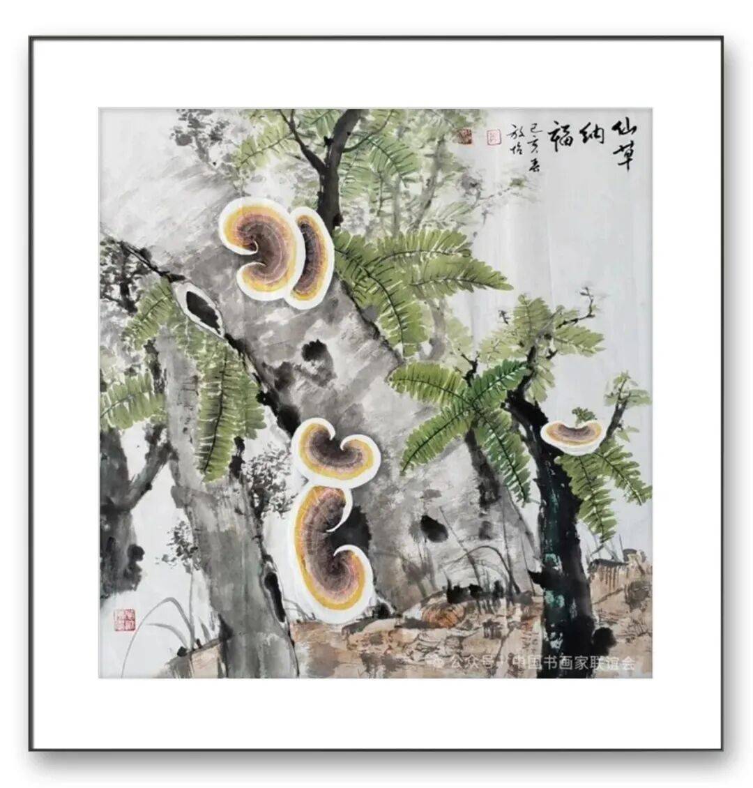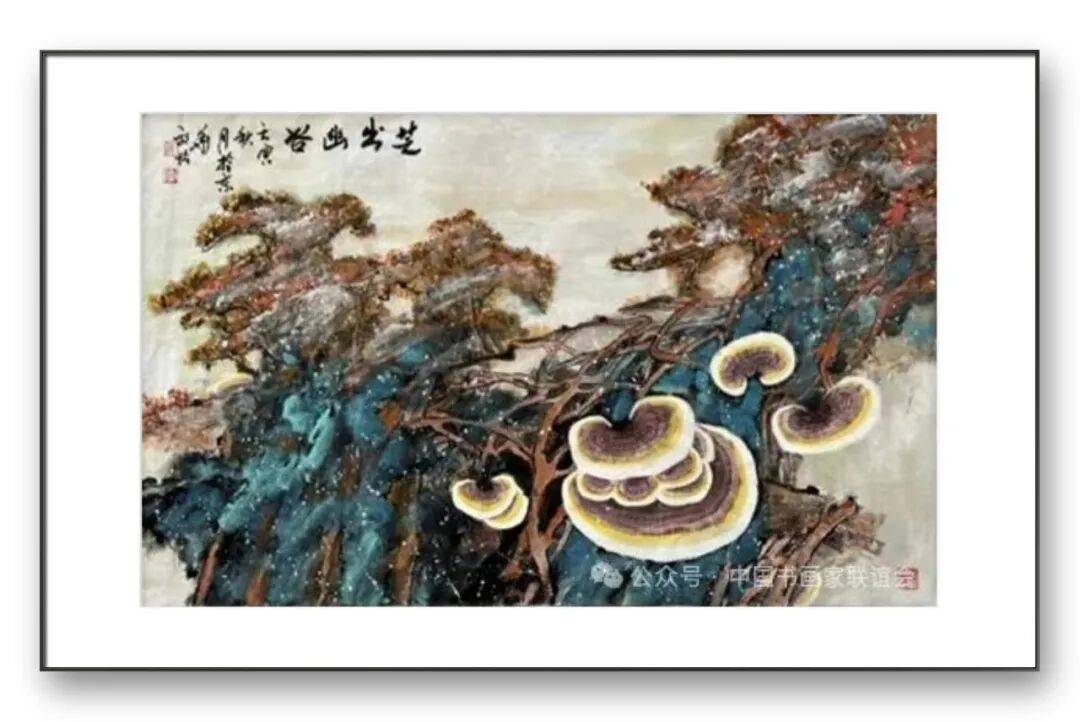 构图与题材的拓展,是张放怡灵芝画派的另一大特色。传统的灵芝题材创作,多以单株灵芝或简单的组合形式出现,构图相对单一。张放怡突破了这一局限,将灵芝置于广阔的自然语境中,与山水、花鸟、虫鱼等元素有机结合,构建出丰富多样、意境深远的画面。他的构图既遵循传统的“疏密相间、虚实相生”原则,又融入现代构成理念,注重画面的平衡感与节奏感。