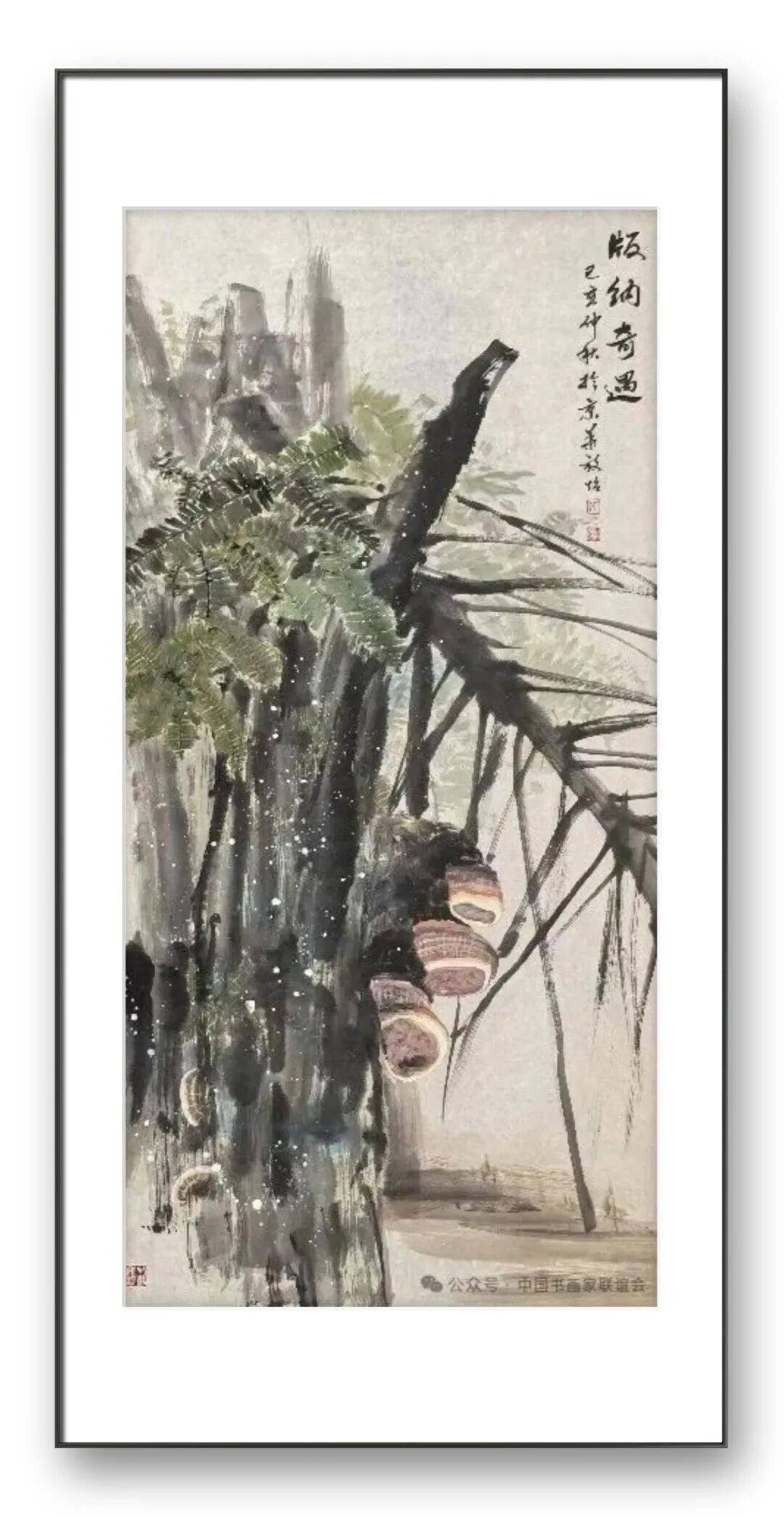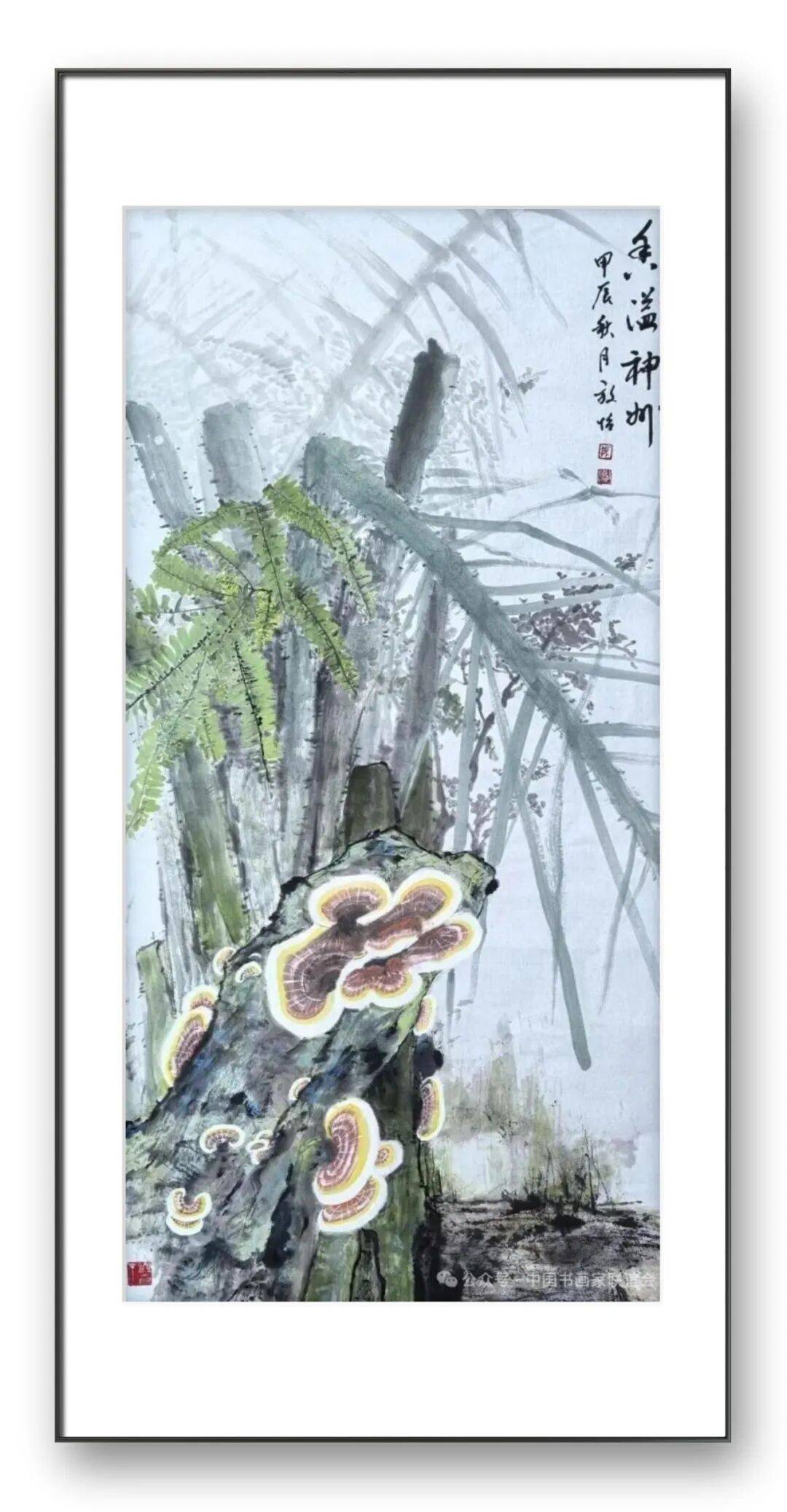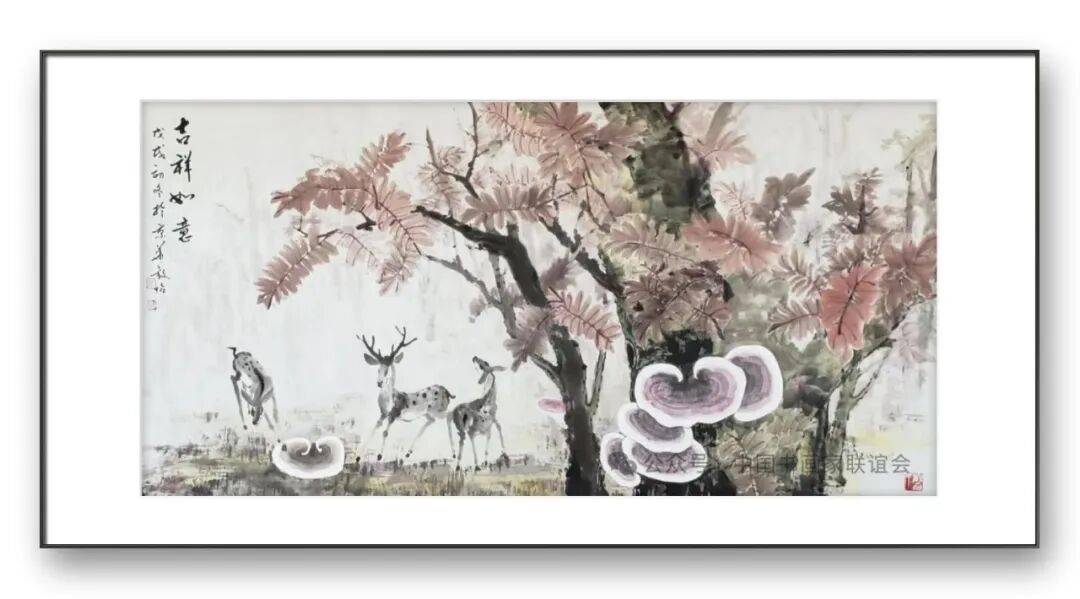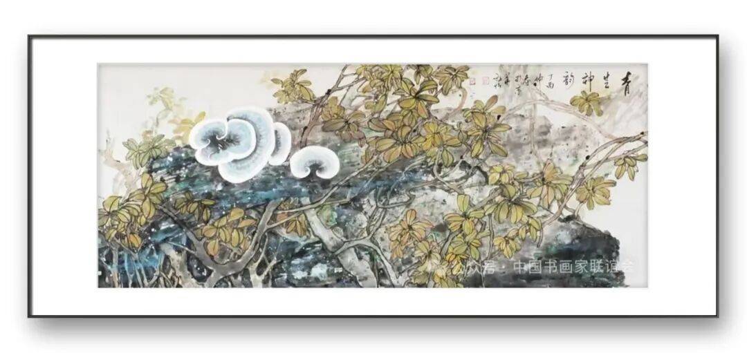 构图与题材的拓展,是张放怡灵芝画派的另一大特色。传统的灵芝题材创作,多以单株灵芝或简单的组合形式出现,构图相对单一。张放怡突破了这一局限,将灵芝置于广阔的自然语境中,与山水、花鸟、虫鱼等元素有机结合,构建出丰富多样、意境深远的画面。他的构图既遵循传统的“疏密相间、虚实相生”原则,又融入现代构成理念,注重画面的平衡感与节奏感。