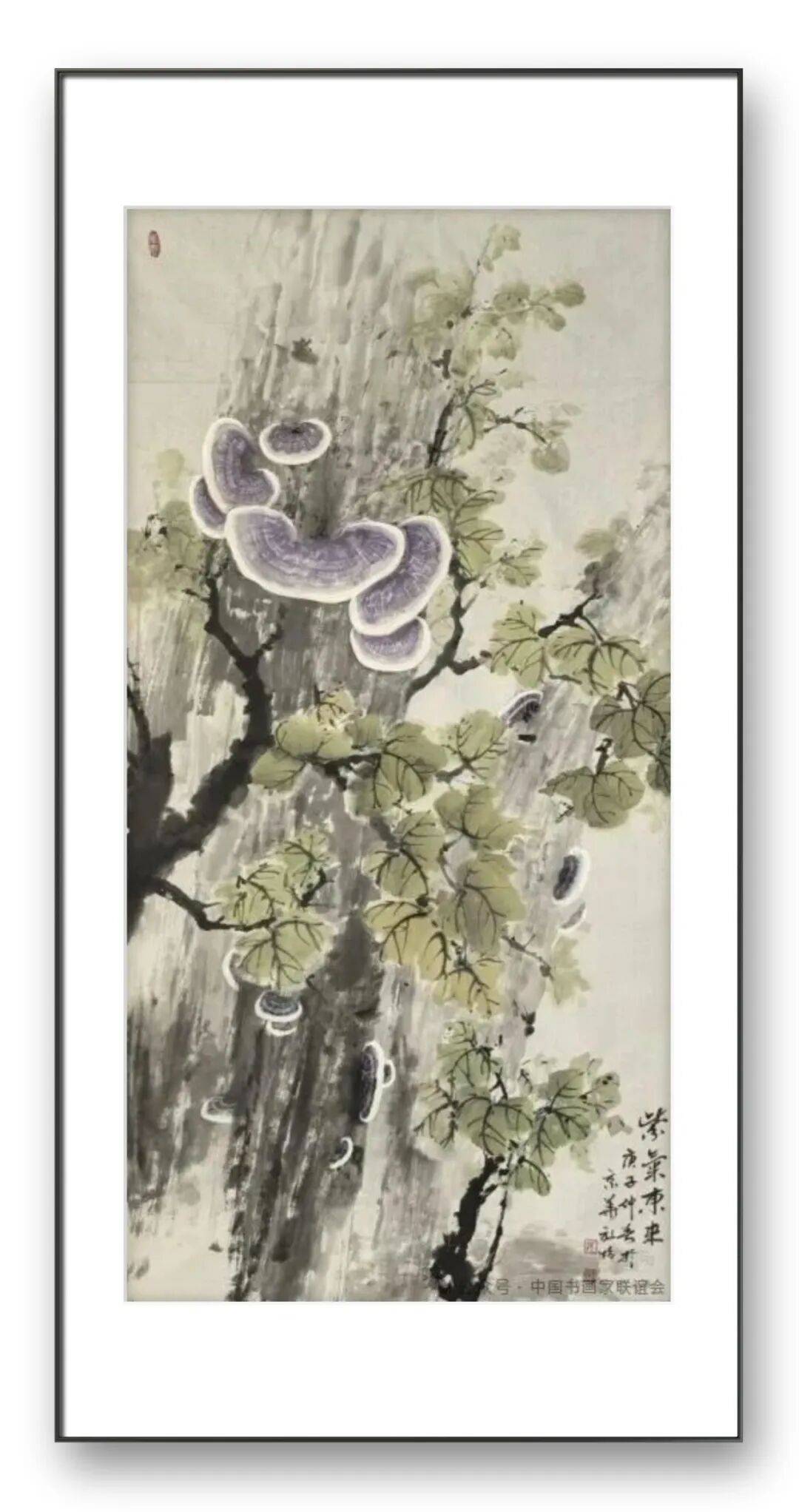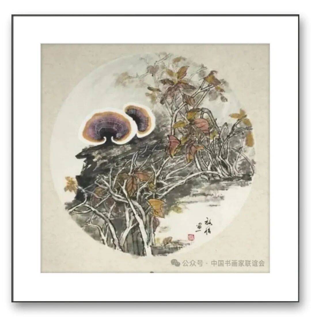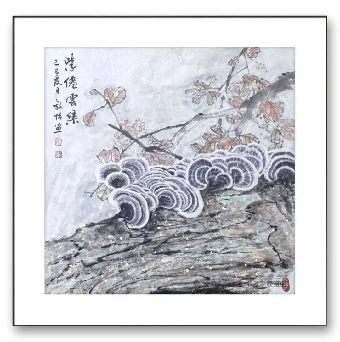 色彩的运用上,张放怡的作品既保留了传统水墨画的素雅之美,又融入了鲜明的时代色彩,形成了淡雅清新、明快活泼的色彩风格。传统的灵芝画多以墨色为主,色彩相对单调。张放怡在继承传统的基础上,大胆运用色彩,以淡彩、粉彩等技法,为灵芝赋予了丰富的色彩。他笔下的灵芝,或呈浅紫,或呈淡红,或呈嫩黄,色彩柔和温润,与墨色相互交融,既表现出灵芝的自然之美,又增添了画面的生动性与感染力。