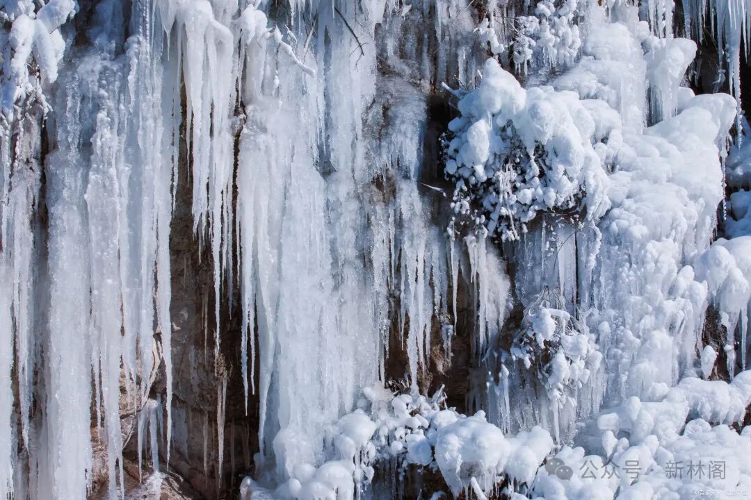 站在冰瀑之侧,回望来路,又是另一番震撼。冰瀑并非孤绝的存在,它被一整片“冬眠”的森林拥抱着。落叶乔木褪尽了繁华,枝干黢黑如铁,以极富张力的线条分割着天空;常绿的松柏则成了雪的重点眷顾对象,每一簇针叶都托着厚厚的雪,沉甸甸地低垂着,形成一个个完美的雪团。最奇妙的是那些灌木的枯枝,冰凌包裹着它们每一处细微的转折,毛茸茸、亮晶晶的,仿佛一夜之间,春风误入了冬的领地,催开了满树晶莹的“琼花”。风起时,枝头的雪簌簌落下,扬起一片迷蒙的雪雾,阳光偶尔从云隙漏下几缕,穿过这雪雾,便有了形状,像探向人间的、温柔的光的手指。