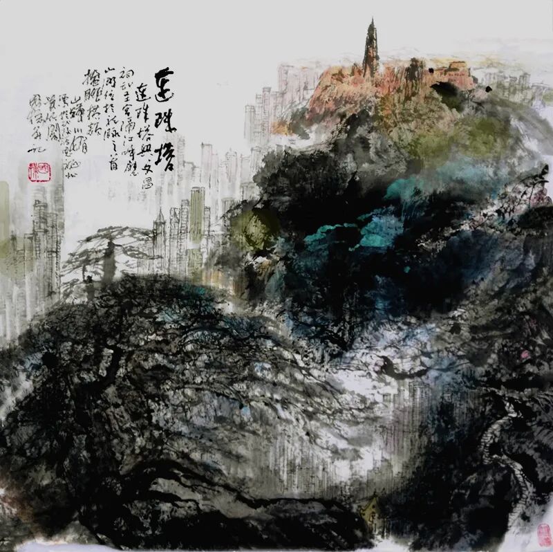 《连珠塔》中国画 80CMX79CM
