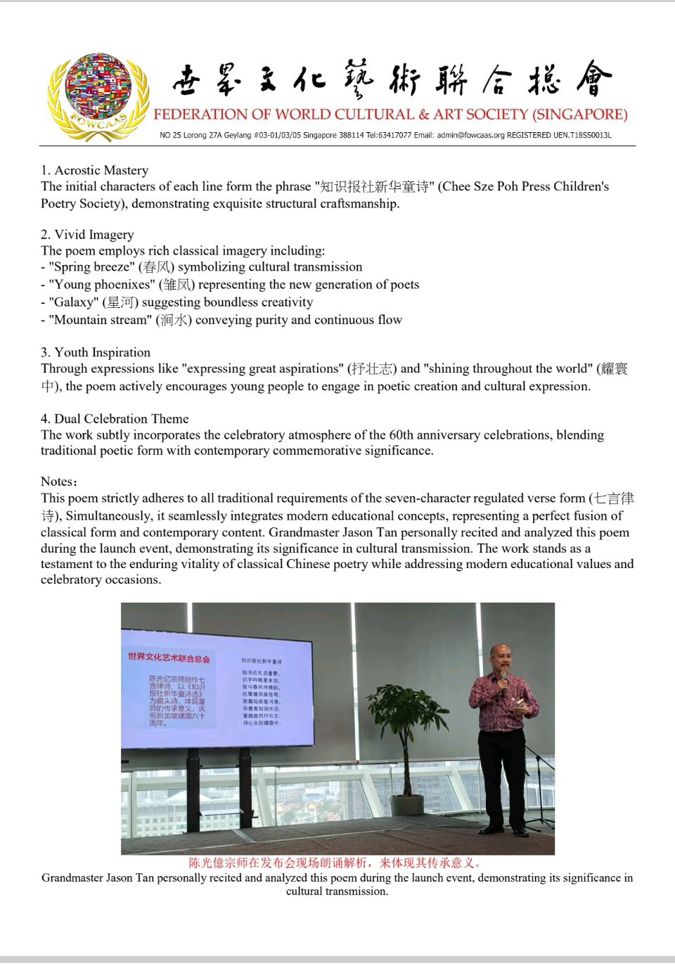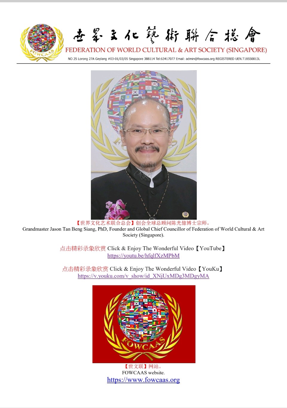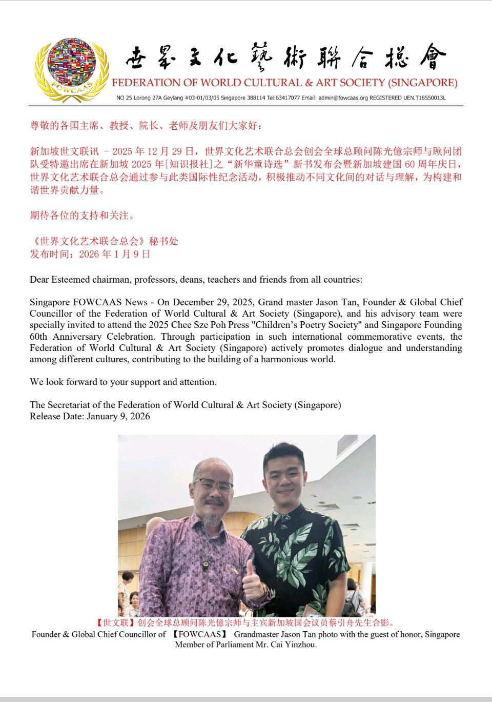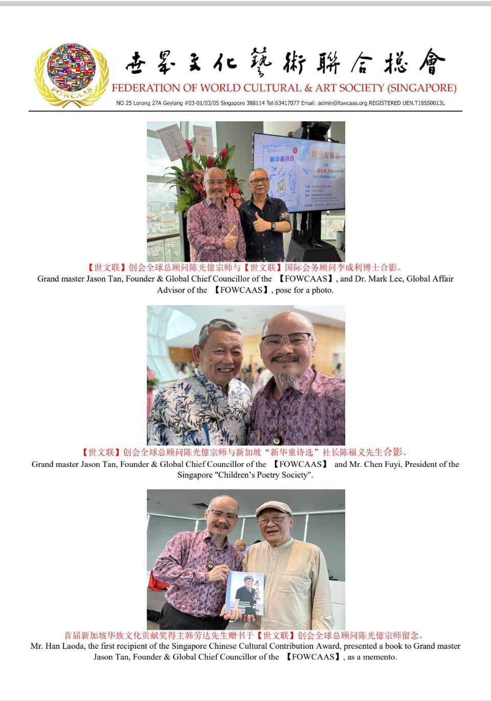 Grandmaster Jason Tan, Founder & Global Chief Councillor of【FOWCAAS】was specially invited to attend the launch of the new book "Chee Sze Poh Press" and the Singapore Founding 60th Anniversary
