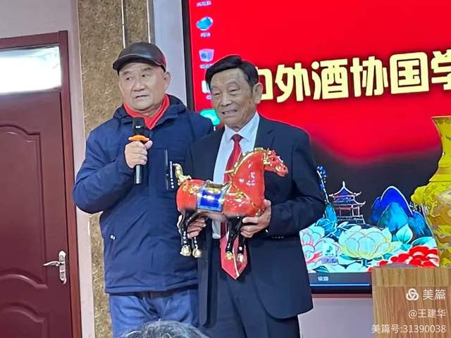 李福民主席代表中外酒协向中外酒协法律顾问委员会会长、庆典活动赞助人徐谊操先生赠送礼物,祝福马到成功!龙马精神!马上发財!