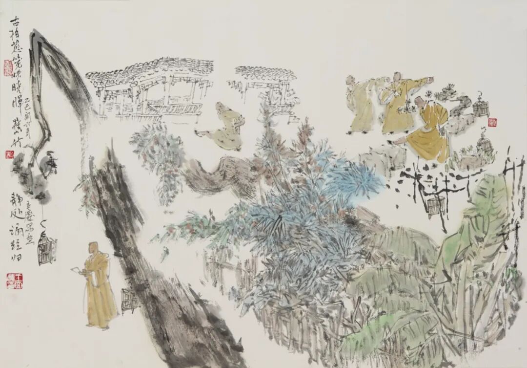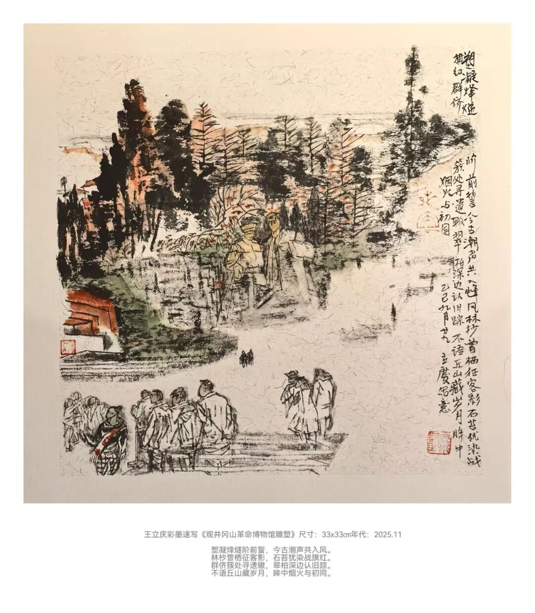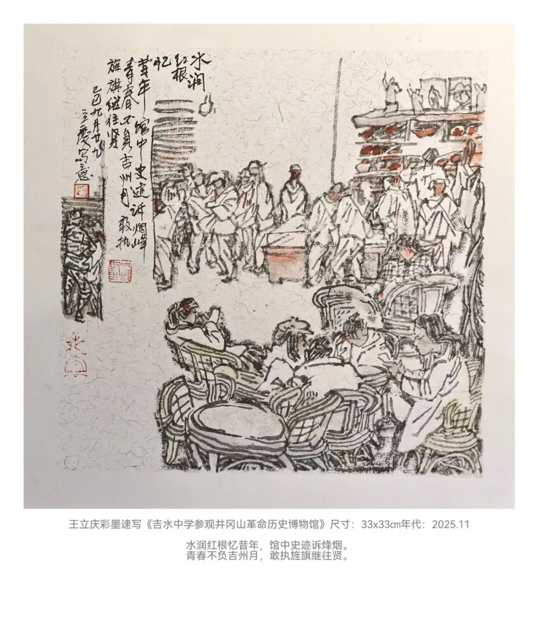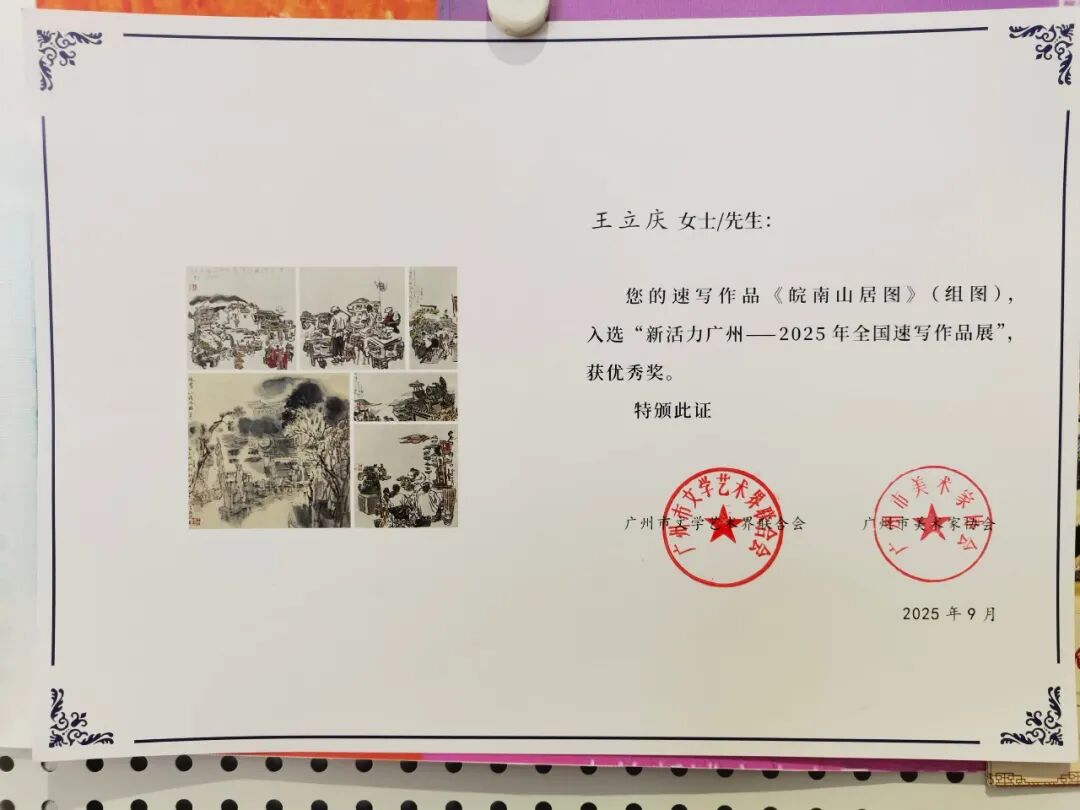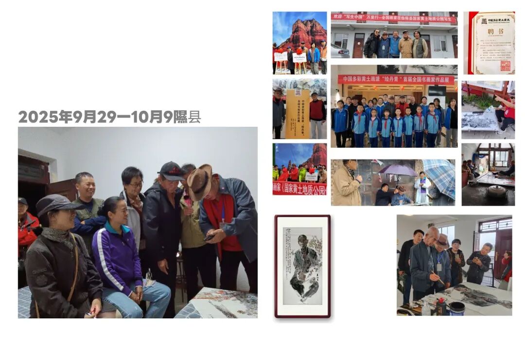 创作实践中,怀《为人民而创作》的初心走遍大江南北,足迹印刻下万千风物的鲜活印记。从肇庆的椰风海韵里捕捉南国的明媚光影,到港珠澳大湾区的活力浪潮中定格时代的蓬勃气象;自山西隰县牵头组建中国多彩黄土画派,扎根黄土高原的厚重肌理描摹塬上风情,再到江西井冈山的红色热土间追怀峥嵘岁月,以笔墨致敬革命先辈的赤诚初心。此外,还探访湖南道州,在青瓦白墙间打捞传统文脉;漫步安徽皖南水墨村落,勾勒江南温婉诗意;感触陕北吴堡的苍凉厚重,品味浙江龙泉的青瓷雅韵,沉醉楠溪江的灵秀山水,山河万象皆化作笔下灵感。同时应邀参与石竹斋复业60周年作品征集,在交流中夯实专业根基。作品入选第五届《新活力广州》全国速写作品展并斩获优秀奖,跻身中华全国总工会主办的《丹青史诗·百年经纬》等重量级展览。深度参与中国美院周刚教授主导的《大年初三》陕北过大年写生和《周刚、方也艺术家工作室跨年送福》等活动,加入中欧艺术家驻村创作项目,在田间地头和黄土高坡汲取鲜活养分。作品先后亮相《大河汤汤黄河国际水彩画双年展》《湖山传诗 · 音画相融|中欧艺术家驻地创作展》和西湖艺术博览会及永嘉图书馆跨年巡展,以丹青笔墨绘就新时代的艺术风华,传递对家国山河的赤诚热爱。
