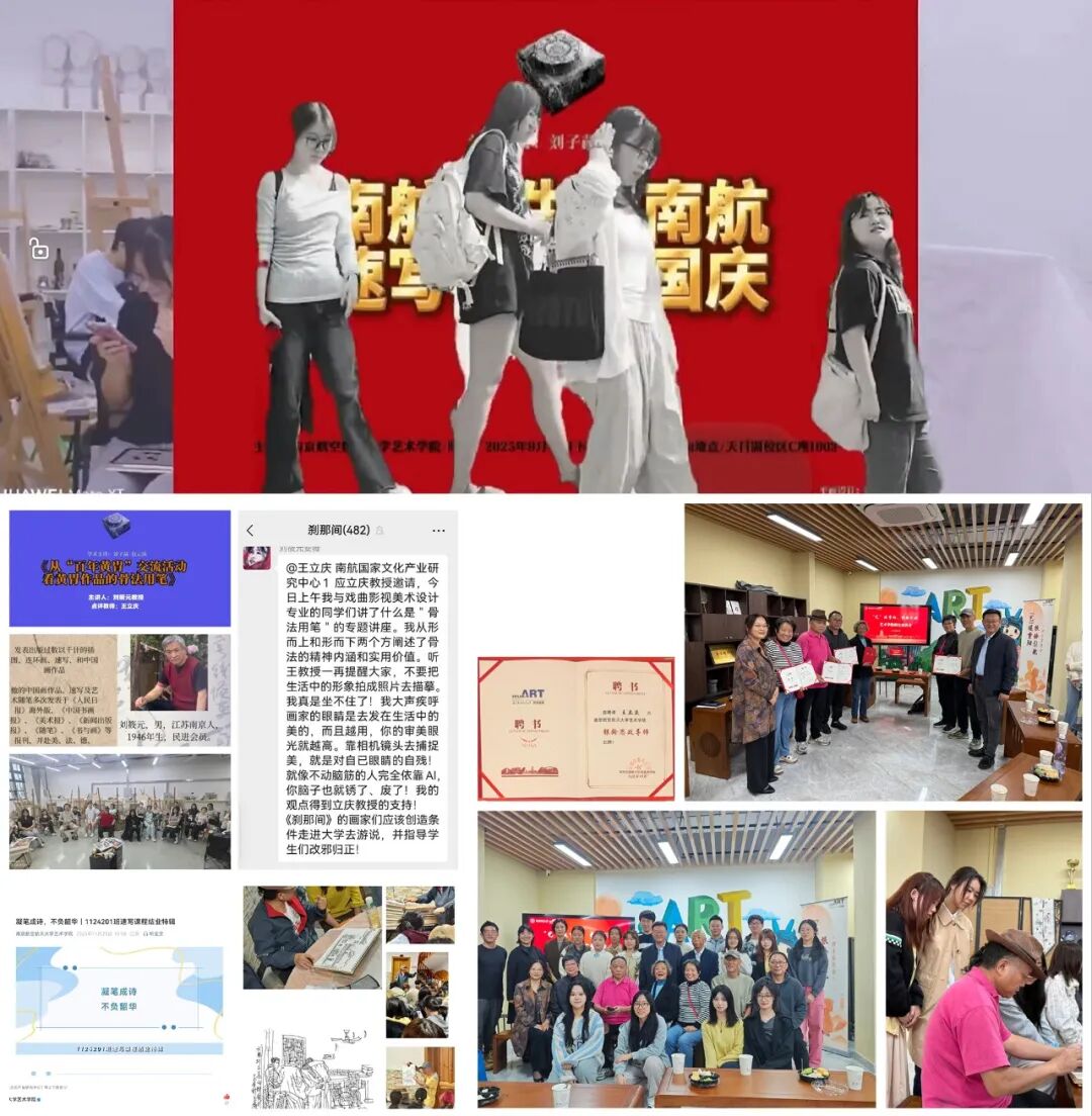 教学领域,秉持“立德树人”初心深耕课堂,将AI绘图、数字艺术分析等前沿技术融入《快速表达》《速写》核心课程,打破传统教学边界,推动手绘技法与现代科技深度融合。课后搭建线上答疑渠道开展个性化辅导,精准对接学生专业痛点;自担费用邀请桂德彪、许卫国等企业导师及画家刘筱元教授进校园举办专题讲座,为学子打通从课堂到行业的认知链路。同时牵头组织“南航师生画南航”写生活动,借校庆、国庆等重要节点开展主题创作,让思政教育在笔墨挥洒间润物无声;以“手绘+自媒体”双轨并行的理念躬身示范,全年参与20余场省市级以上交流展览,运营自媒体《马上行》八年来累计发表百余篇专业稿件,为学生树立知行合一的艺术榜样。