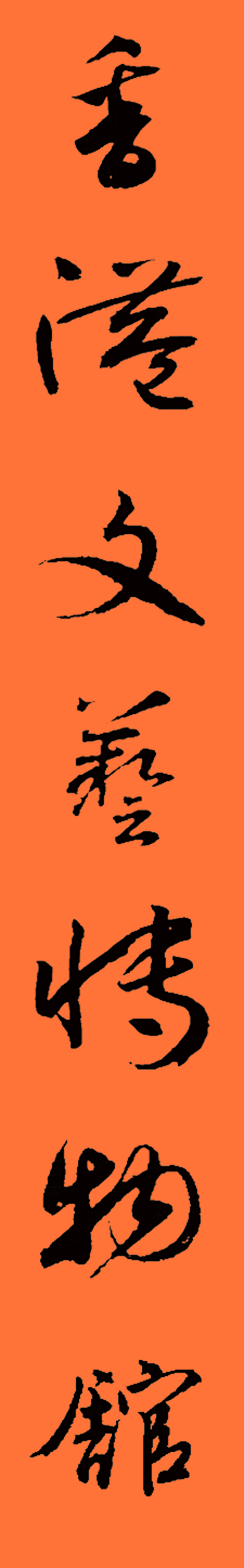 墨法运用可圈可点。浓墨处如重锤敲鼓,铿锵有力,凸显出书法的精神内核;淡墨处则似轻纱拂面,若有若无,为作品增添了几分空灵与朦胧之美。墨色的自然过渡与变化,使整个题字仿佛具有了生命的气息,在橙色背景上跃动、呼吸。从文化传承的角度来看,这幅草书题字是中华传统文化精髓的生动体现。草书作为中国书法艺术中的重要书体,有着悠久的历史和深厚的文化底蕴。谭延桐以草书为香港文艺博物馆题字,是对这一古老艺术形式的传承与弘扬。每一个笔画都承载着中华文化的基因,让参观者在欣赏题字的同时,感受到中华文化的源远流长和博大精深。