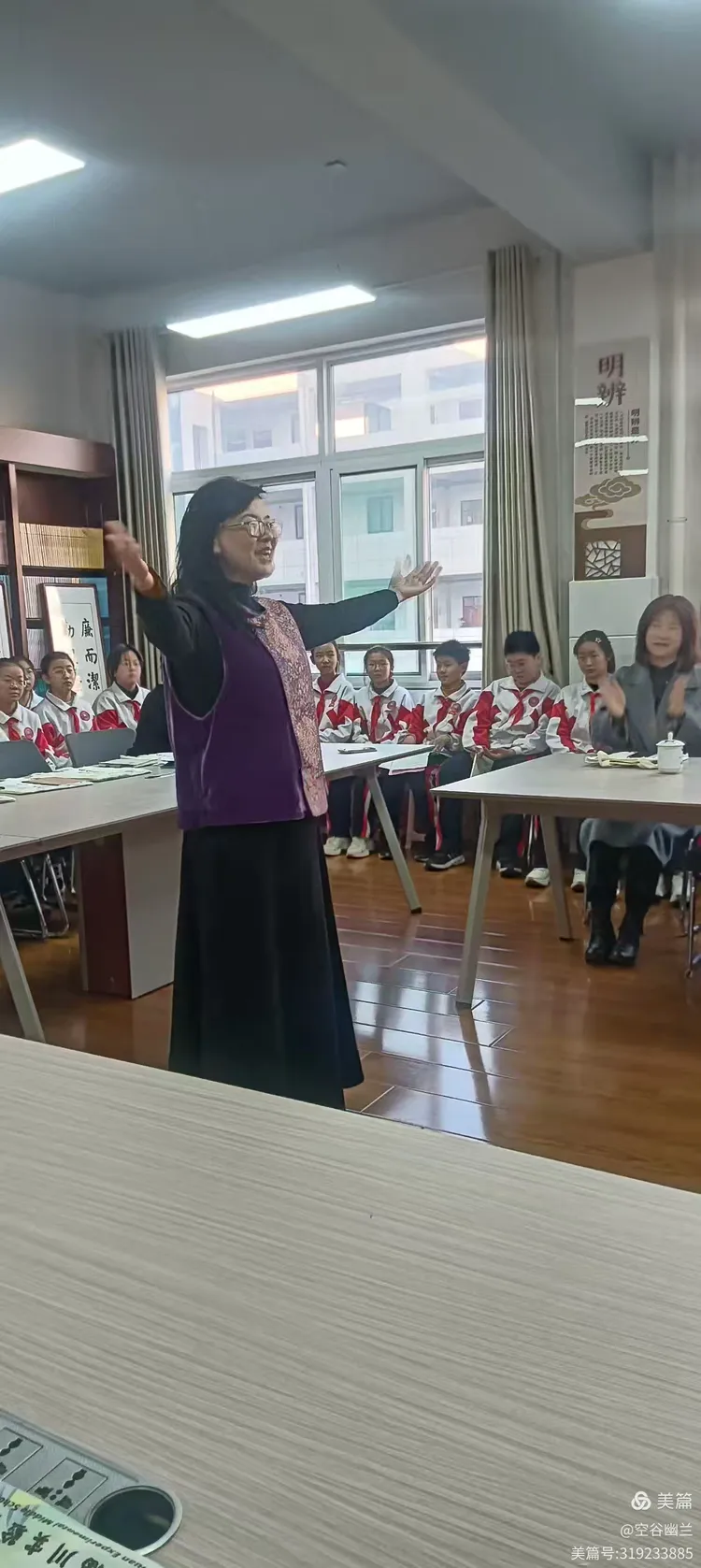 初三孩子以少年特有的激昂与热情演绎着《土地的誓言》,准确的传递着作者对故土的眷恋,对侵略者的愤怒及誓死抗争的决心。初一孩子用纯净的童声诠释着对《春江花月夜》的理解,他们声情并茂的表达,为大家勾勒出了一幅澄澈空灵的月夜画卷,宋守娟老师则用吟诵的方式与孩子们进行了唱和。他们共同把对良辰美景的热爱、对生命绵延的豁达进行了深情的表达。让现场成了诗词的海洋。
