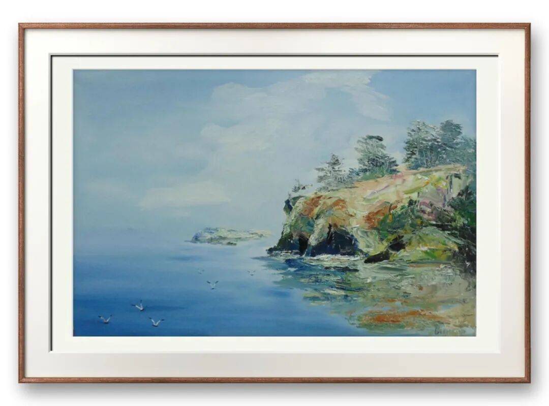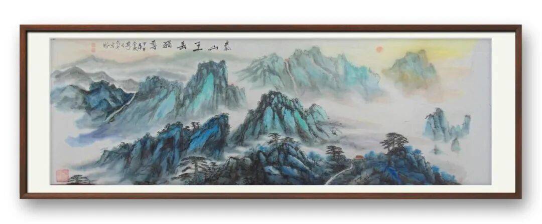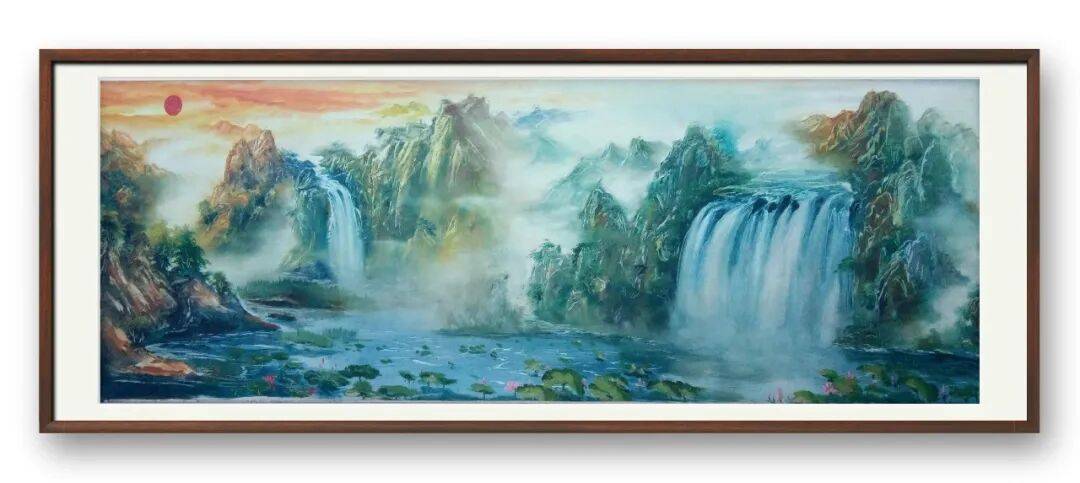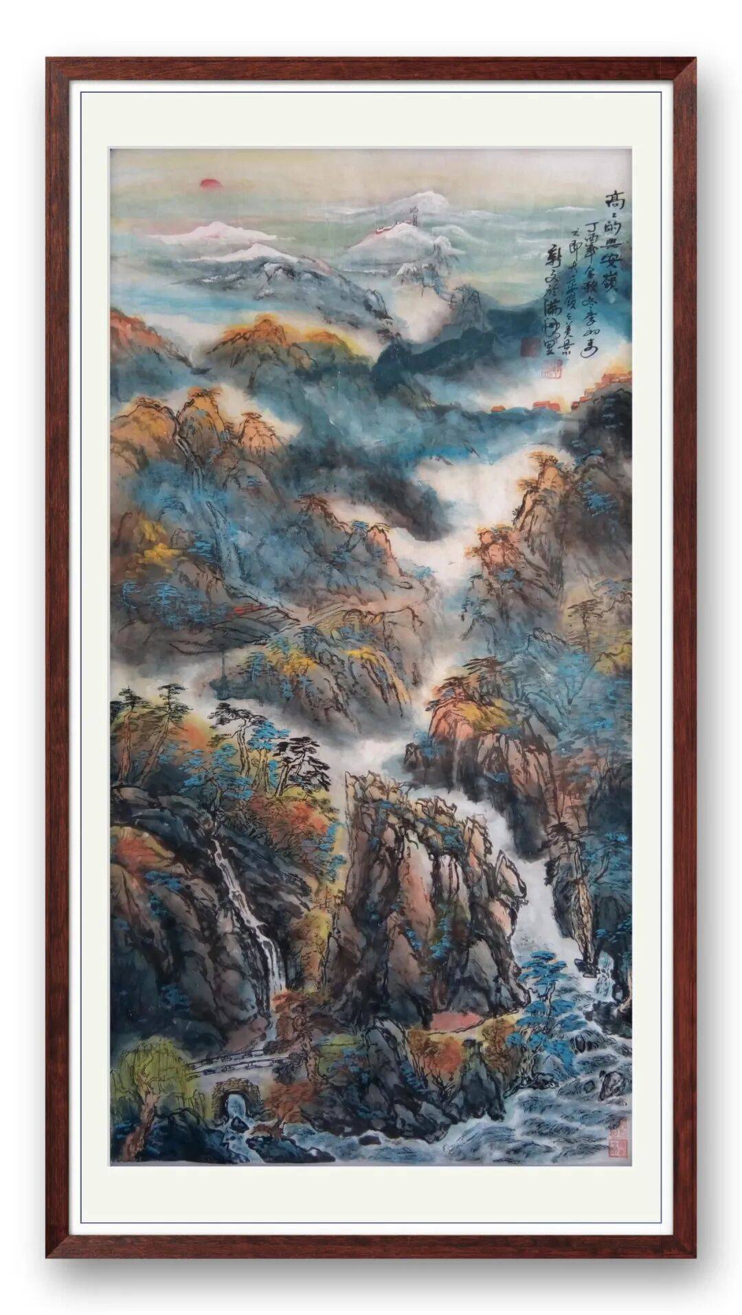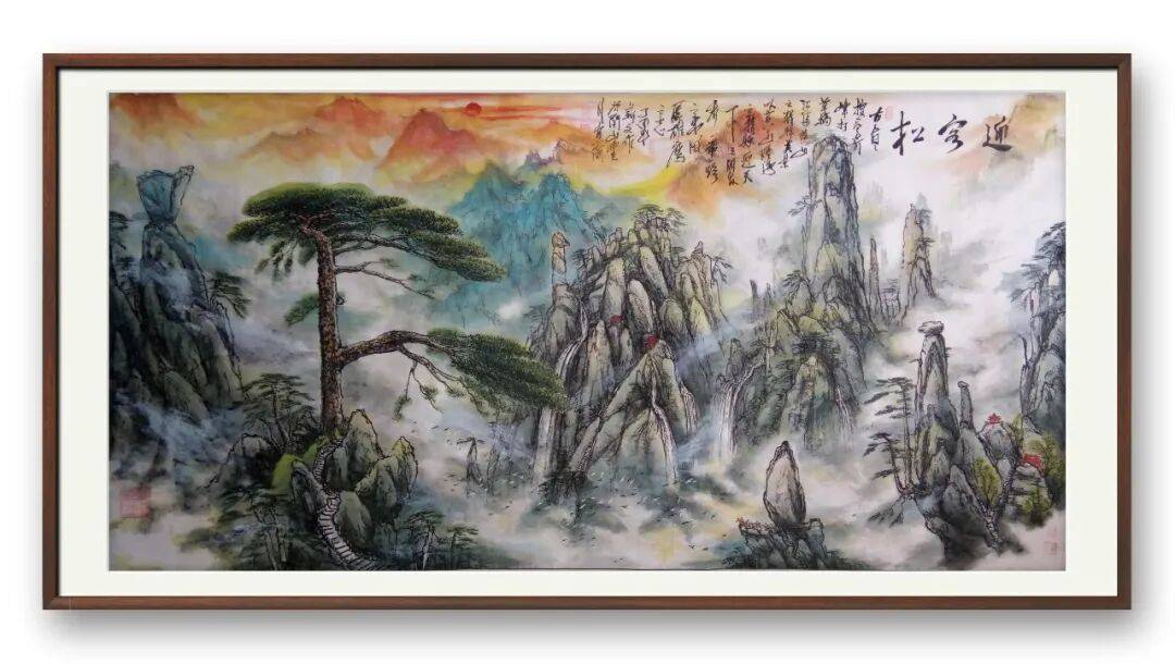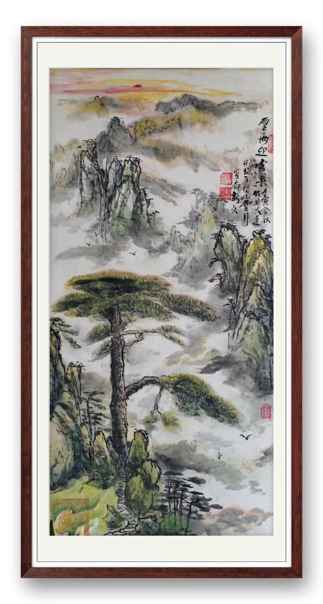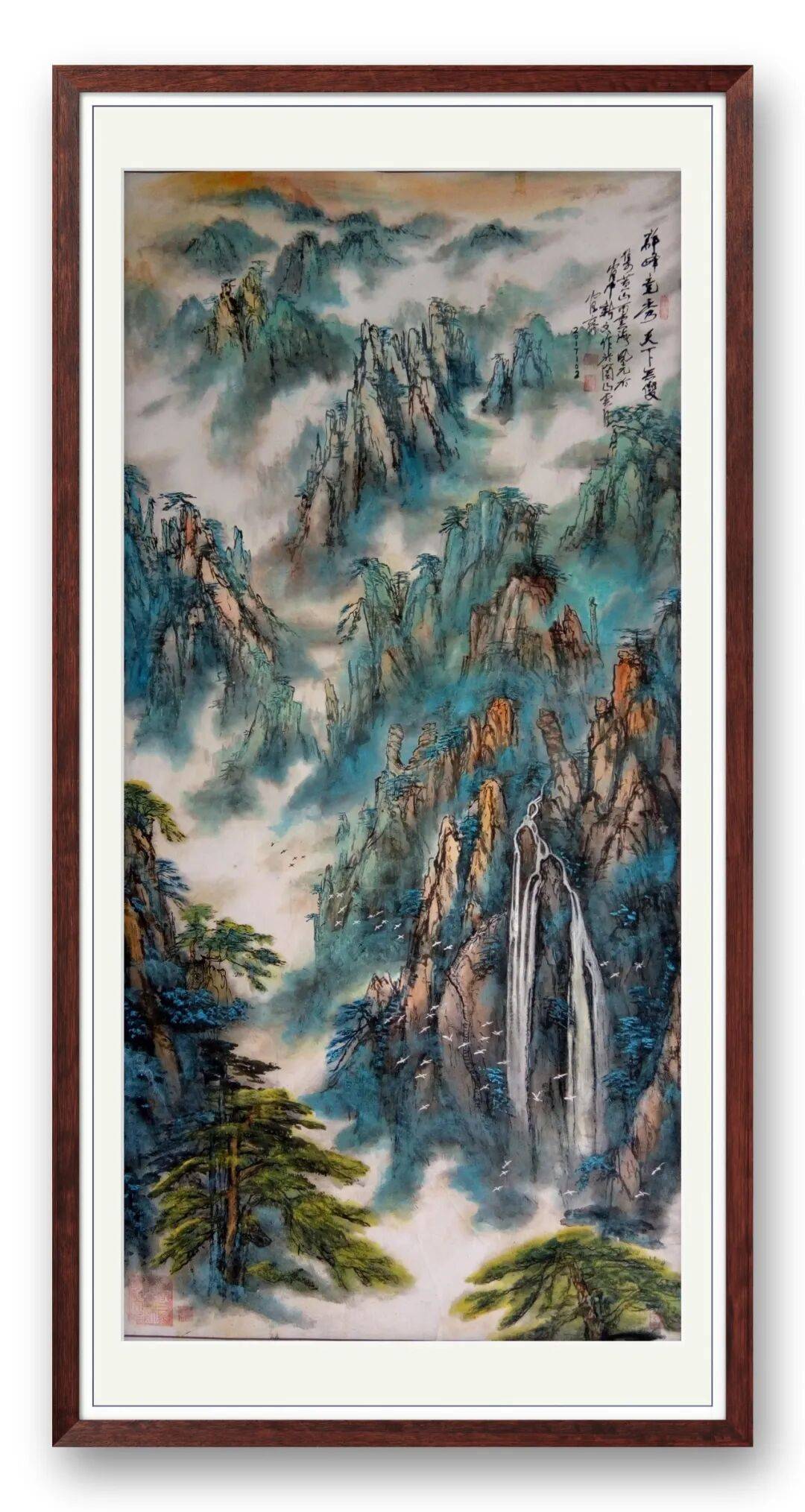 关新文的山水画,是对自然本真的敬畏与重构。他深谙“外师造化,中得心源”之道,将北国山川的雄浑与江南水汽的温润熔于一炉。笔下黄山如《黄山松烟映瀑霞》,以皴擦点染的古法勾勒山石肌理,松枝虬劲如铁,瀑流奔涌似弦,云海漫卷若烟,既见范宽式的沉雄气象,又含黄公望的淡远意境。笔墨间藏着岁月沉淀的厚重,线条不浮不躁,墨色层次丰富,焦浓淡清的变化间,让山川既有可游可居的写实质感,又有超然物外的精神意趣。尤为难得的是其对空间的把控,以“三远法”为骨,留白为气,使咫尺画卷藏千里之势,观之如临溪山,心生澄明。