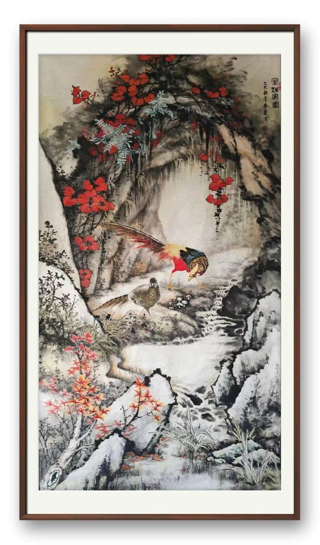 先生国画作品《金秋家园》整体气象丰厚而温润,以秋日山林为背景,将自然景致与生命情感巧妙融汇,呈现出一幅兼具诗意与叙事意味的家园图景。王衍东老师以“金秋”为时间节点,不仅着力描绘季节的色彩变化,更通过画面中生动的生灵与山水结构,传达出安定、和美、丰收与守望并存的精神内涵。作品初观即给人以充实而不拥塞、热烈而不浮躁的审美感受,显示出作者对整体气韵的良好把控。