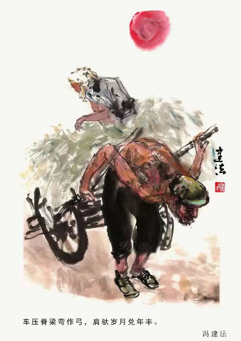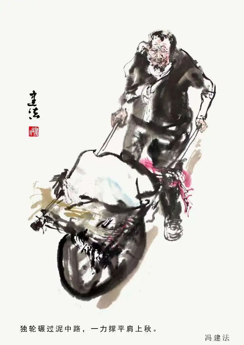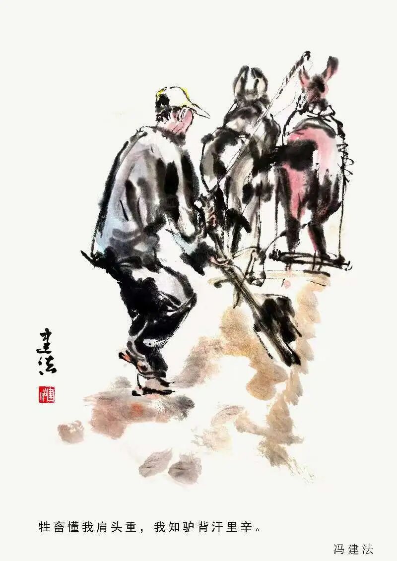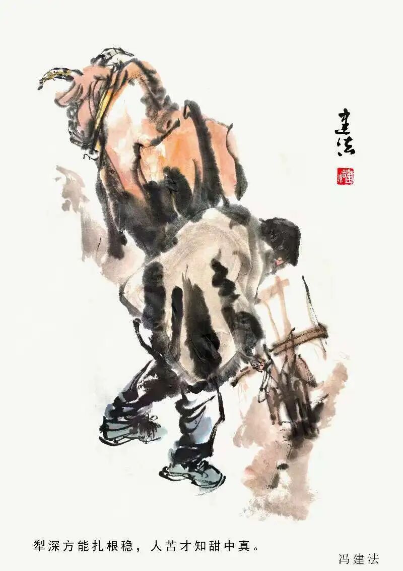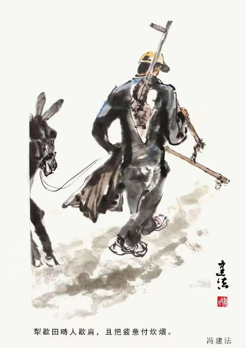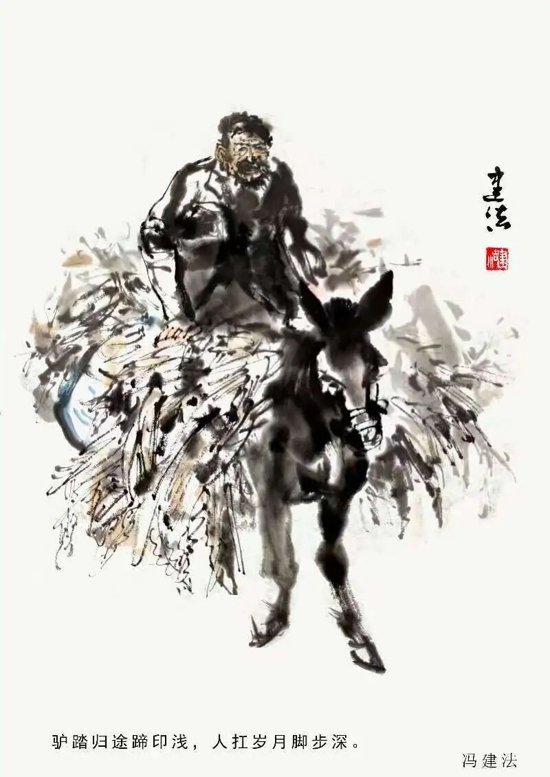 冯建法太行农耕系列作品,既是对太行石刻艺术之水墨转译,亦是对大写意人物画之时代革新。他以石刻风骨立水墨之体,以太行耕魂铸作品之魂,令太行题材大写意人物画于传统与现代之碰撞中焕新生命力,亦为当代中国水墨人物画之地域化、个性化探索提供极具价值之艺术范式。