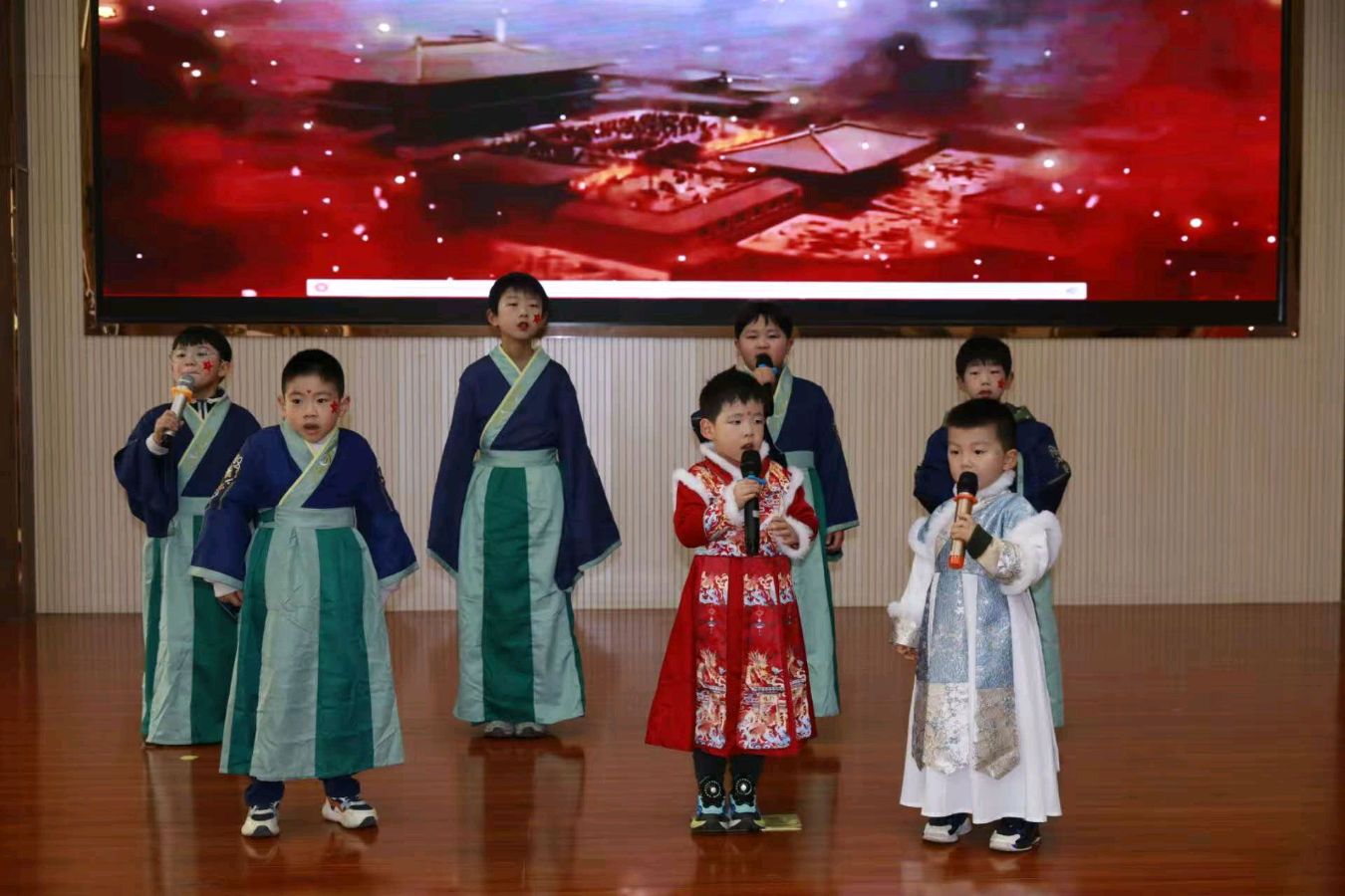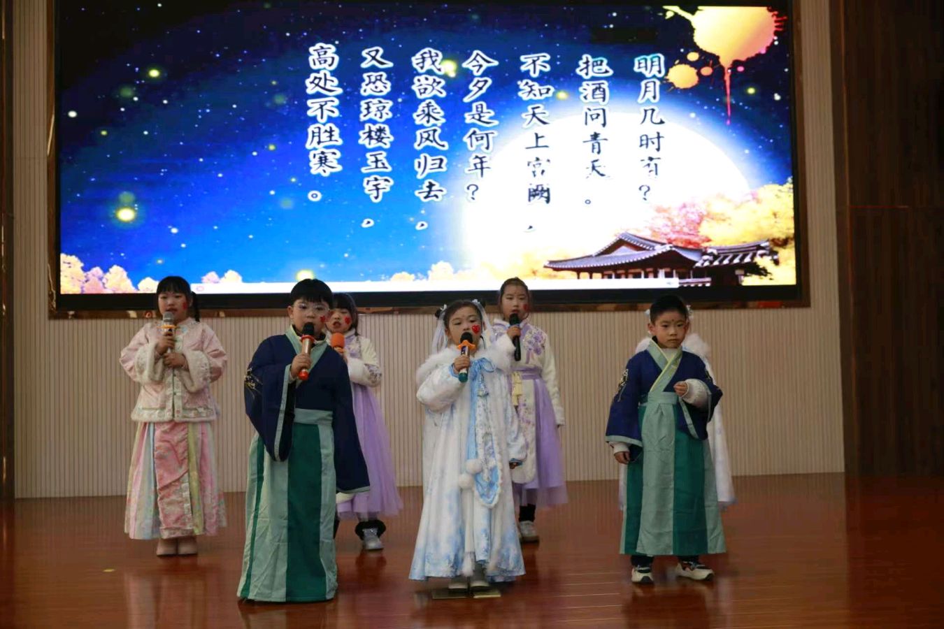 经典诵读《我来教,你来读》以大龄学员领诵、小龄学员跟诵的“传帮带”形式,身着汉服的孩童接力诵读《说文解字白文》(第5页)、《三字经》(第33-36页)、《小儿语》(第1-2页)节选,汉服雅韵配经典琅琅,尽显蒙学经典的韵律之美与智慧之光,彰显学员间互助共进的良好氛围;小组合唱《明月几时有》,学员汉服加身,配古典乐器伴奏视频,空灵歌声诉说苏轼词作中的思念与哲思,传递古典诗词永恒魅力;《我的中国心》以小组合唱搭配现场电子管演奏,汉服少年歌声真挚,抒发中华儿女对祖国的无限眷恋与赤诚之心。