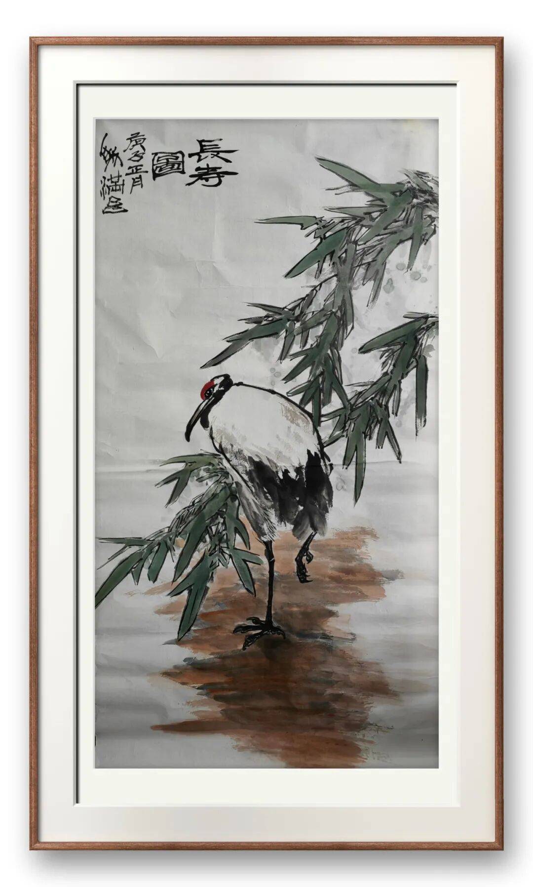 画鹤则寄情于姿,鹤为禽中君子,承载高洁长寿之意。马满昌将清雅追求融入笔墨,笔下之鹤或工或写,工笔纤毫毕现,写意墨色氤氲,常以松竹流云为衬,让鹤之清逸与景物苍茫相融,既含祈福之意,又抒超脱之怀,实现物象与心境的契合。