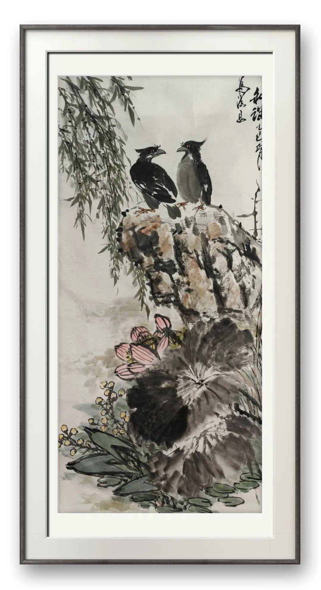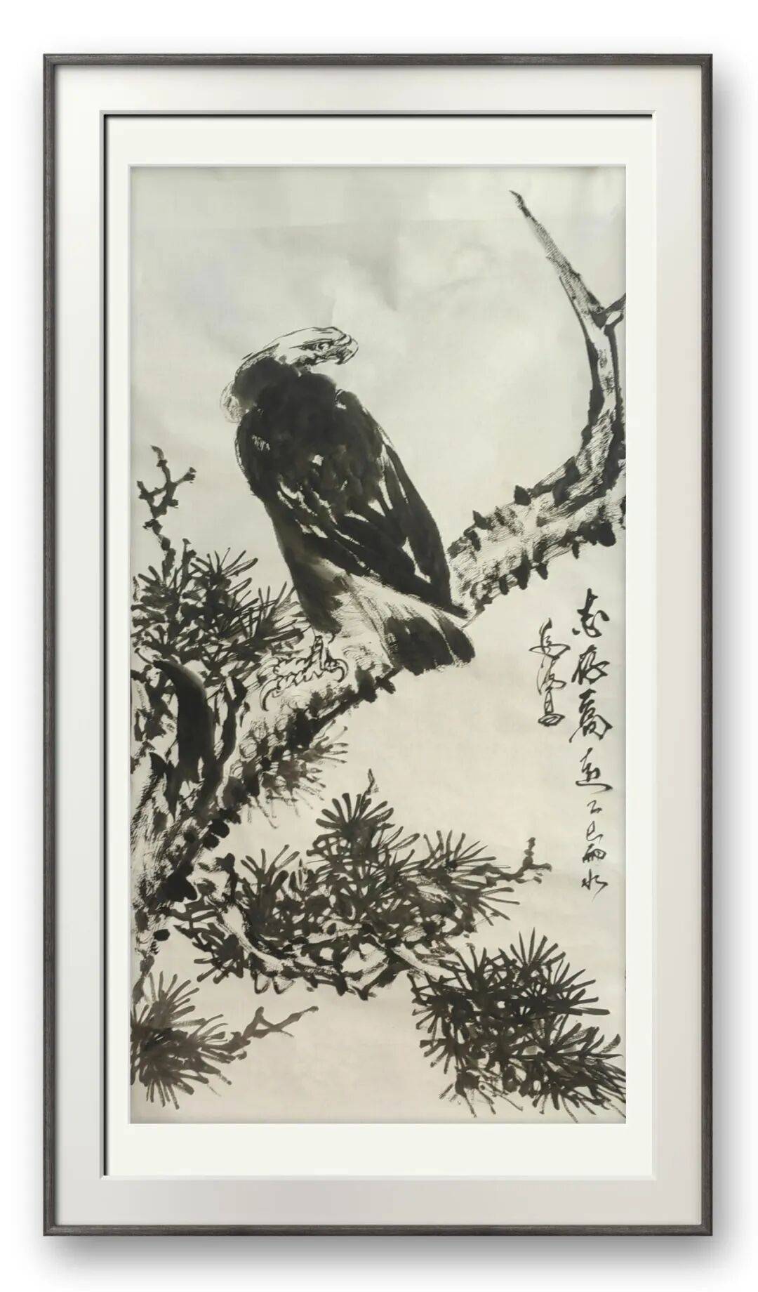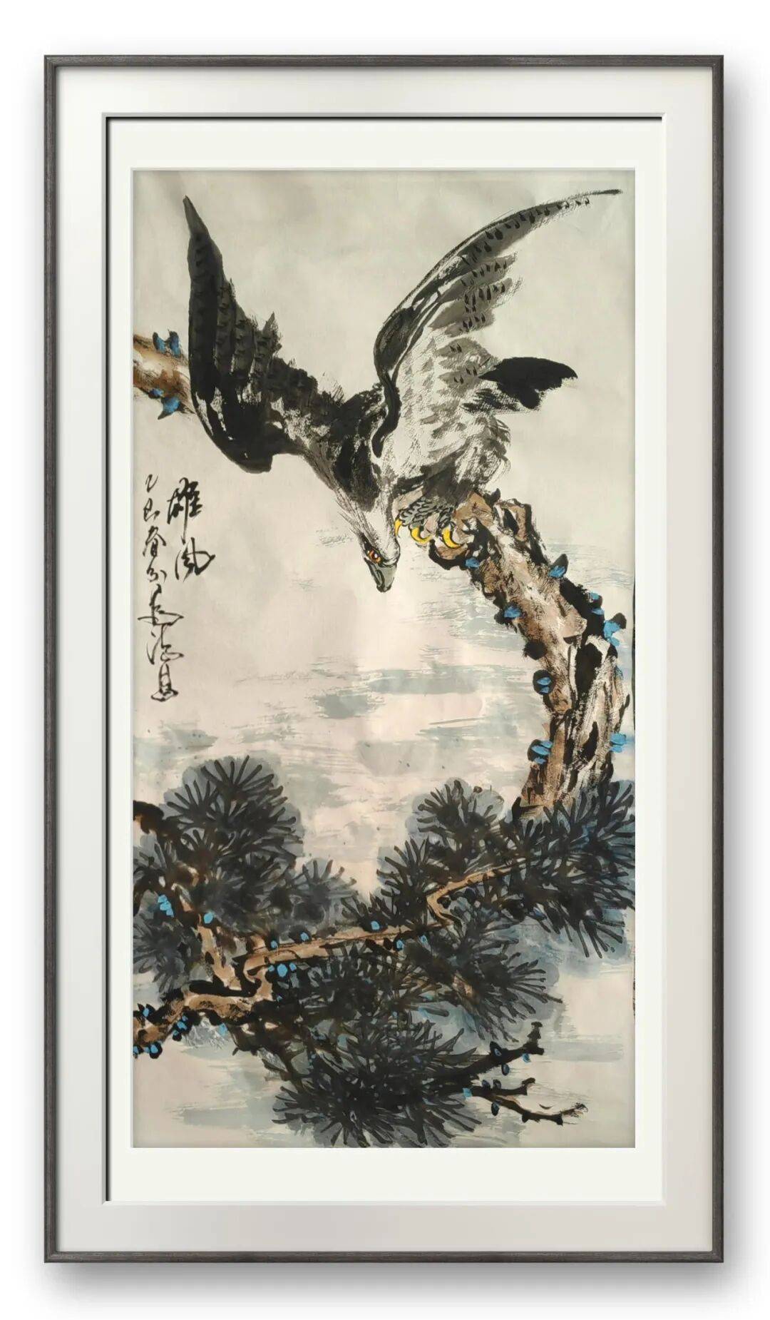 画鹰更彰刚毅风骨,这亦是其拿手题材。他以焦墨勾爪如铁钩破冰,泼墨挥翼兼施皴擦,将鹰置于危崖劲松之上,以险景衬威猛,笔墨含李苦蝉沉雄、吴昌硕金石味,于静穆中藏雷霆之势,尽显凌云之志。
