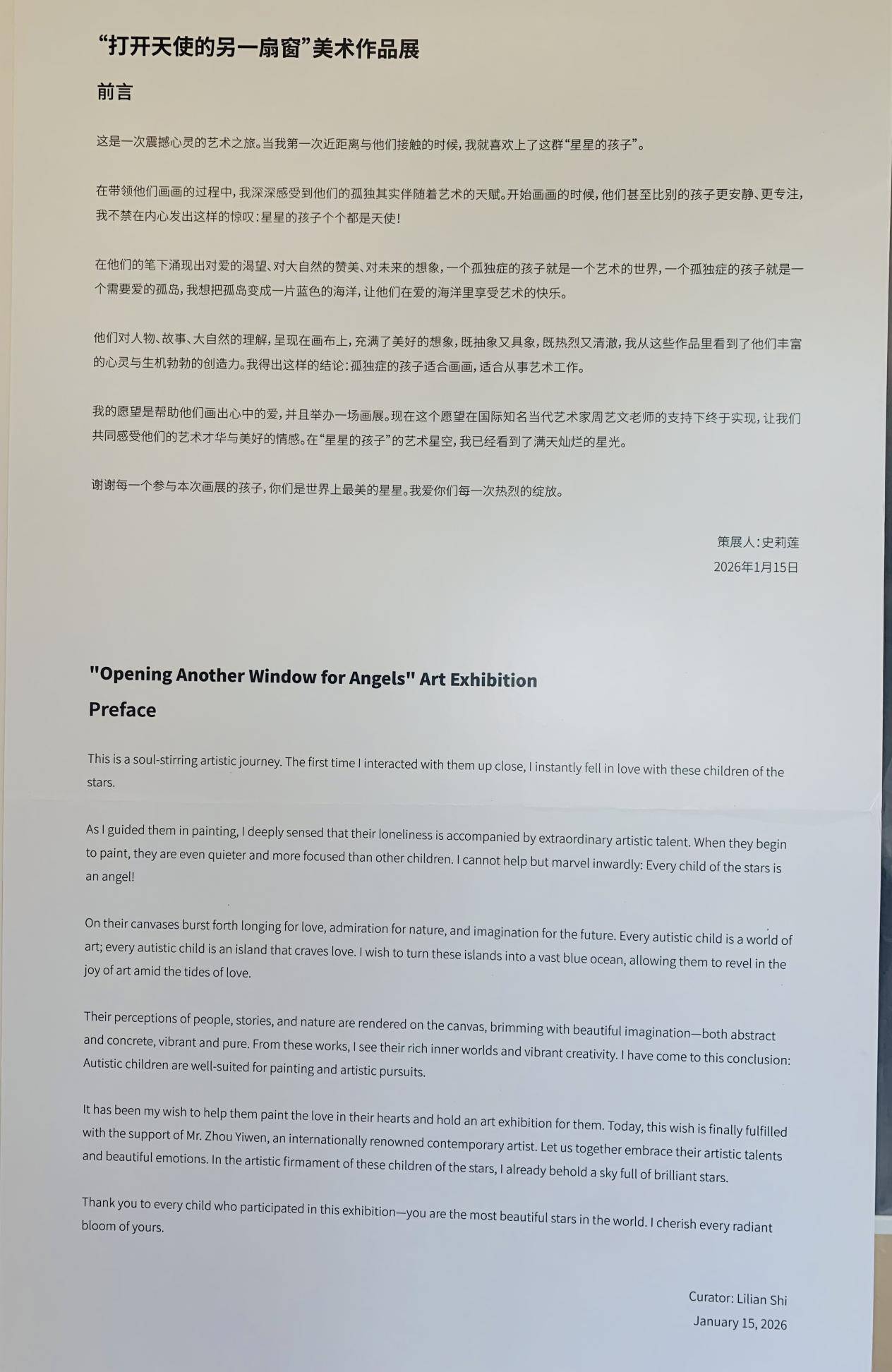 2026年1月18日,“打开天使的另一扇窗”美术作品展在深圳福田区少儿美术馆开幕,深圳外国语学校国际部中学生史莉莲发起、辅导孩子创作,并策划这场公益展览,共展出深圳心连星早期教育训练有限公司的自闭症孩子的美术作品50多幅,引起粤港澳大湾区的众多家长与观众的强烈好评。